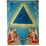 This extremely rare 19th century Mexican folk retablo, attributed to Agustin Barajas, aka 'The Skimpy Painter', represents the All Seeing Eye of God. Oil on tin. Circa 1880.
