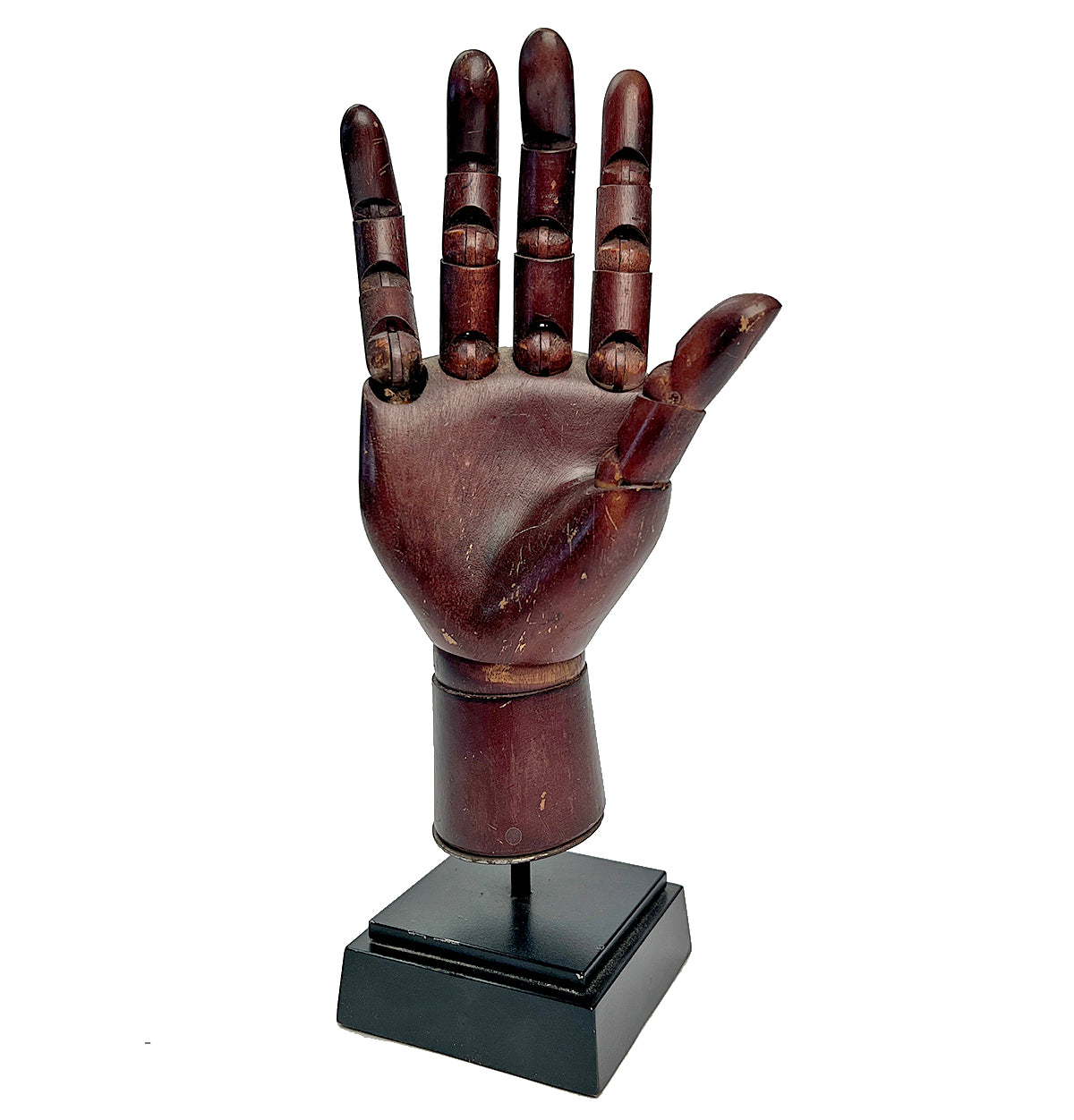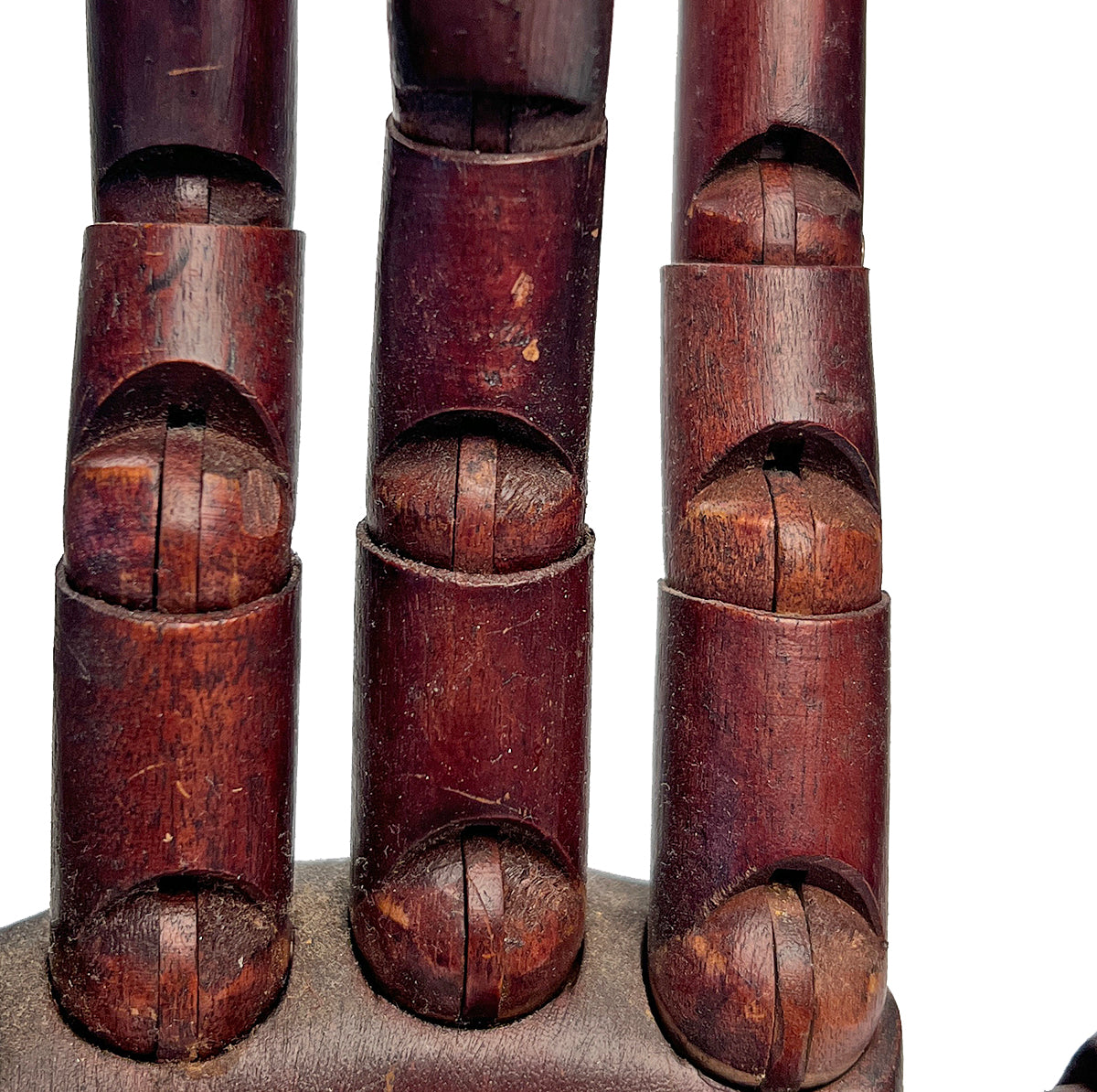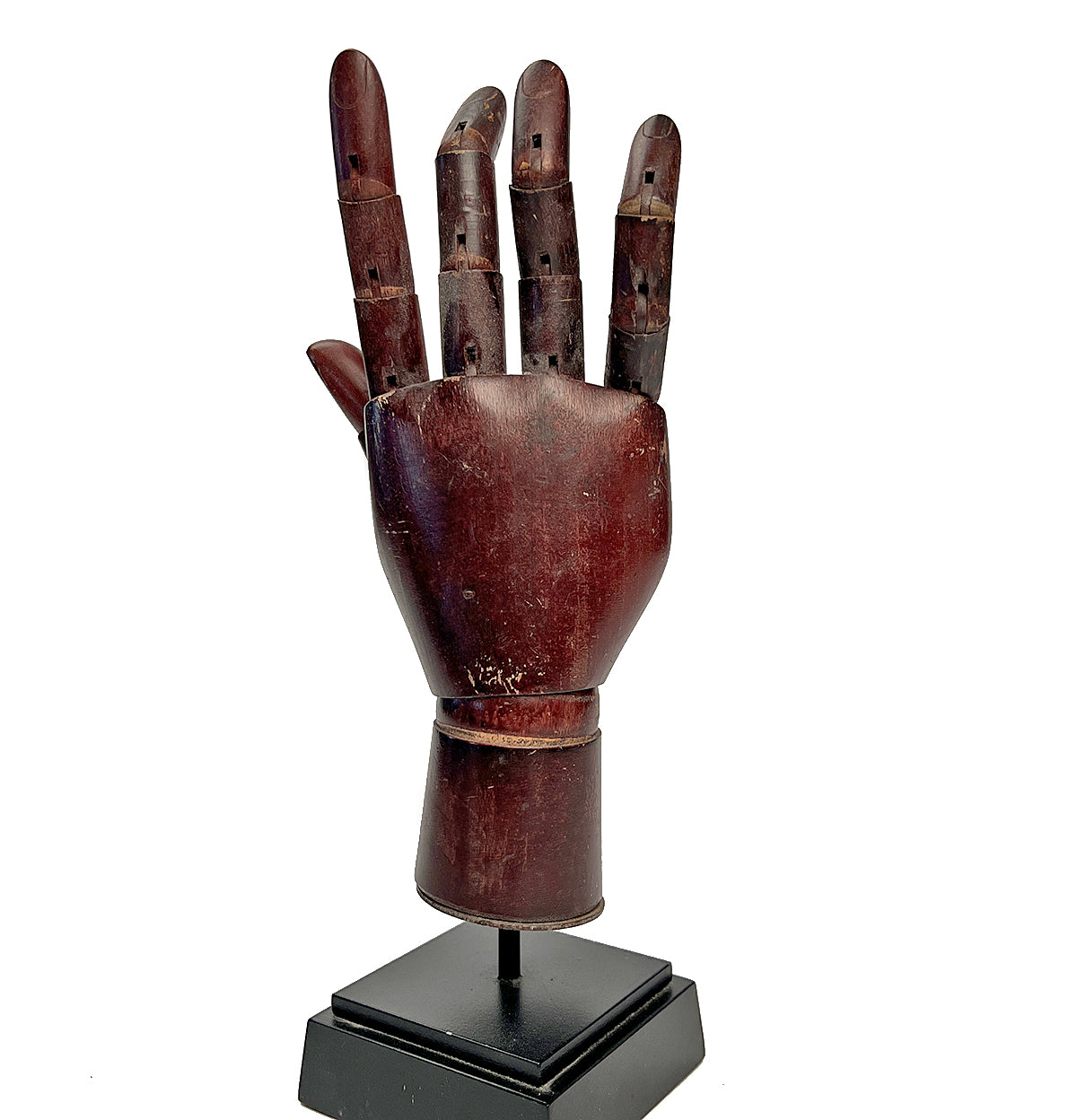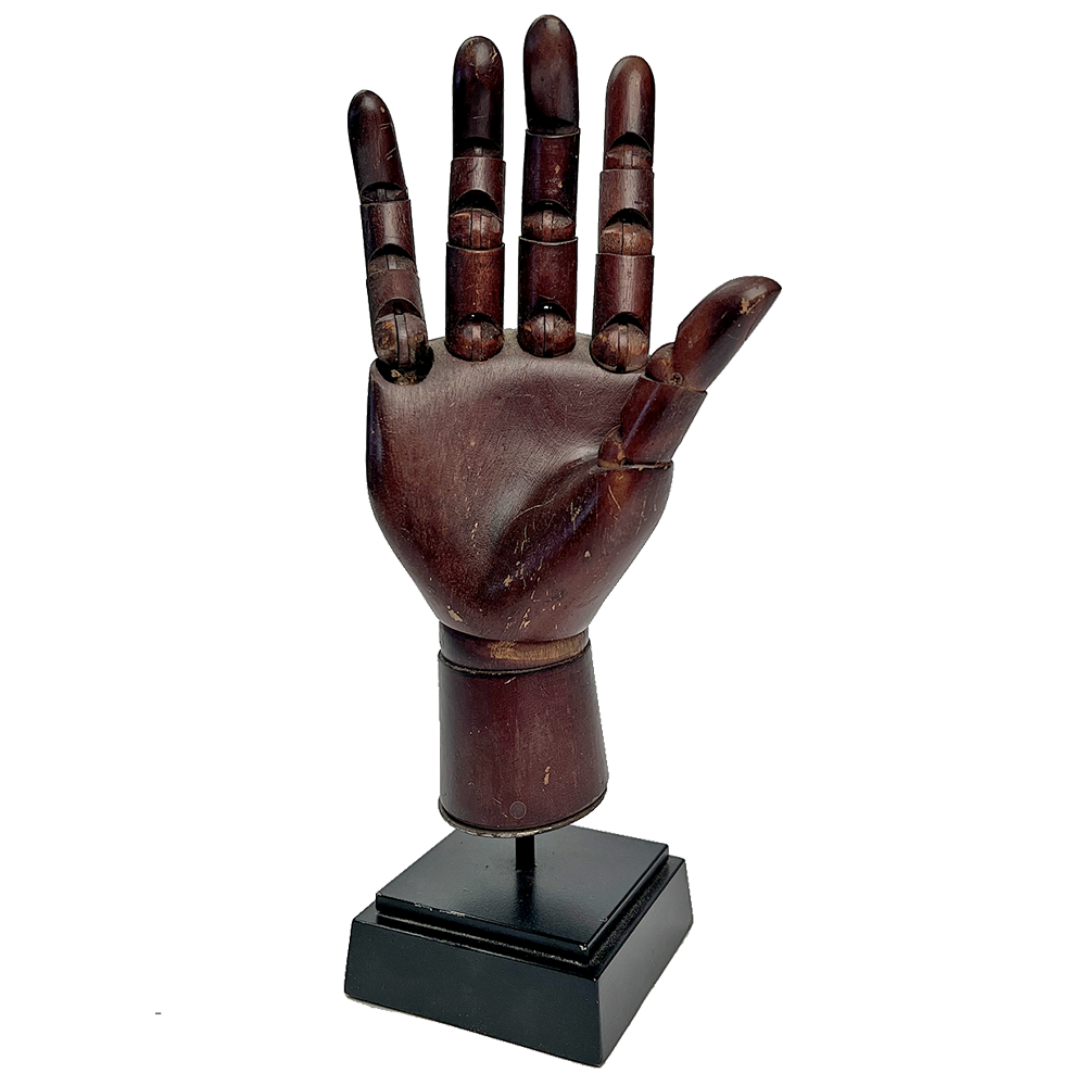 Early 20th century artist's hand model with articulated joints connecting each knuckle. Hand carved walnut. Circa 1920. Raised on a high quality custom made stand.