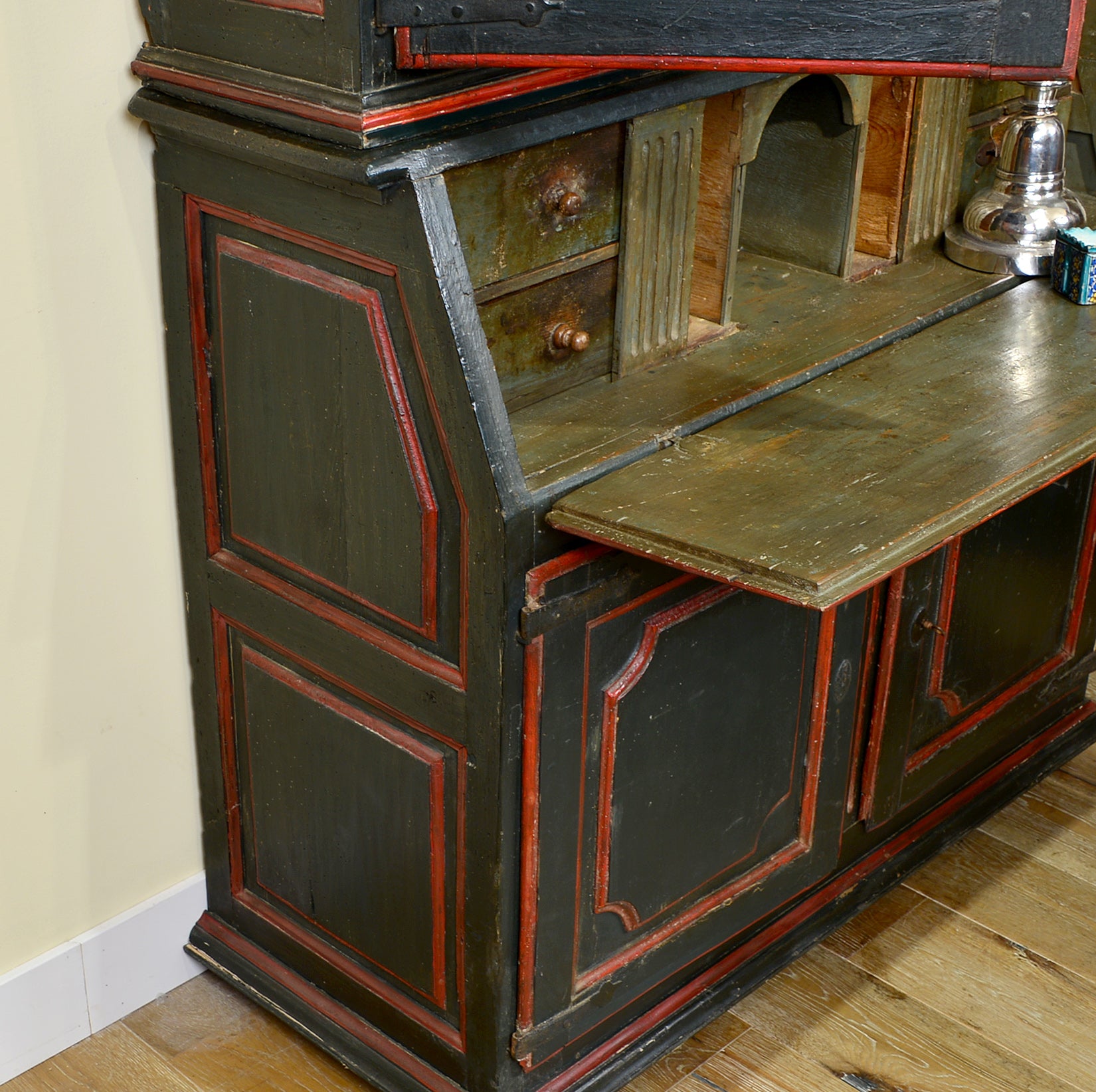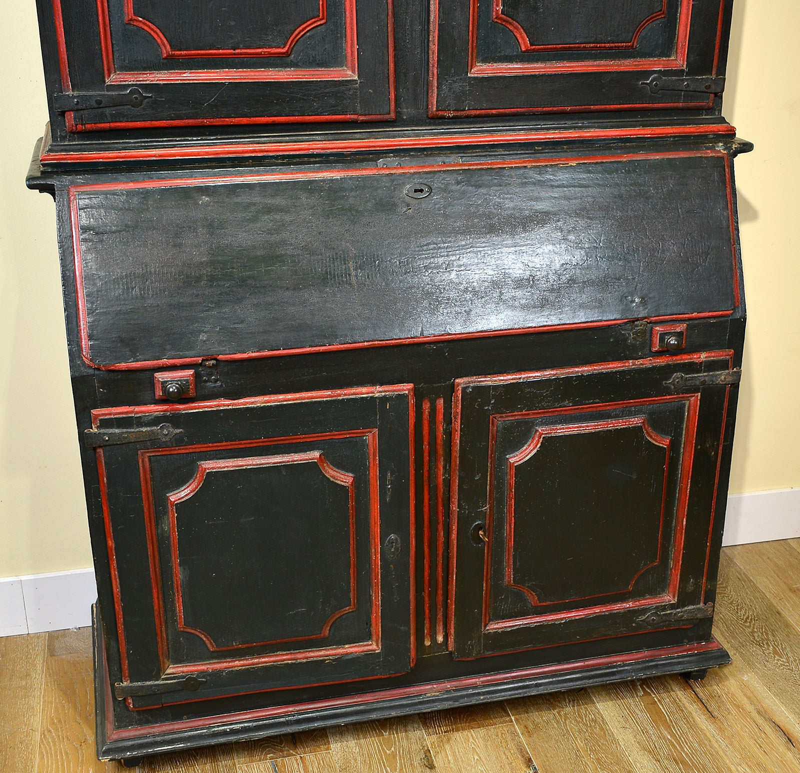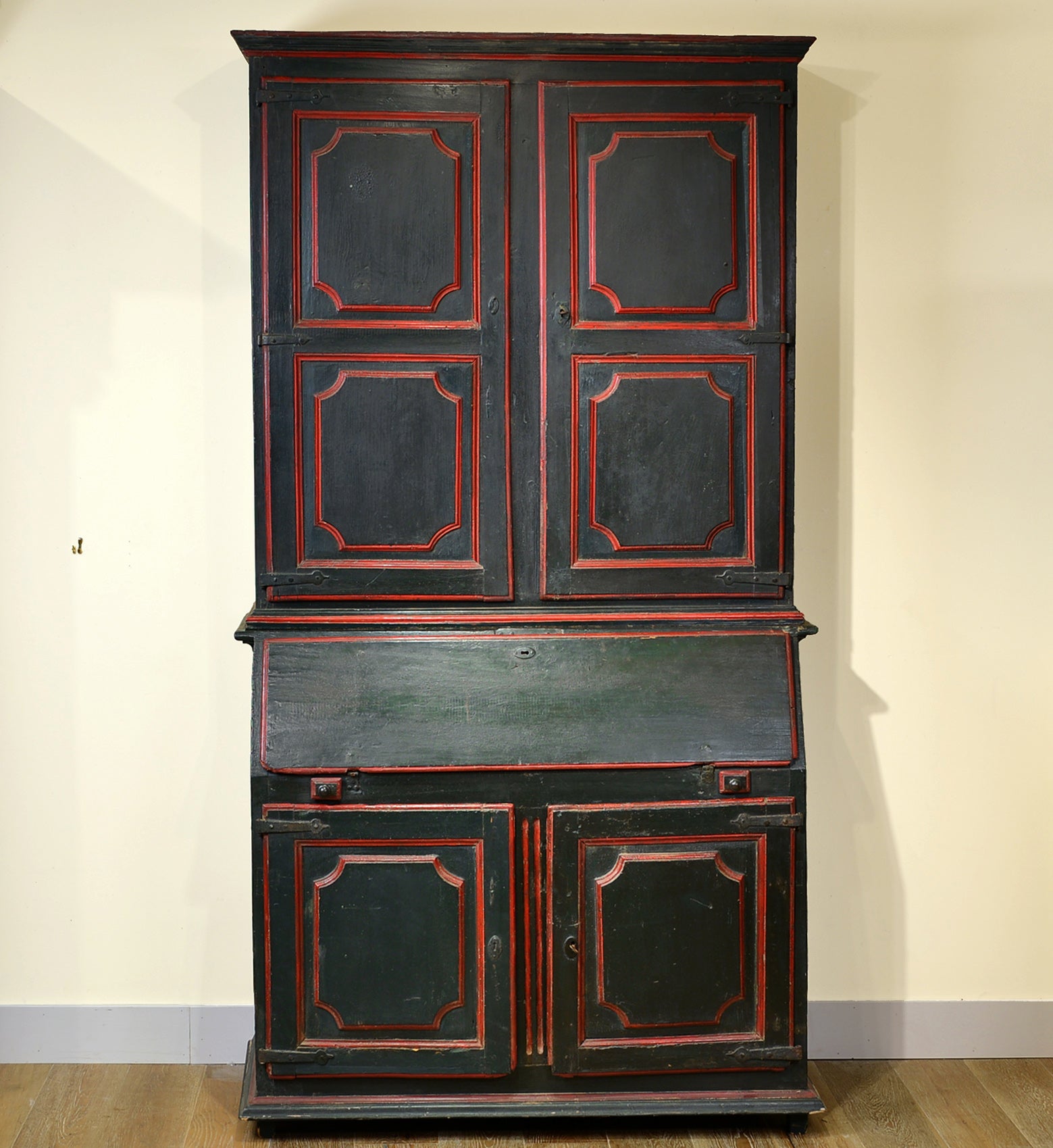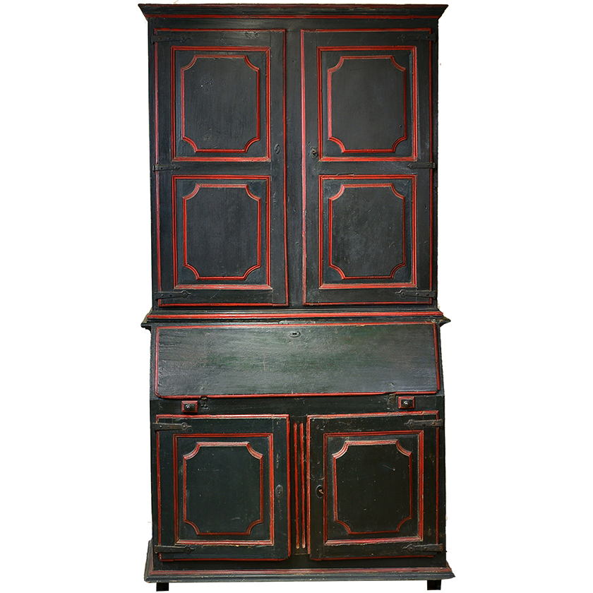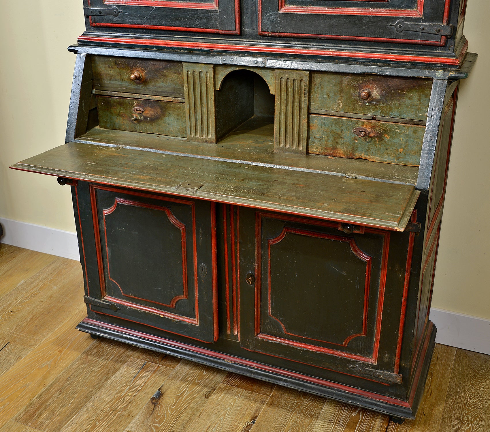 Early 18th century polychrome painted secretary cabinet with deeply patinated olive green and red exterior. Two lower moulded doors are surmounted by a hinged drop front concealing a fitted interior with four drawers, two hidden cubbies and a writing surface. The upper case features a moulded cornice over matching ogee paneled doors. The iron hardware is original and the locks are in working order. Raised on short square legs. Flanders / Spanish Netherlands. Circa 1700.