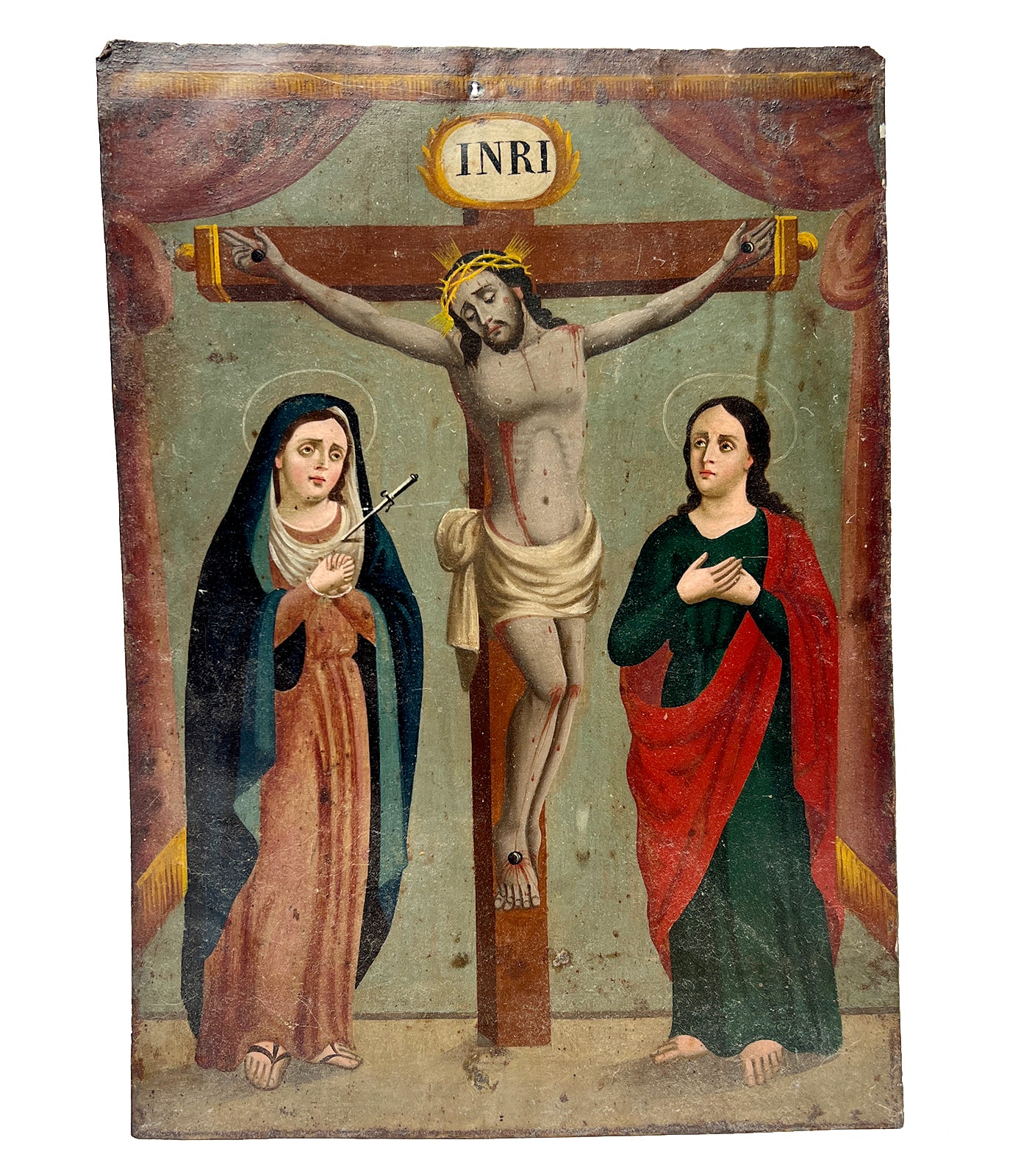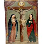 This 19th century folk retablo from Mexico represents El Calvario. Jesus, flanked by Santa Maria and San Juan Evangelista, is depicted at Calvary, the biblical site outside of Jerusalem, where he was crucified.