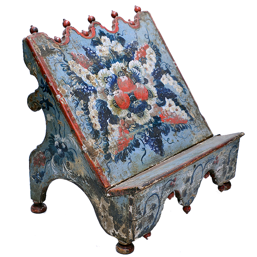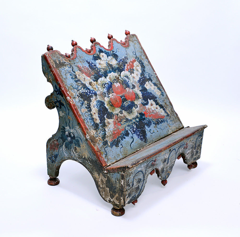 18th century Spanish colonial polychrome painted book stand with hand painted foliate motifs, finials and scalloped apron raised on ball feet.