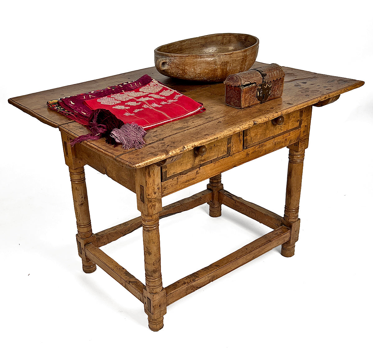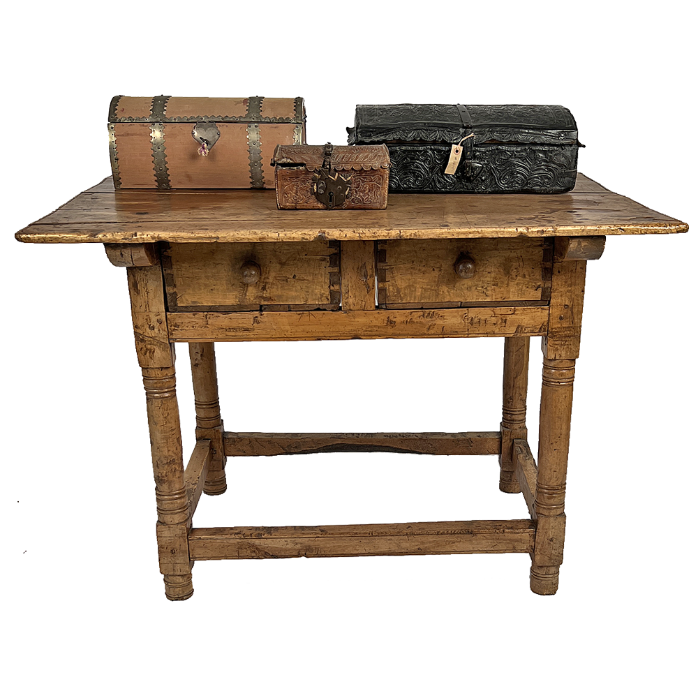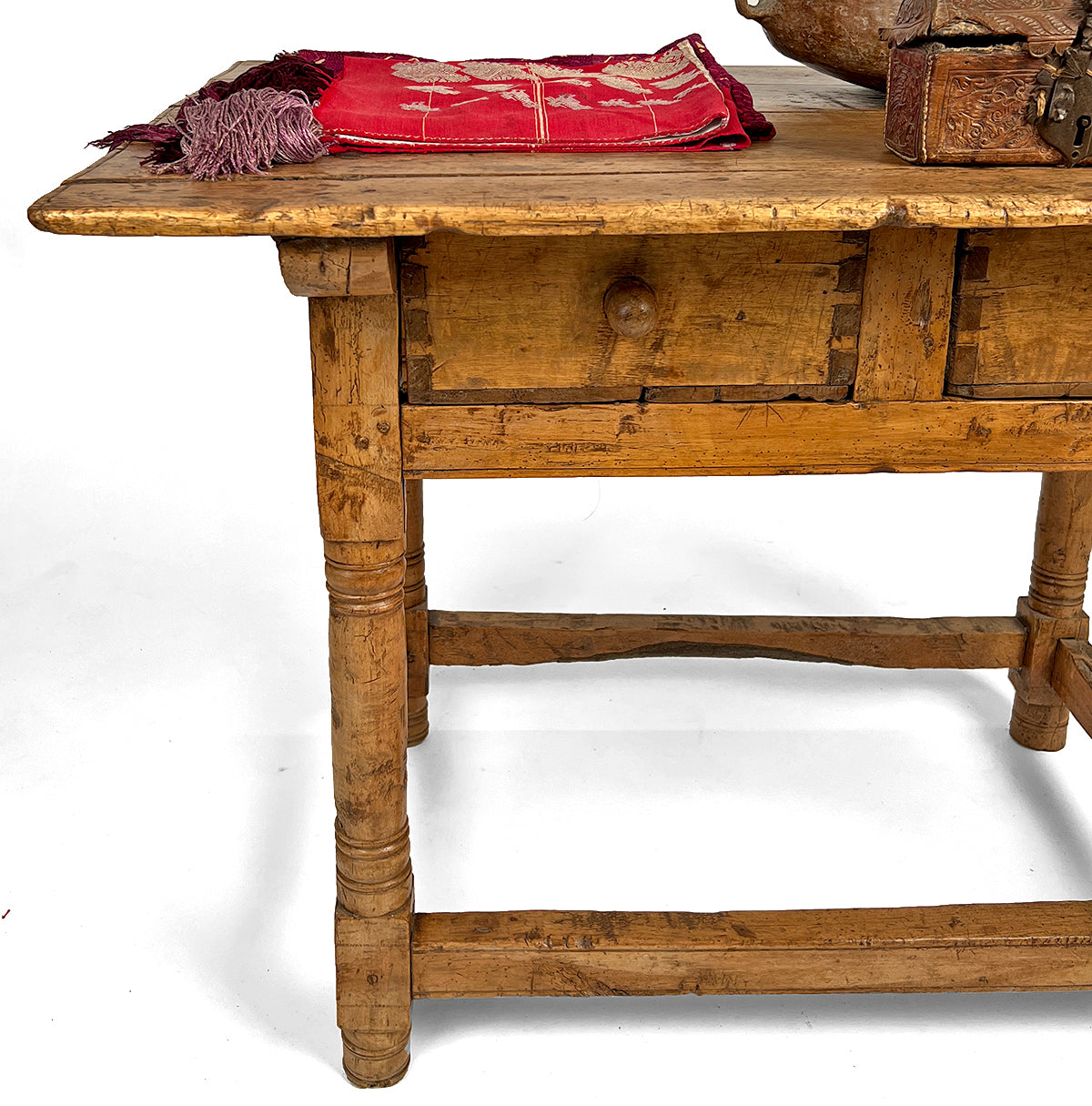 18th century Spanish colonial period white cedar center table with two large dovetailed drawers raised on turned legs connected by a stretcher base. Columbia. Circa 1750 - 1800.