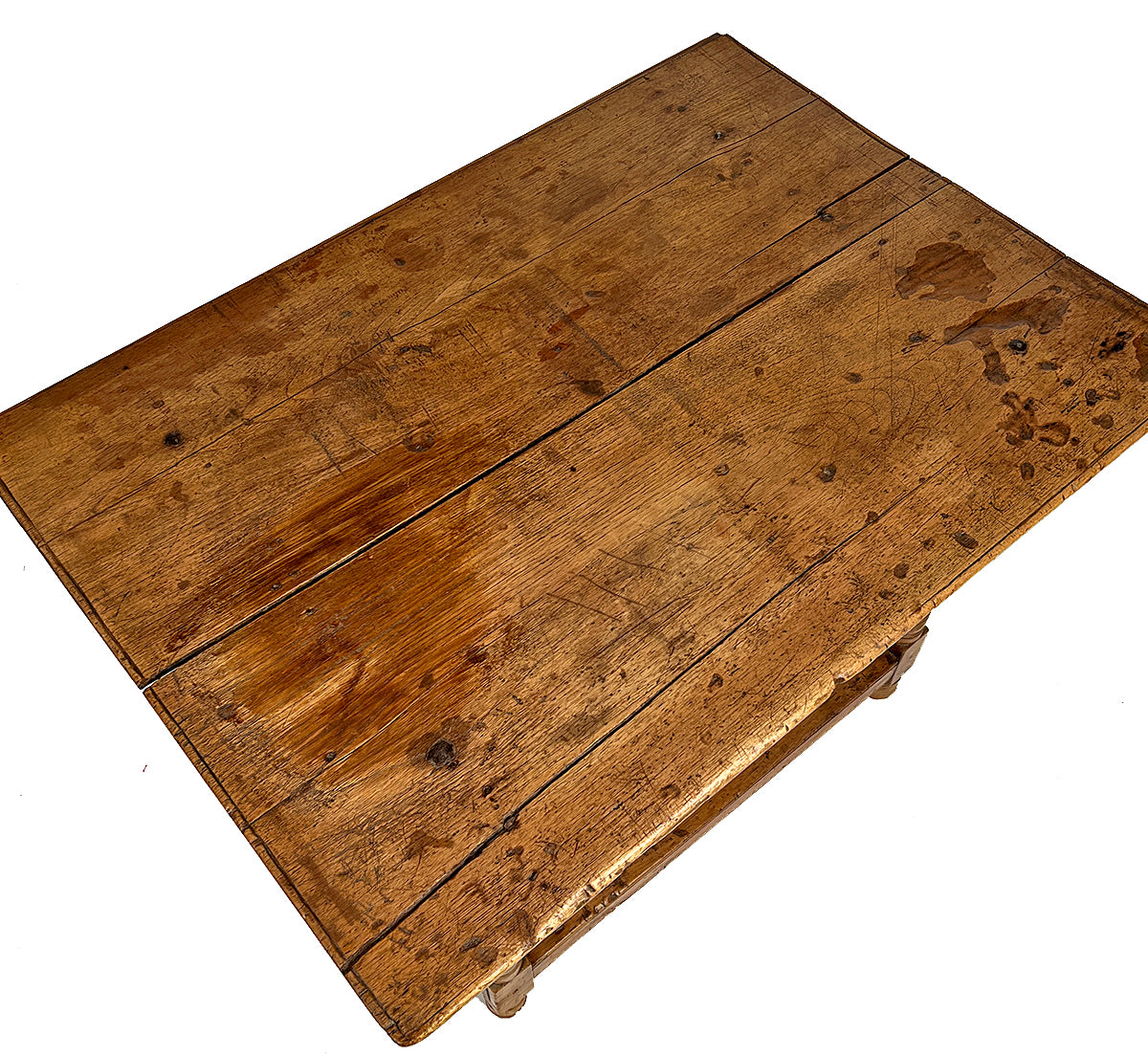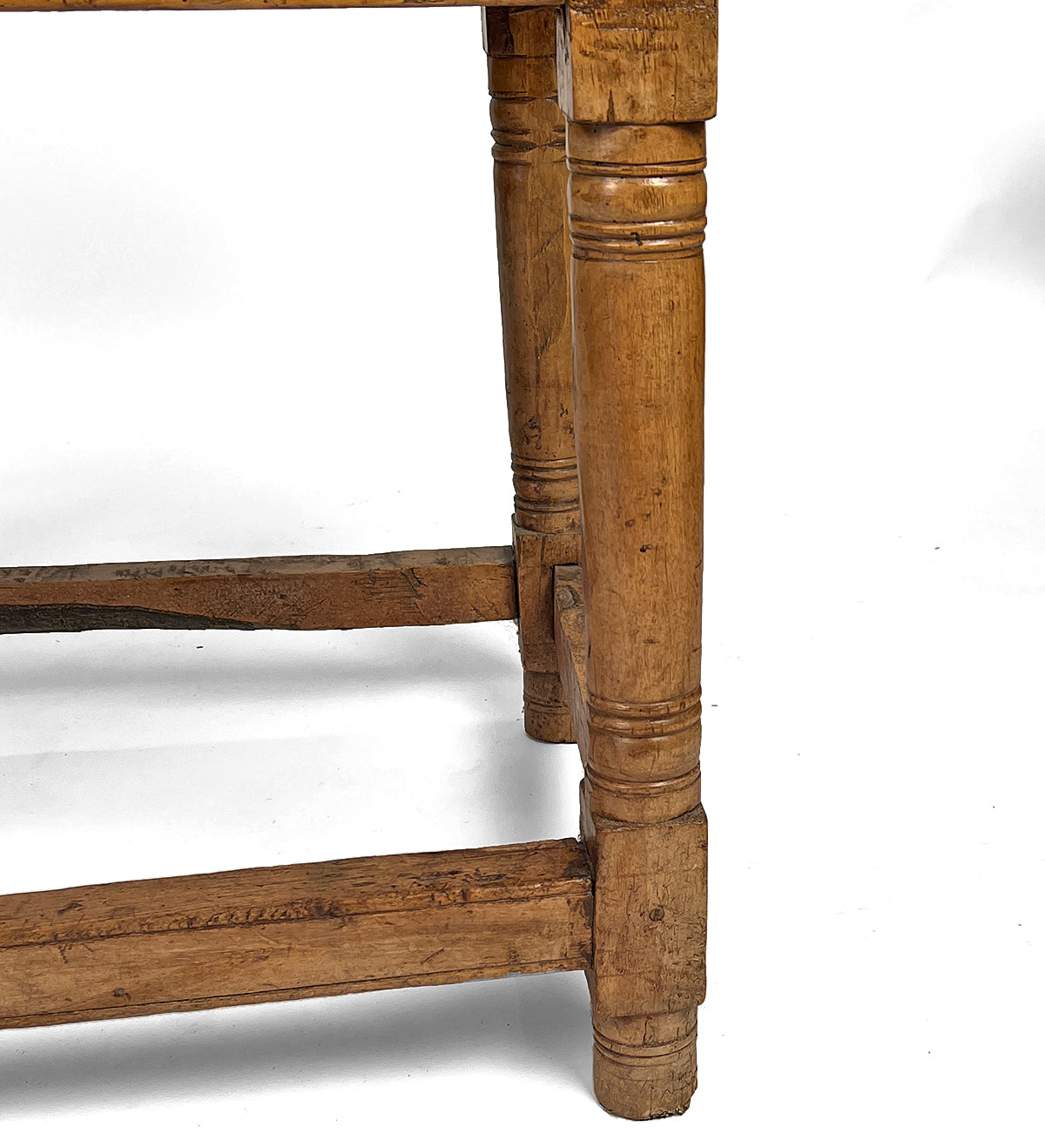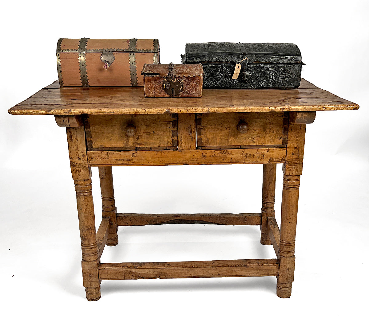 18th century Spanish colonial period white cedar center table with two large dovetailed drawers raised on turned legs connected by a stretcher base. Columbia. Circa 1750 - 1800.