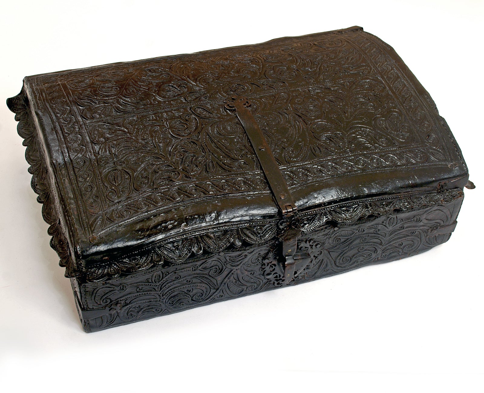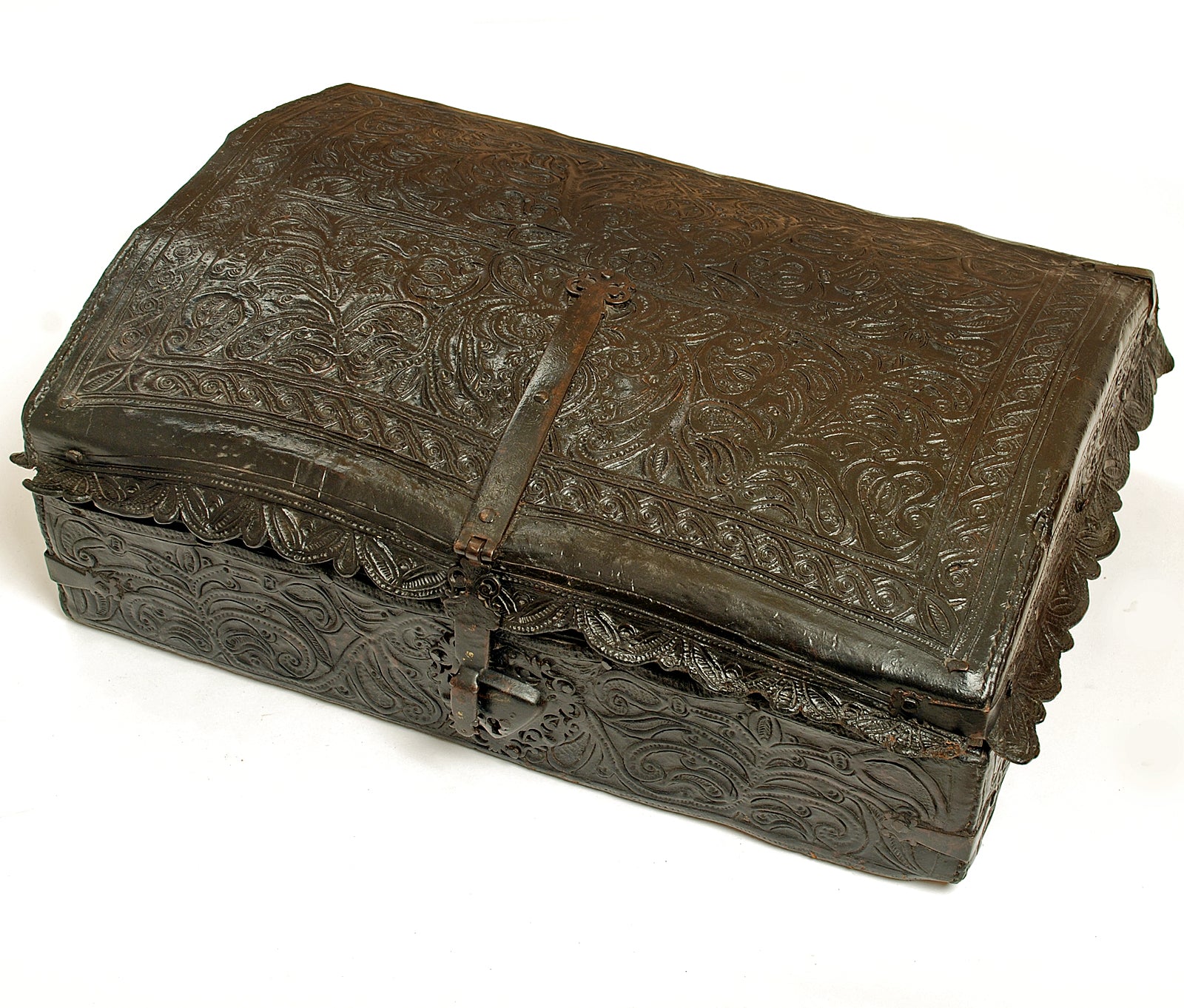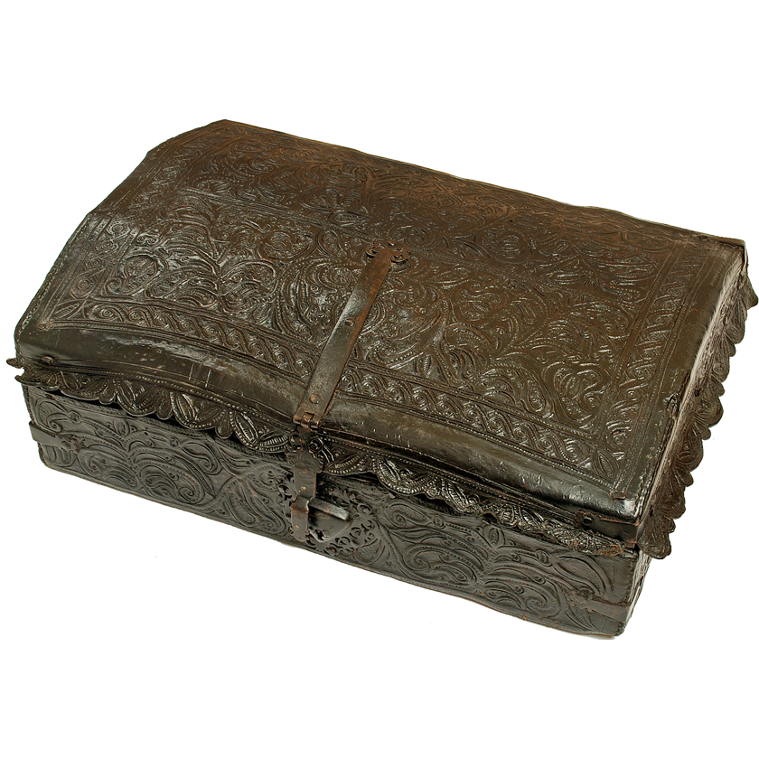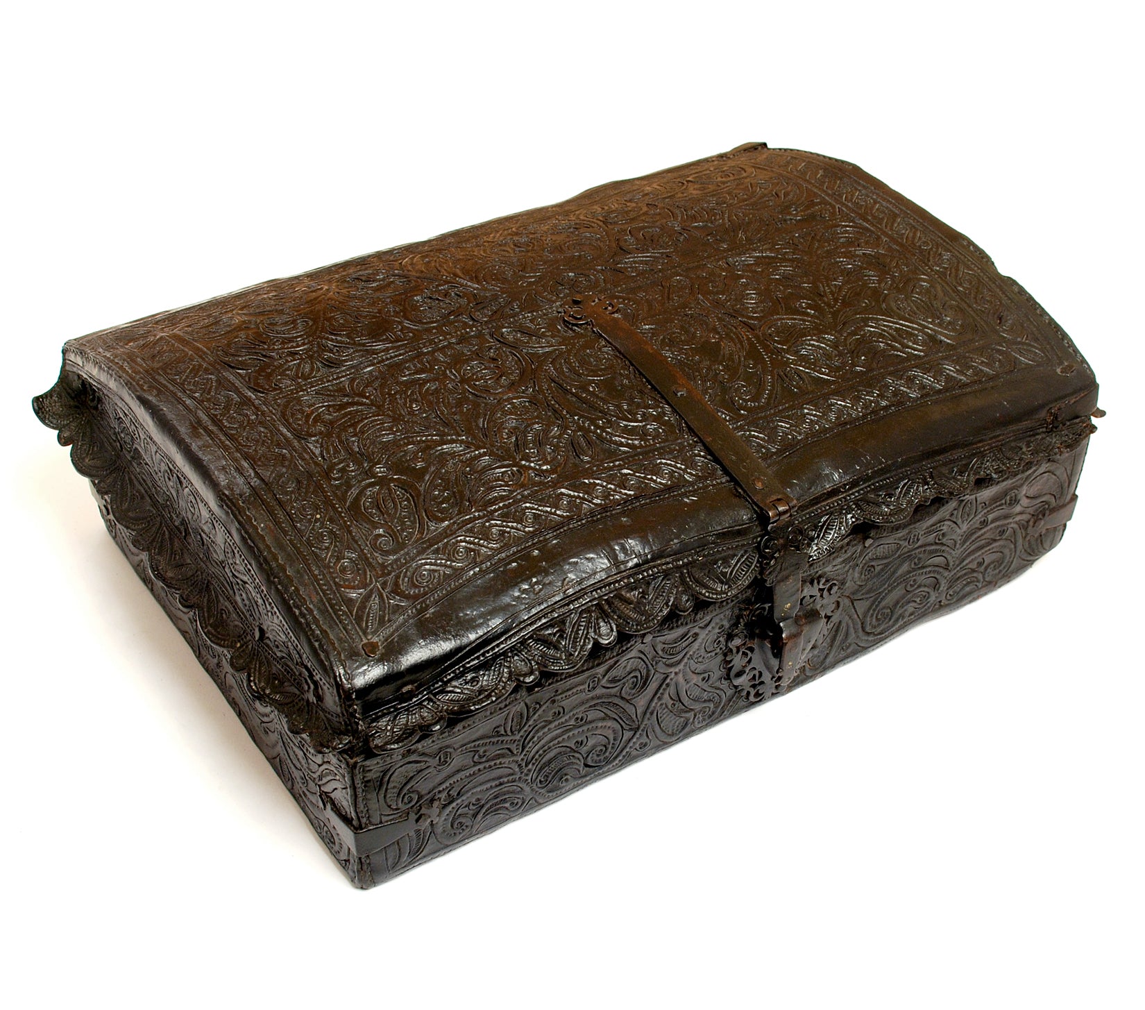 Early 18th century Spanish colonial hand tooled leather petaca (document box) with cedar interior and domed top. Peru, circa 1700 - 1750.
