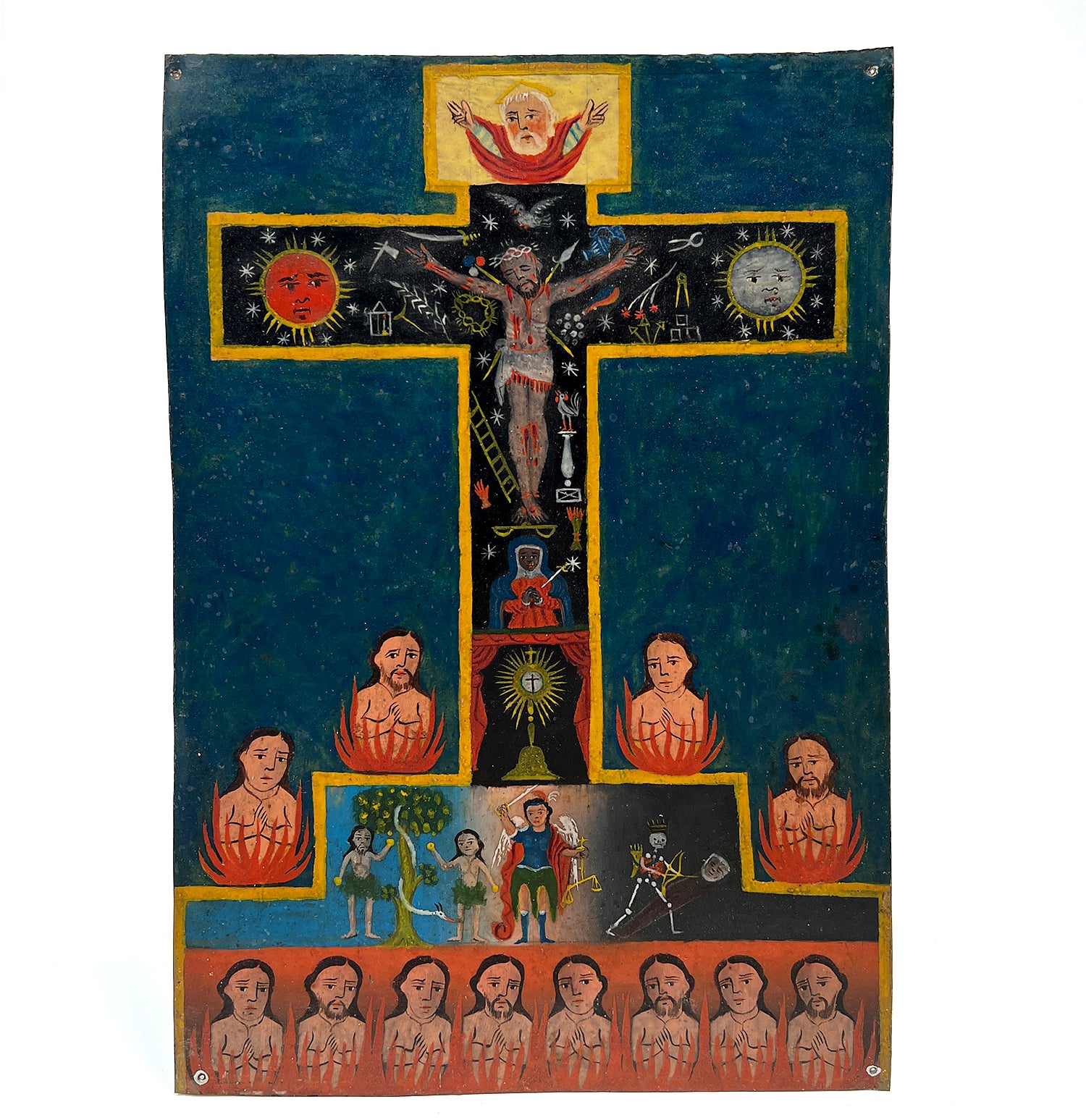 A 19th century Mexican folk retablo, La Cruz de Animas (Cross of Souls) with twelve 'anima solas', departed ancestral souls awaiting judgement in the flames of purgatory.