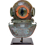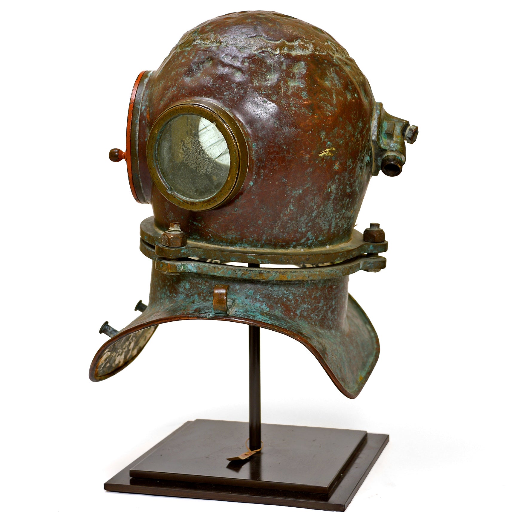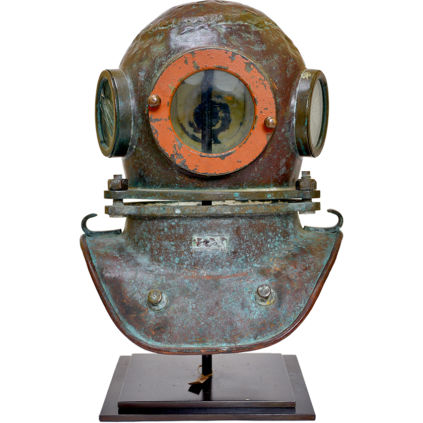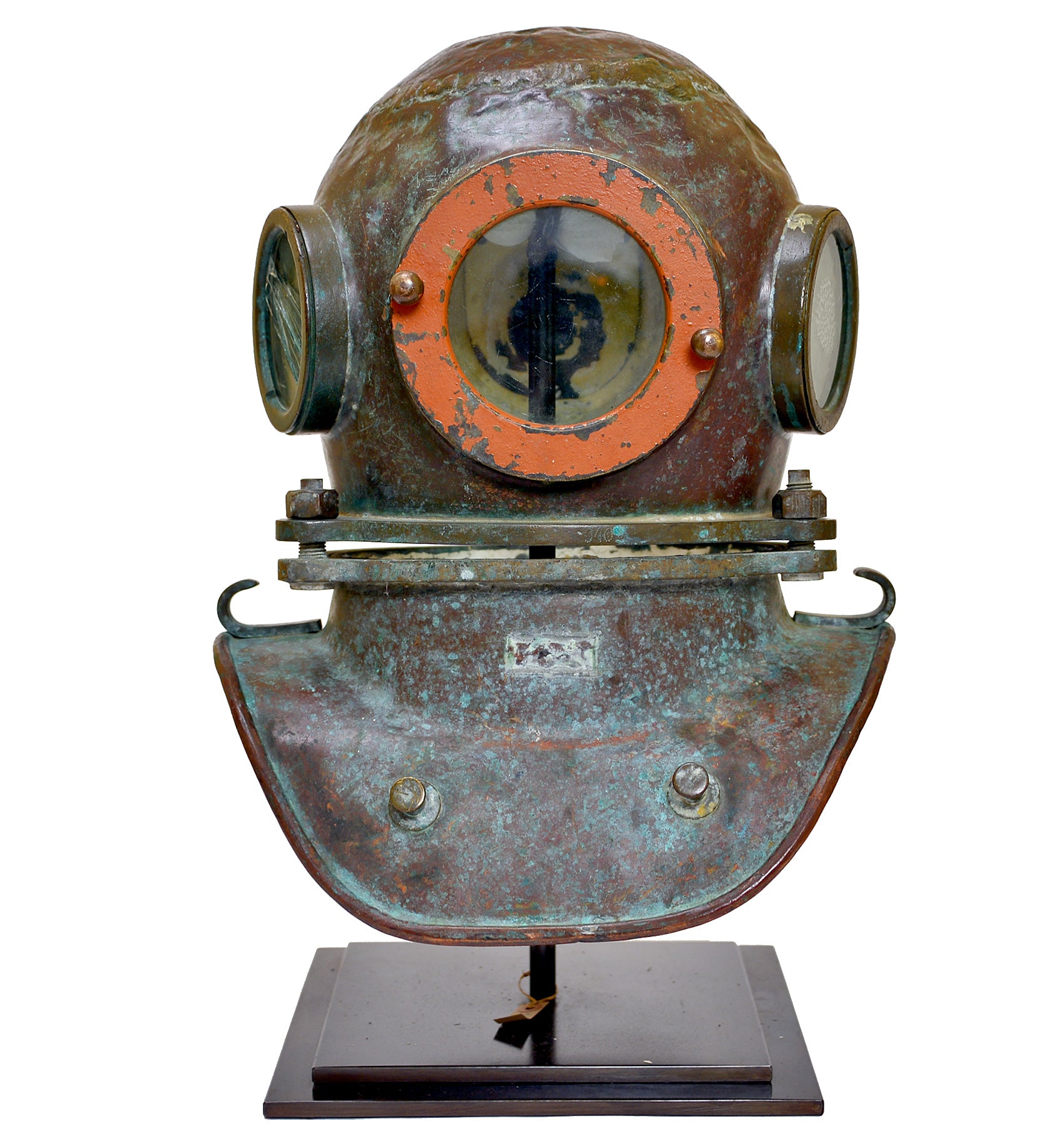 Early 20th century diver's helmet with original orange paint and verdigris patina. Raised on a high quality custom made display stand.