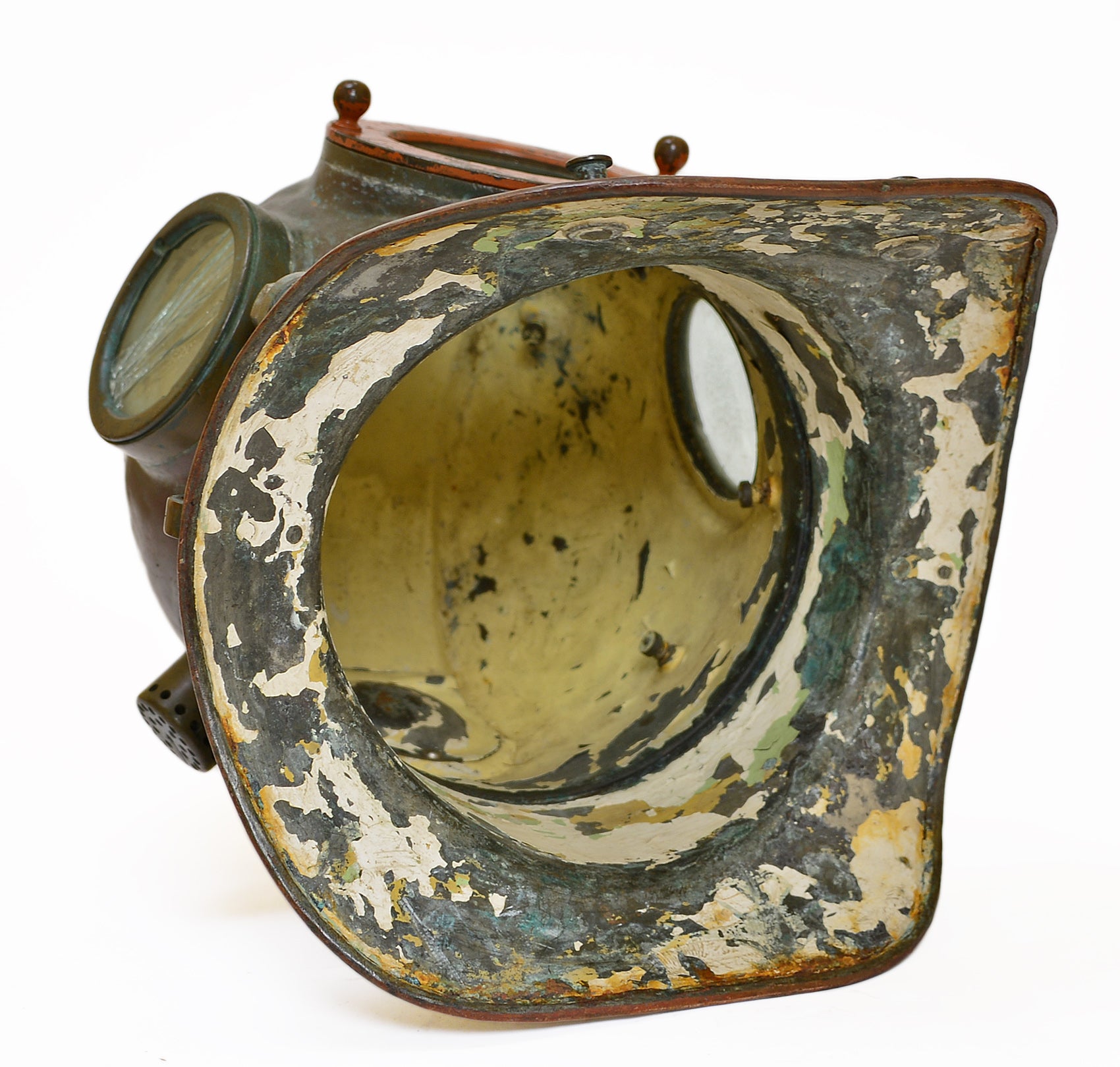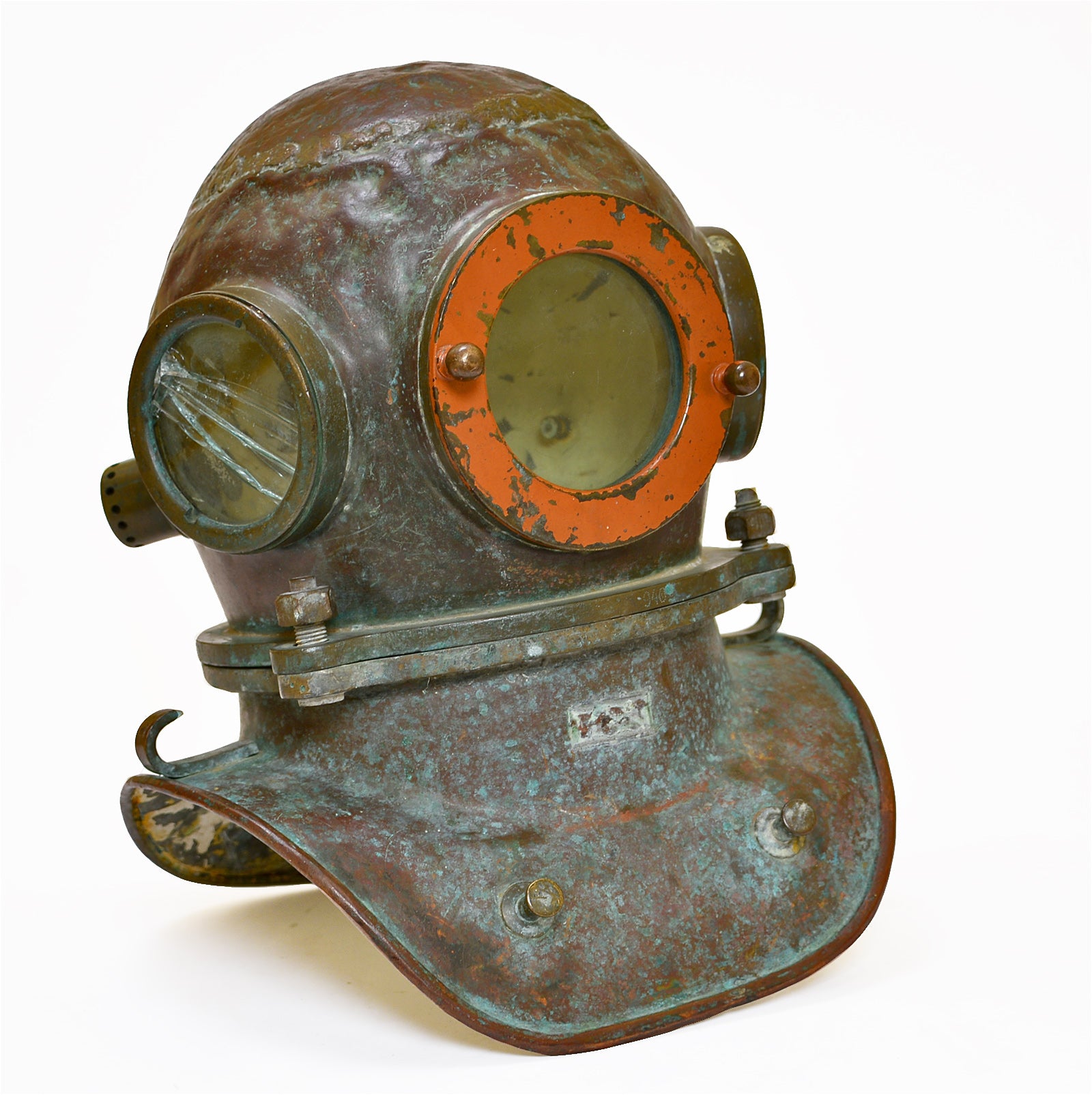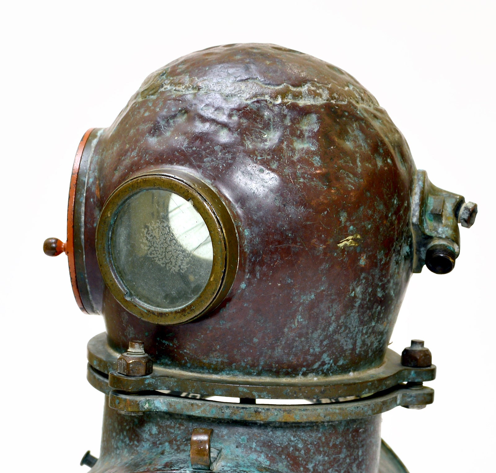 Early 20th century diver's helmet with original orange paint and verdigris patina. Raised on a high quality custom made display stand.