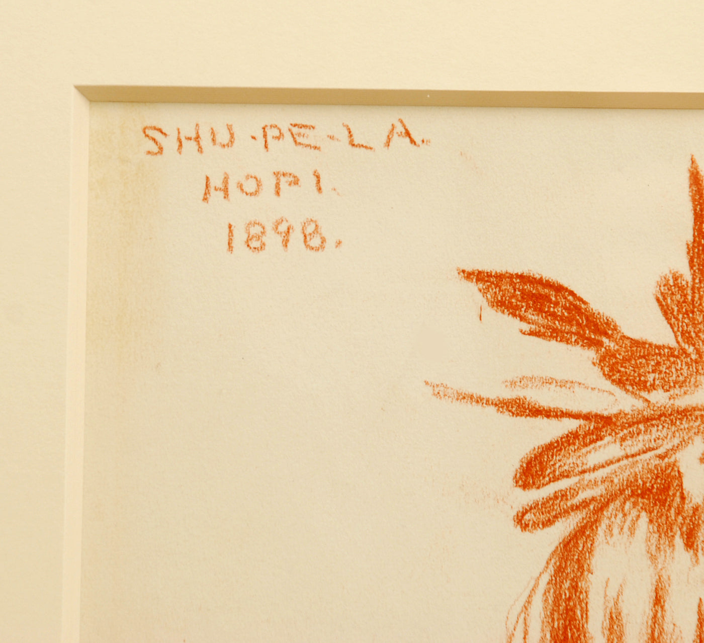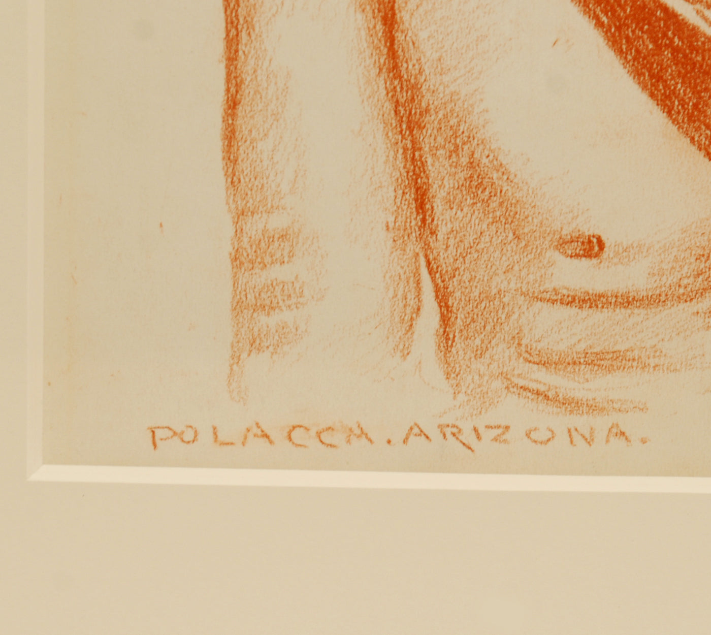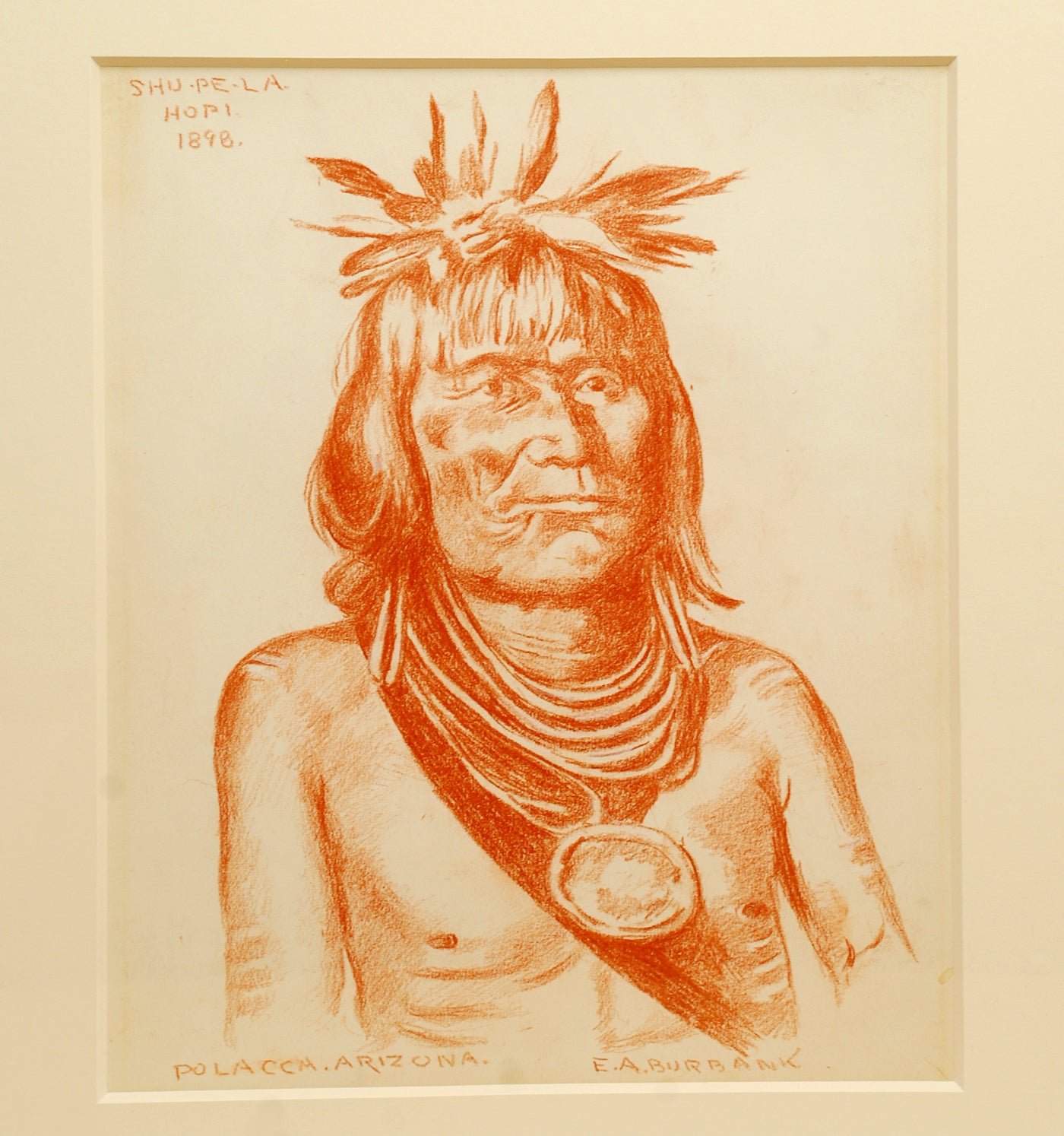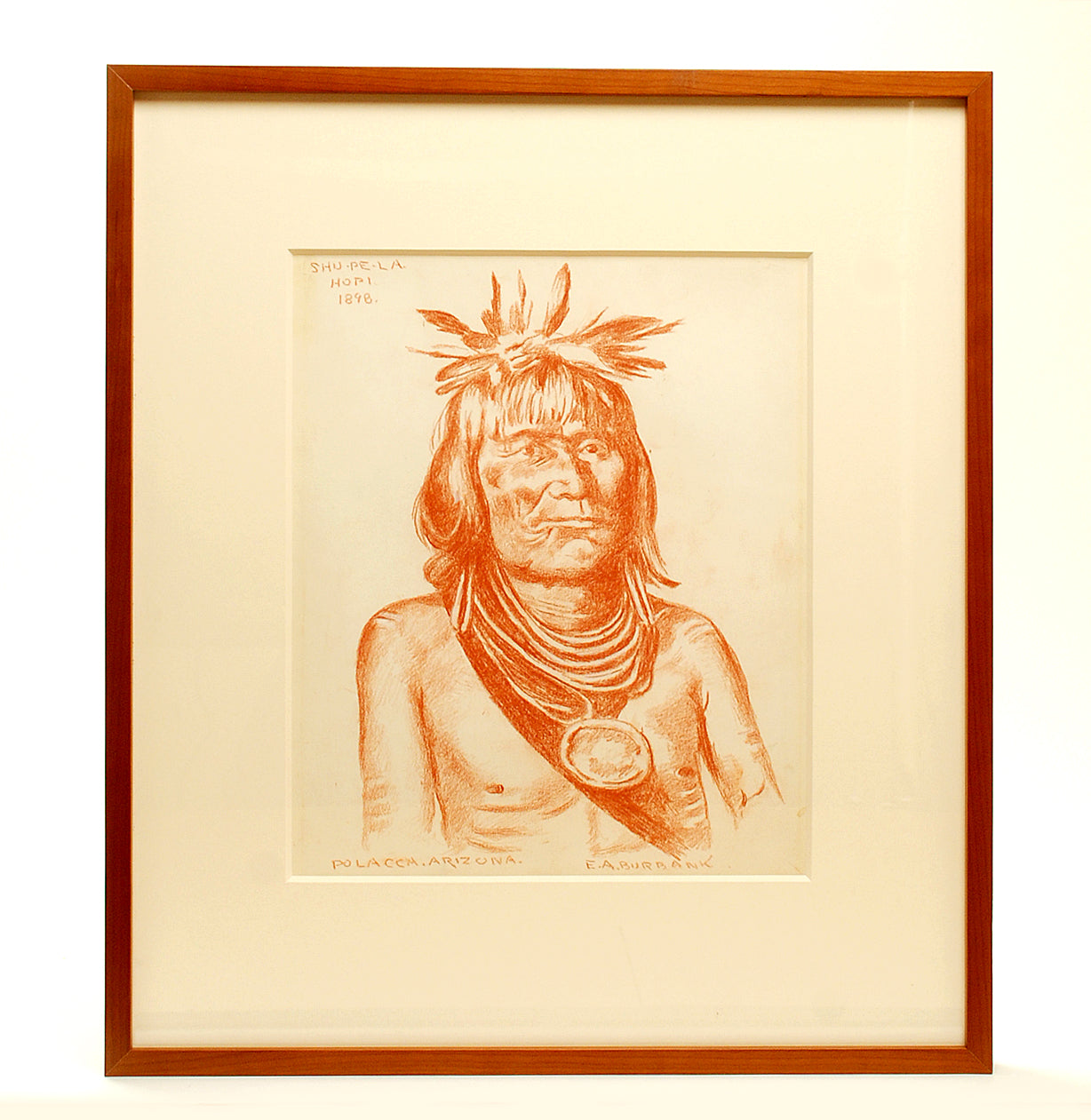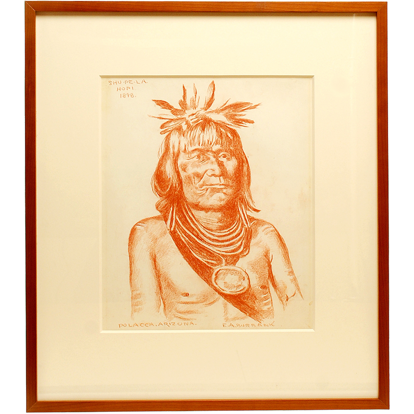 Rare original Conte crayon on paper of American Indian by well listed Taos and Santa Fe school painter Elbridge Ayer Burbank (1858-1949). Signed (lower right) inscribed and dated 'Shu-Pe-La. / Hopi. / 1898.' (upper left) and 'Polacca.Arizona ' (lower left).