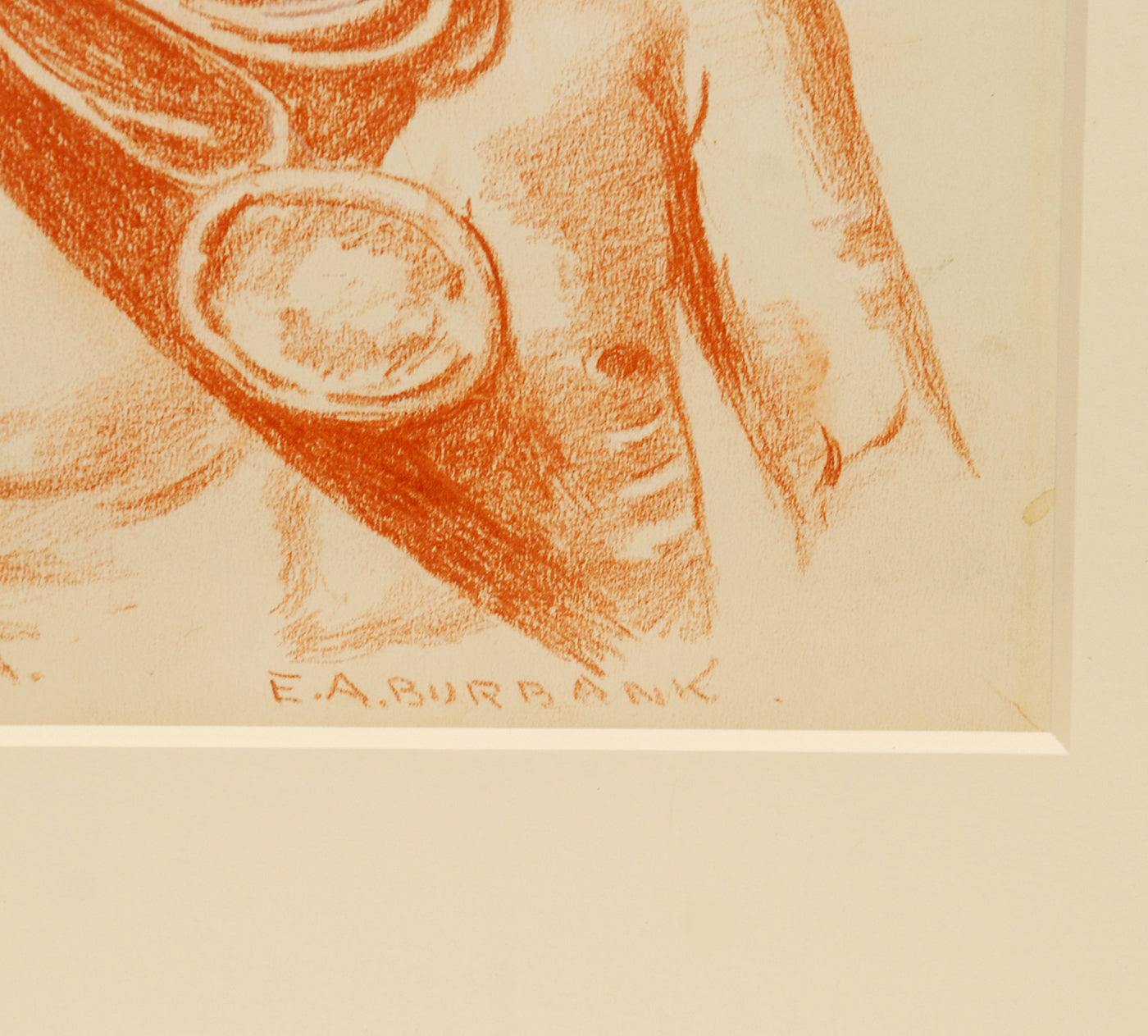 On this assignment, Burbank traveled west again, and in Ganado, Arizona, met trading post owner Lorenzo Hubbell who became a life-long friend. During his western trips, he painted over 2000 portraits of Indians from 125 tribes: 1000 were oil portraits and 1200 were with Conte Crayon. He was one of the few artists to use crayon as a medium for portraits.