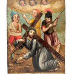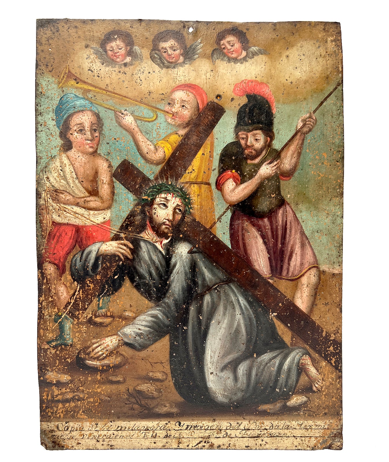 A fine and rare 19th century Mexican folk retablo - El Senor de los Trabajos, with Praetorian soldiers and Christ under the weight of the unwieldy cross.. Circa 1850.