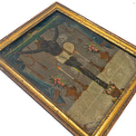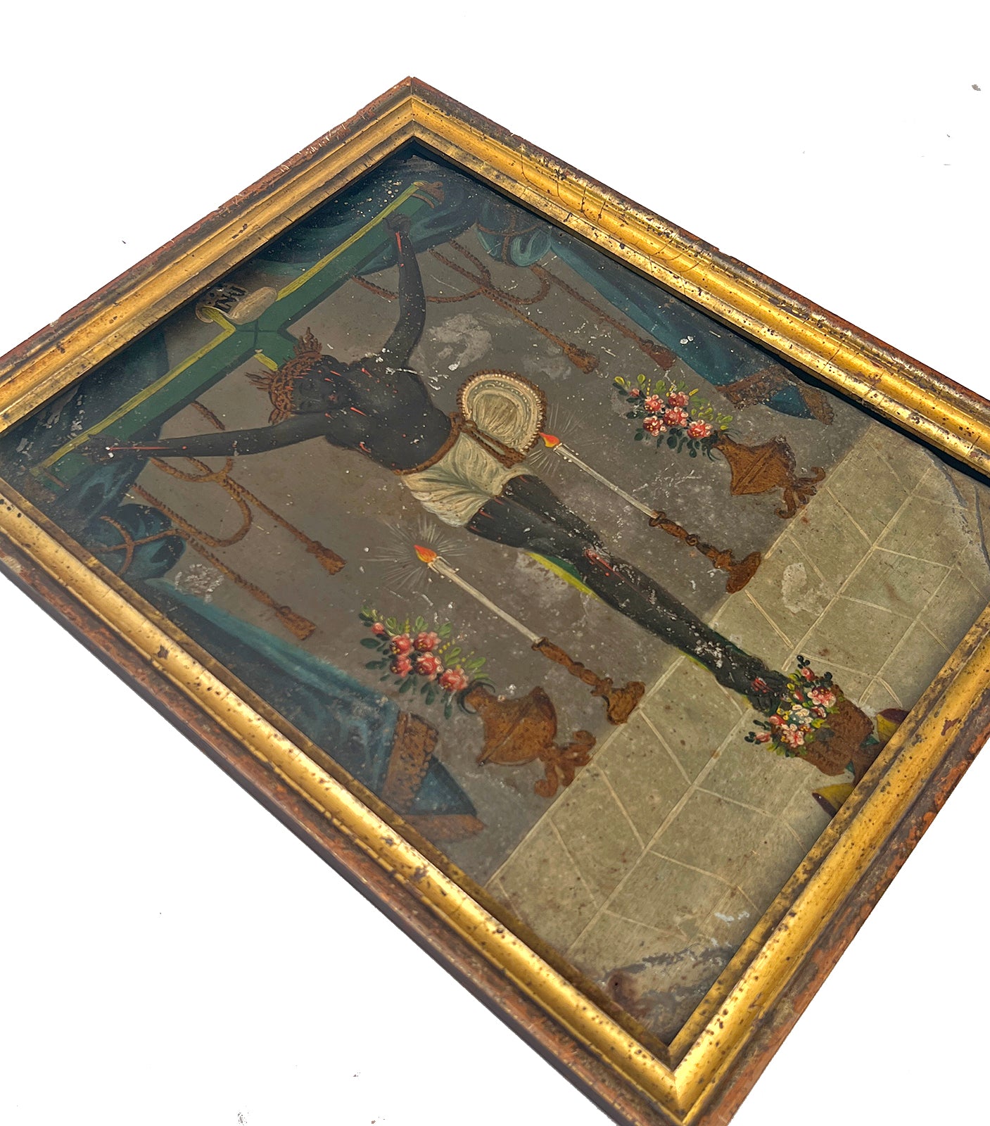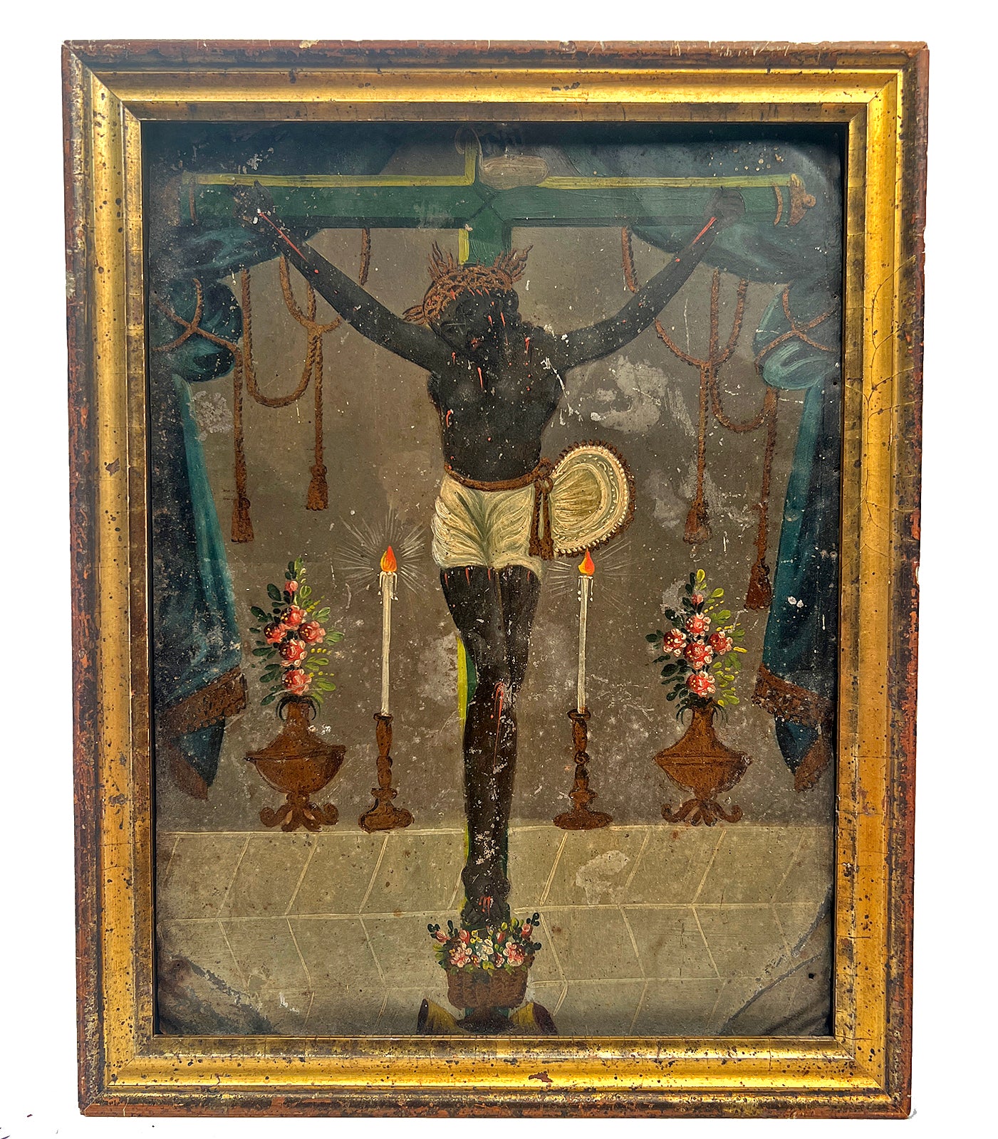 A very rare 19th century Mexican folk retablo, El Senor de Esquipulas, also known as 'The Black Christ'. El Sr. de Esquipulas refers to the Black Christ of Esquipulas, a darkened wooden image of Jesus Christ located in the Basilica of Esquipulas in Guatemala. It is a significant Catholic pilgrimage site, often called the "Miraculous Lord of Esquipulas," and is associated with numerous miracles and cures. The original crucifix was created in 1594, and the image has darkened over time, leading to legends that it darkened to convert local indigenous people. The figure is a powerful symbol of faith in both Guatemala and Mexico, and its dark color has been a point of theological and political discussion.