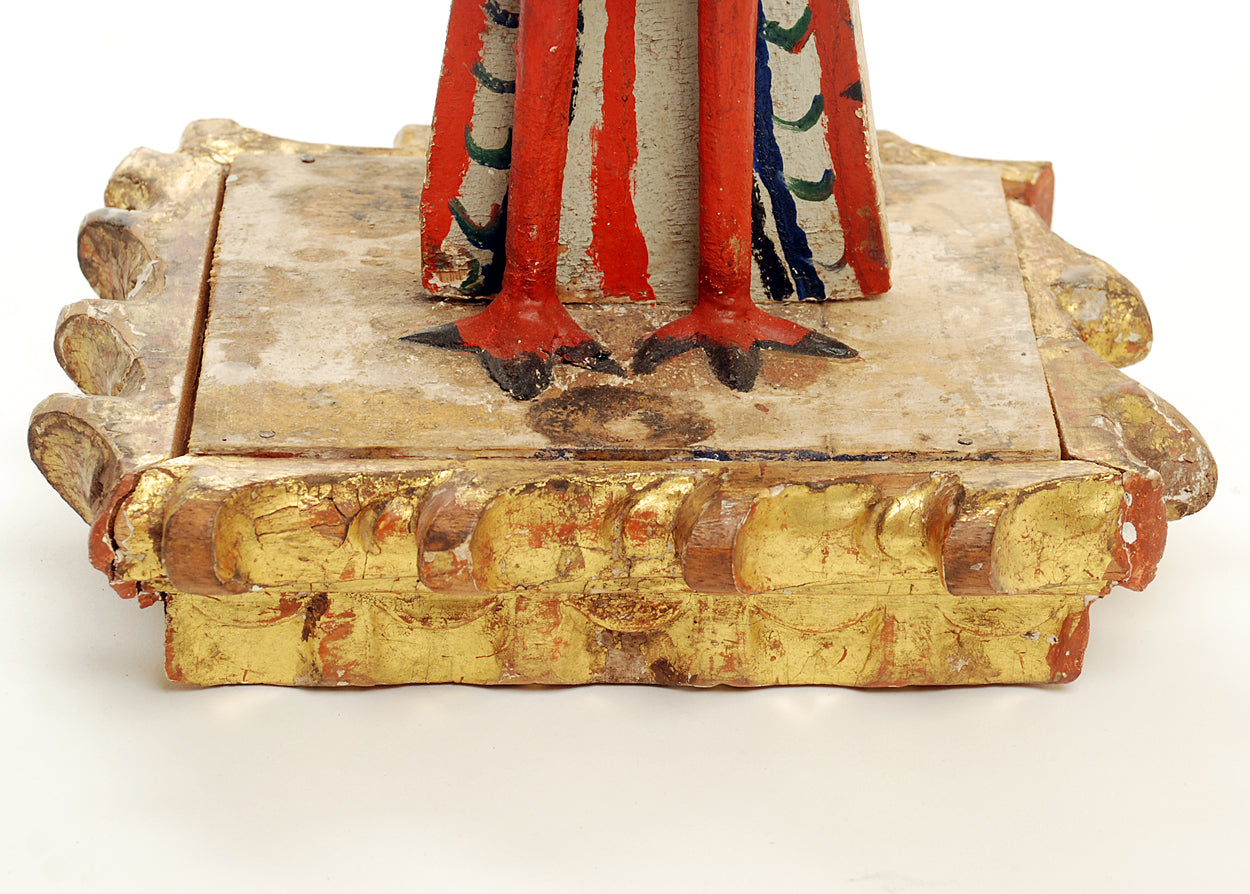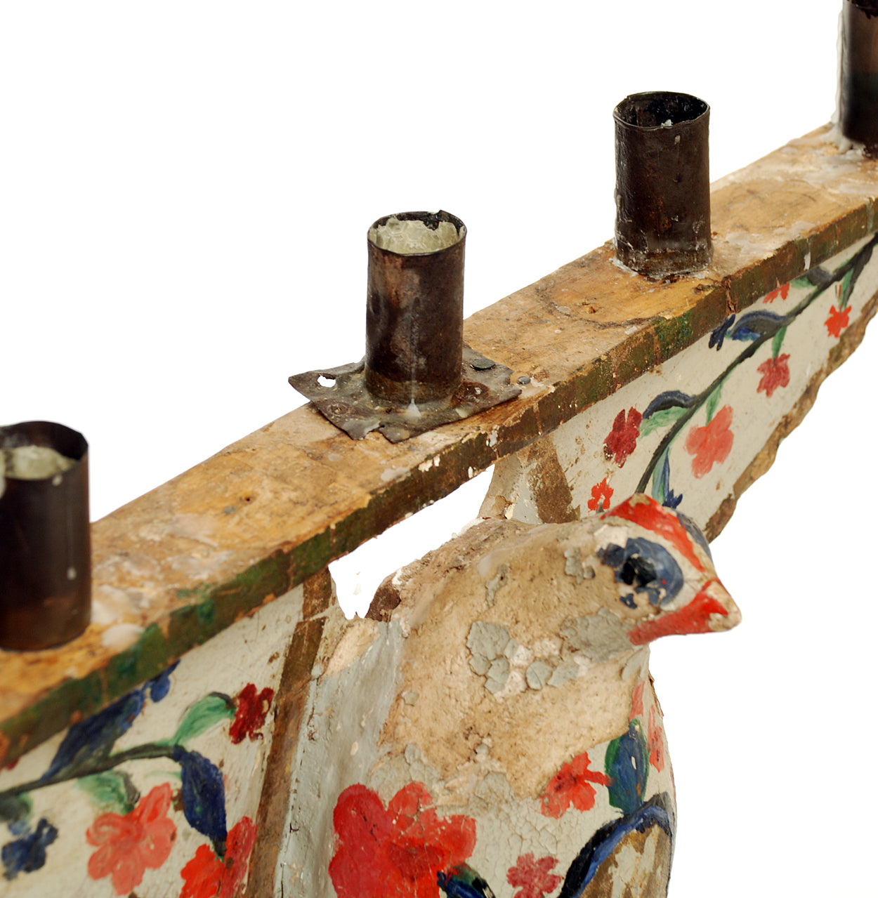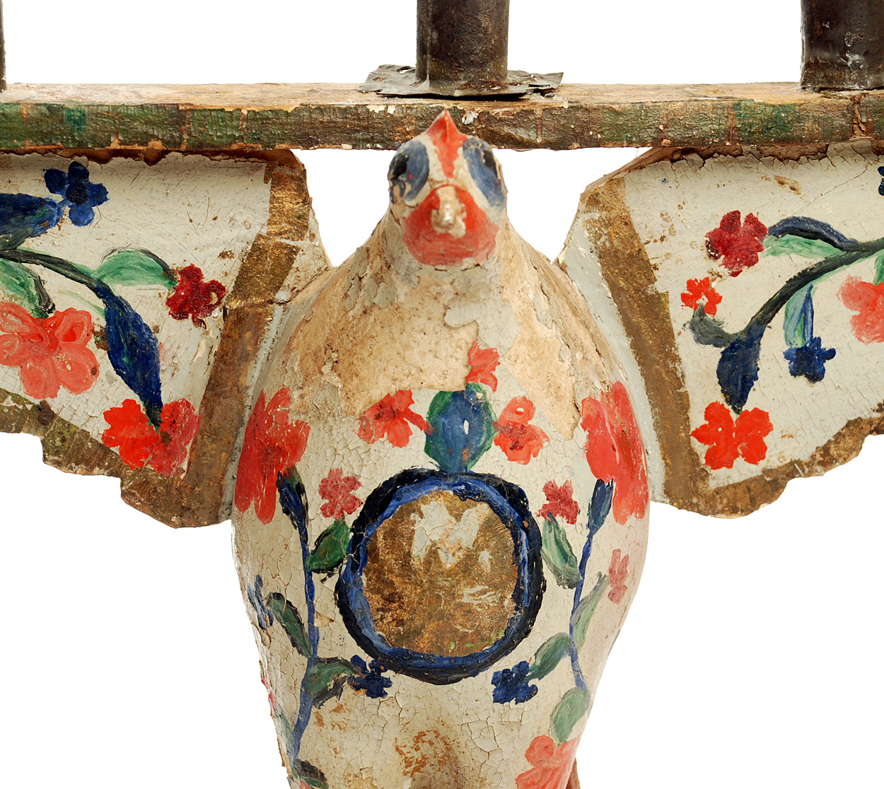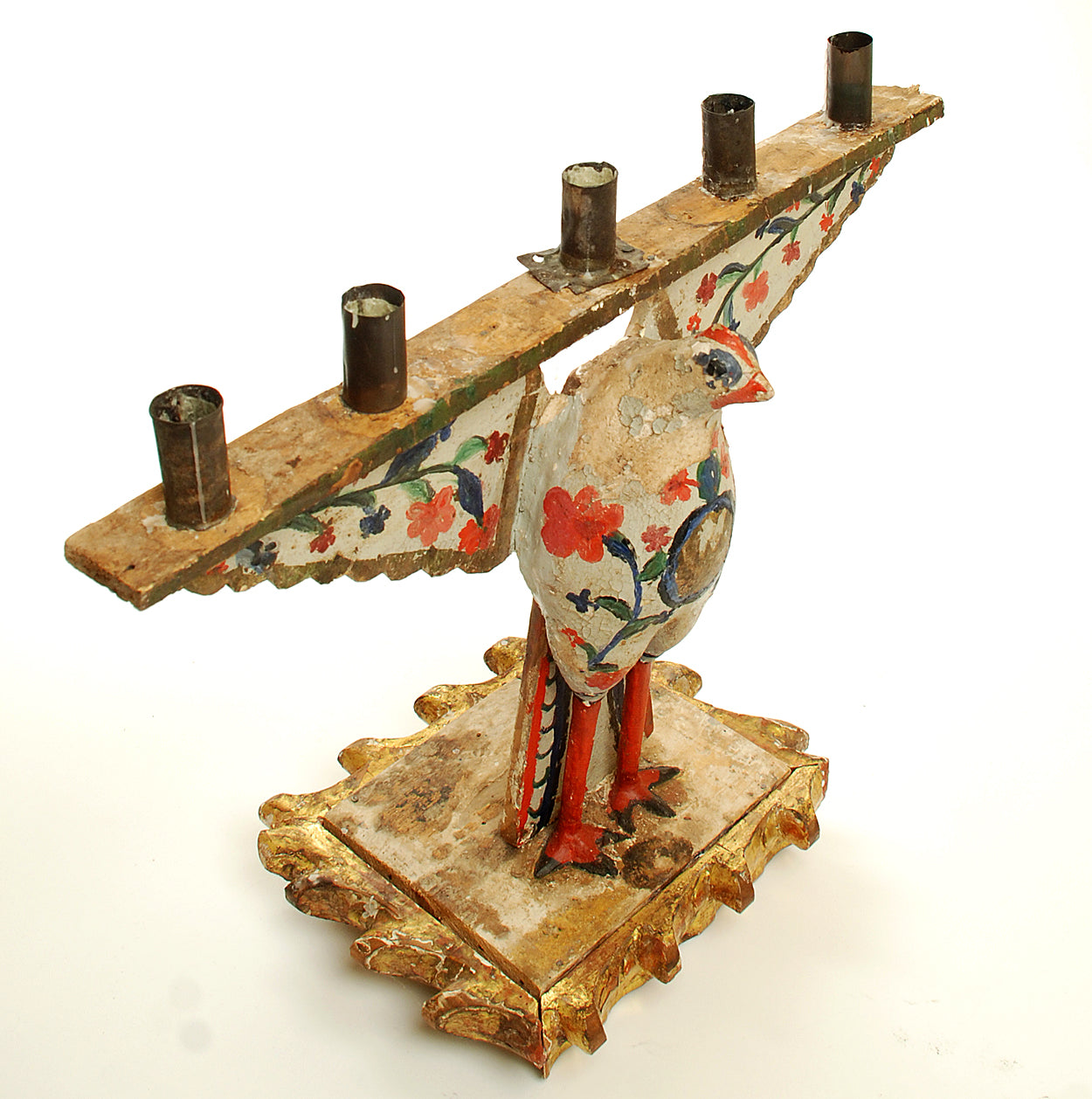A charming early 19th century hand carved and polychrome painted five light candelabrum in the form of a white dove. Bolivia, circa 1825.