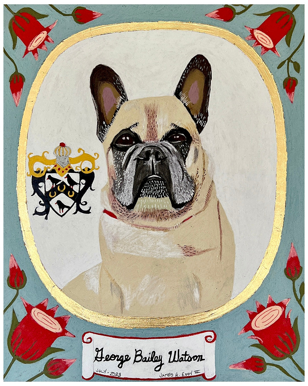 A portrait of 'George Bailey Watson' flanked by the Watson family armorial shield. July 2023