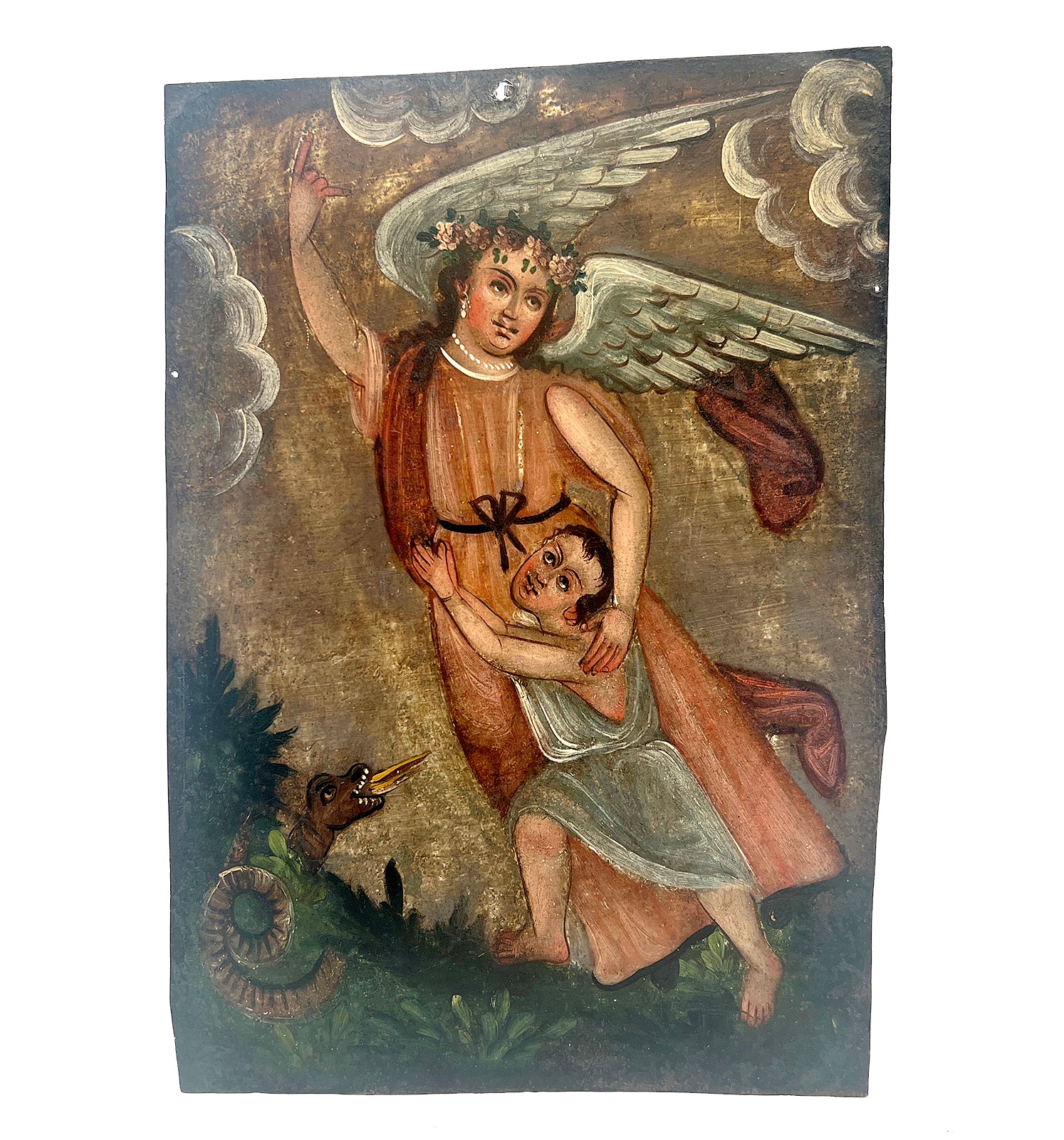 This very rare 19th century Mexican folk retablo represents the guardian angel rescuing a child from the forces of evil represented in the form of a serpent.