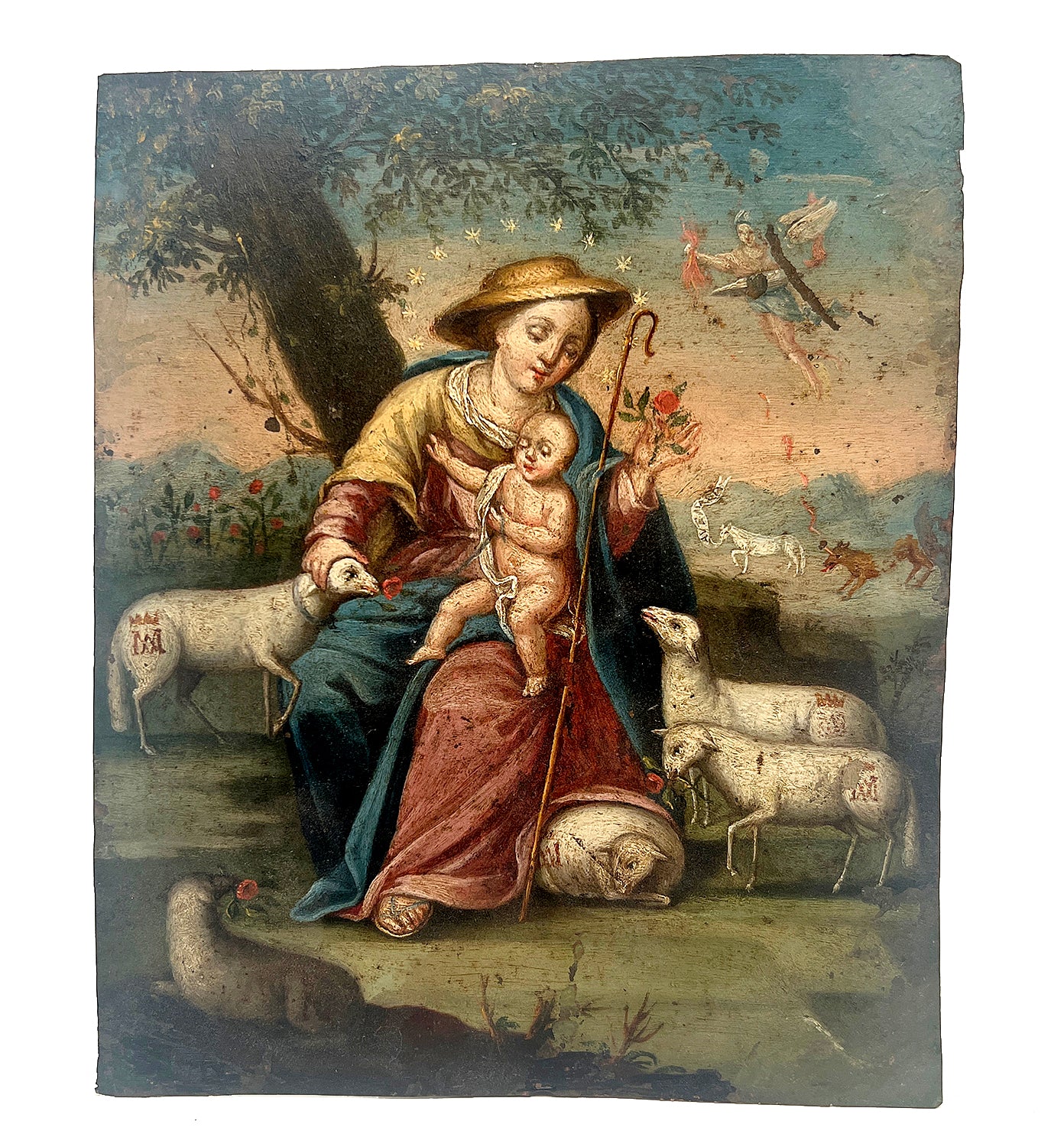 This 18th century Spanish colonial oil on copper painting represents La Divina Pastora (The Divine Shepherd) with the Archangel Michael and a vignette in the background. Mexico. Circa 1750.