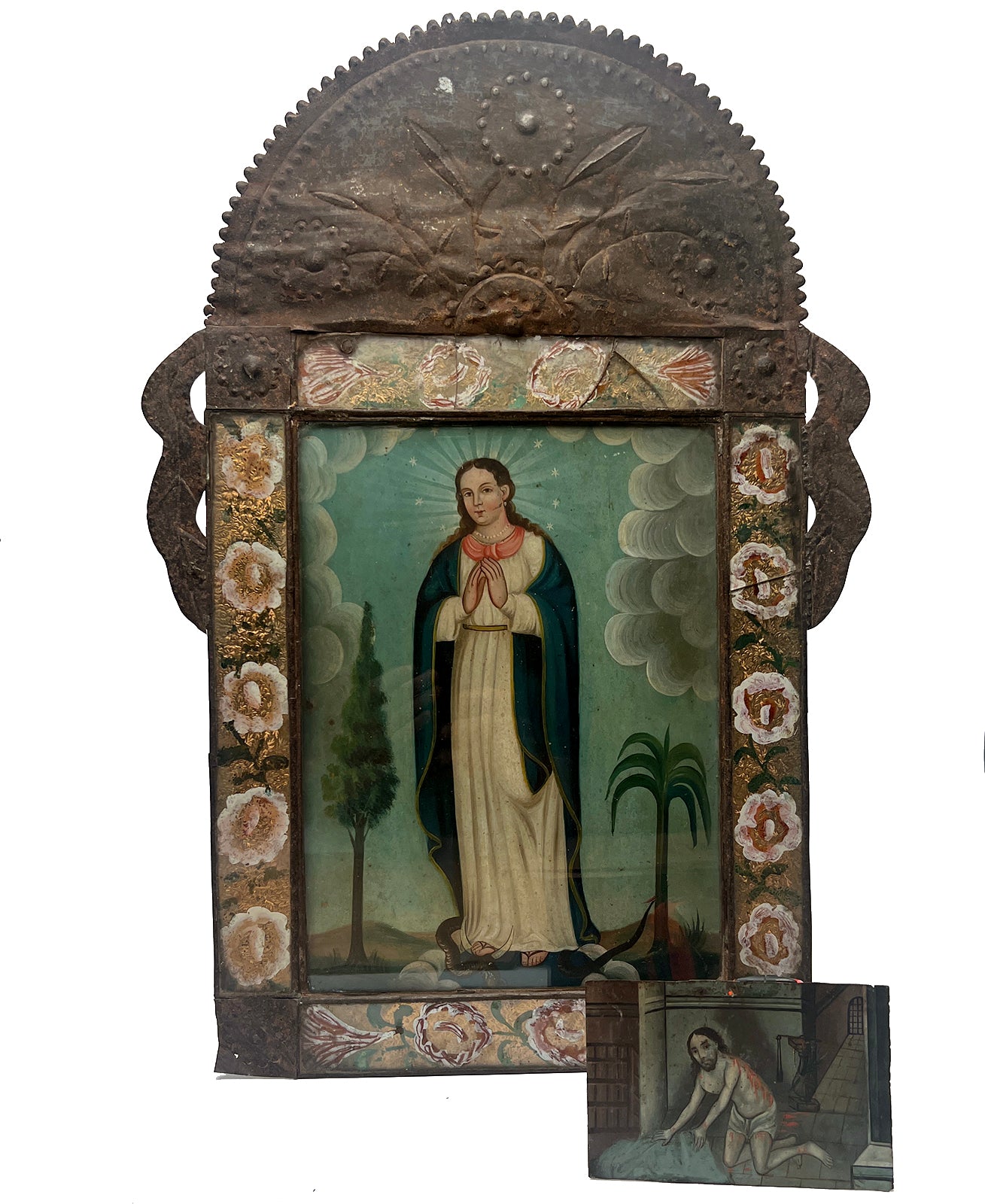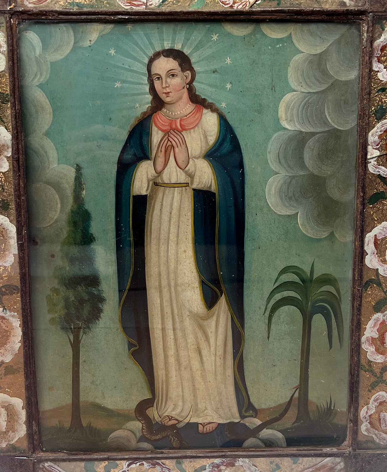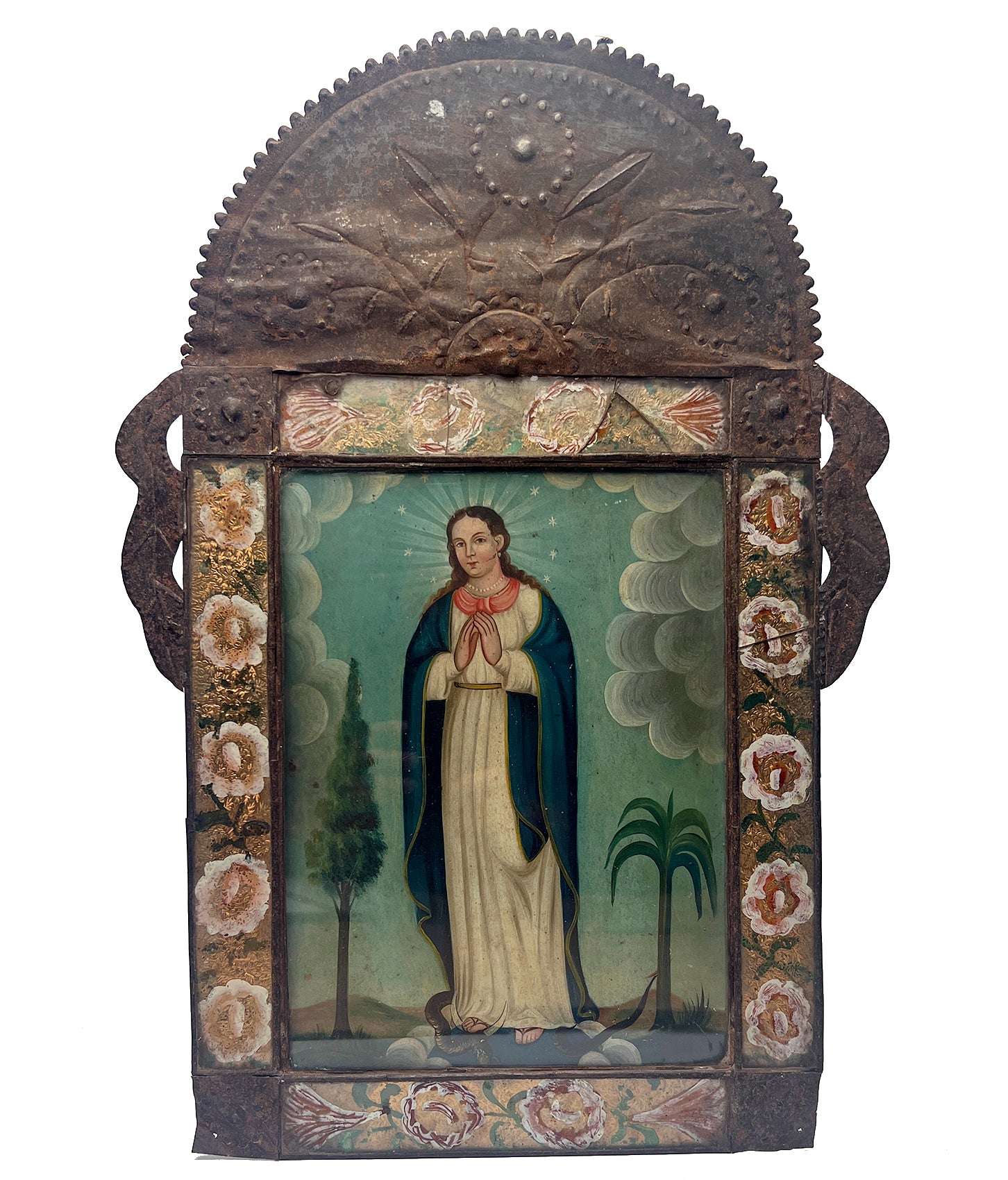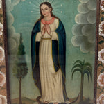 A stunning 19th century Mexican folk retablo -- La Purisima Concepcion (The Purity of Mary). The Purity of Mary represents a youthful Virgin Mary flanked by a palm and a cypress tree with a serpent underfoot. Displayed in a period reverse glass painted and punched tin nicho frame, a magnificent work of art in itself.