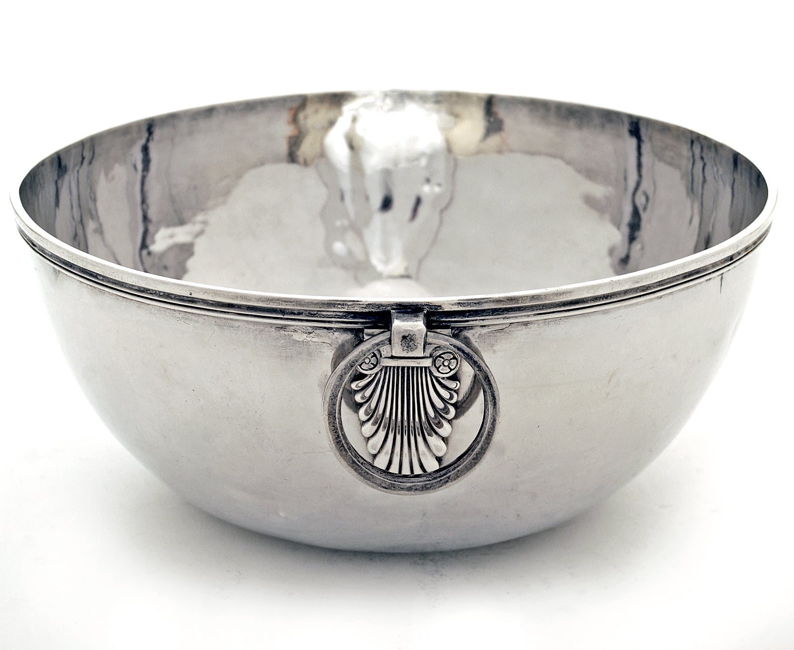 A large and impressive late 18th century silver punch bowl (.950 silver purity) with early French standard marks - Association des Orfévres, 1793-1797, together with 'AP' makers mark. Graduated form with beaded edge and two ring handles joined to the body with palmettes.
