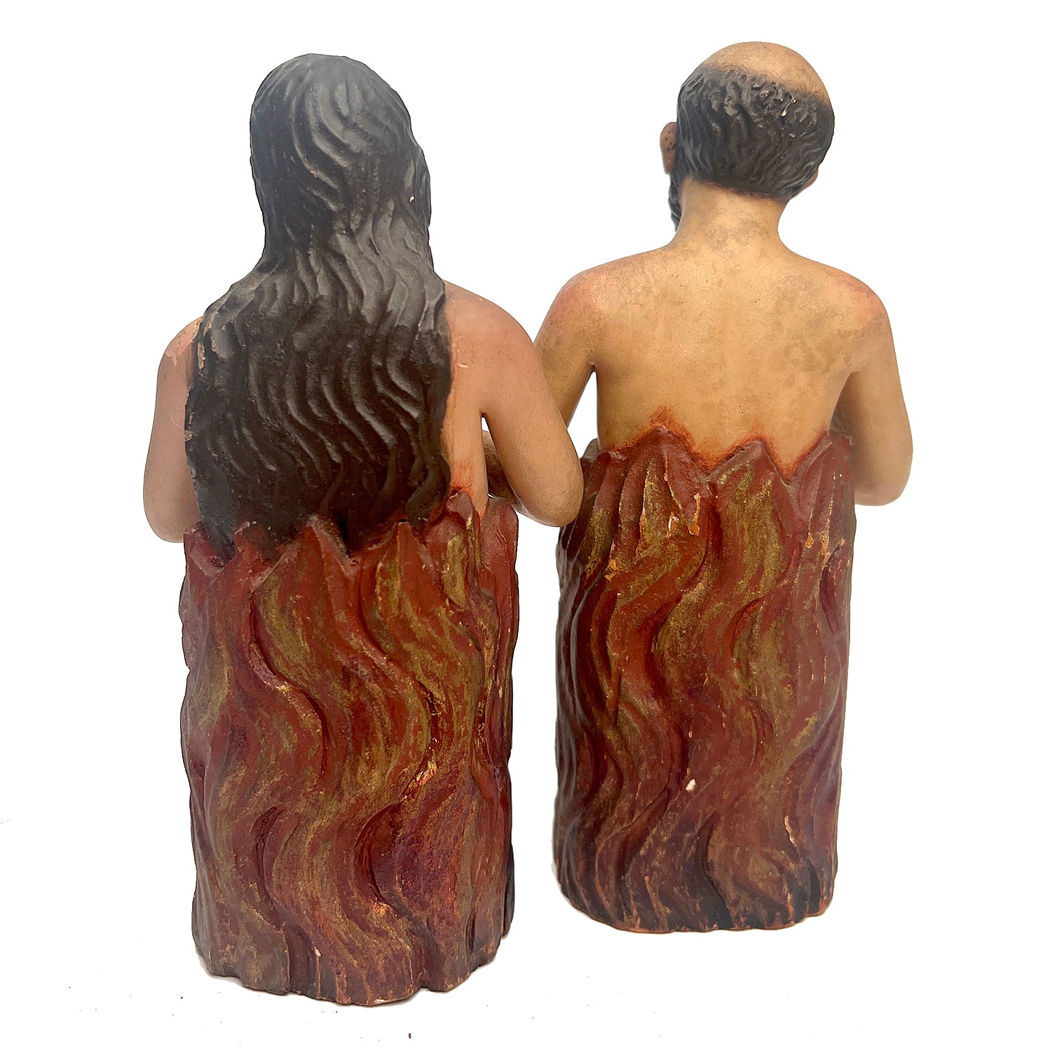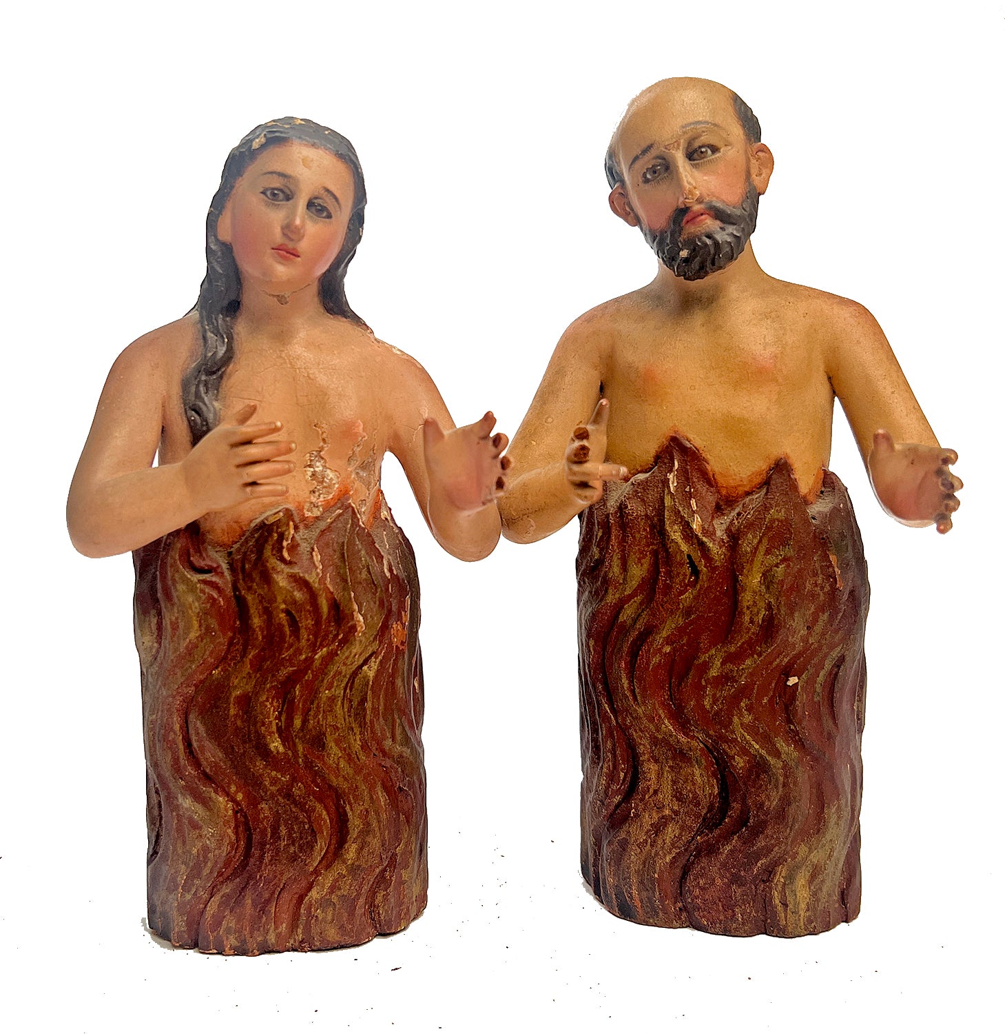 A pair of 19th century hand carved and polychrome painted Anima Sola with inset glass eyes. The anima sola (lonesome soul) is a departed ancestral soul awaiting judgment in the flames of purgatory. The Anima Sola may be invoked when a family member or loved one dies in sin or conversely, to send an enemy to a state of temporary suffering or misery in purgatory. Guatemala. Circa 1850