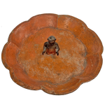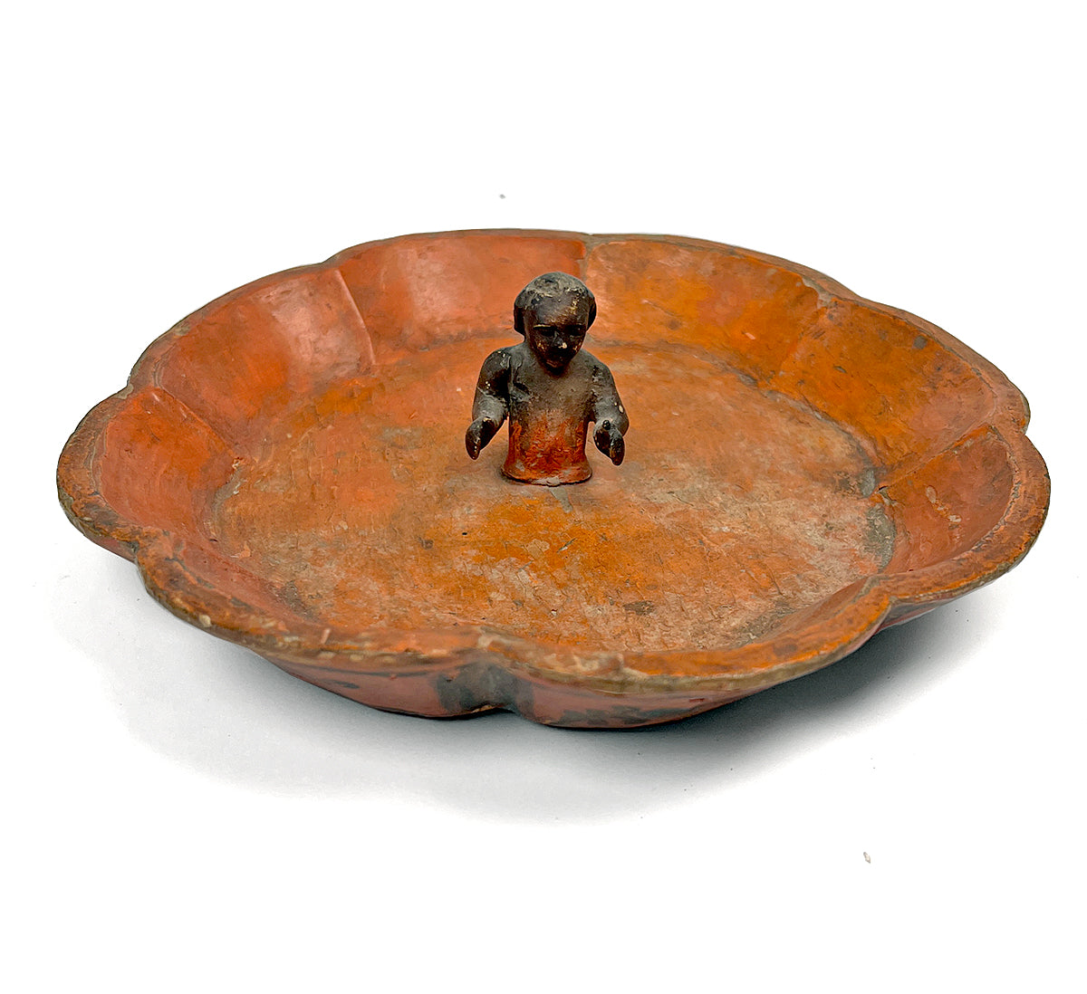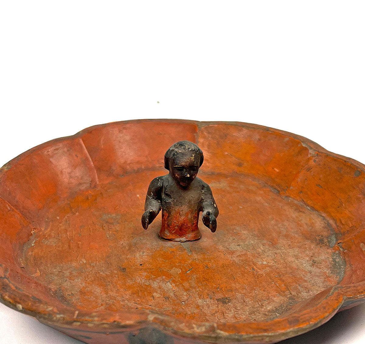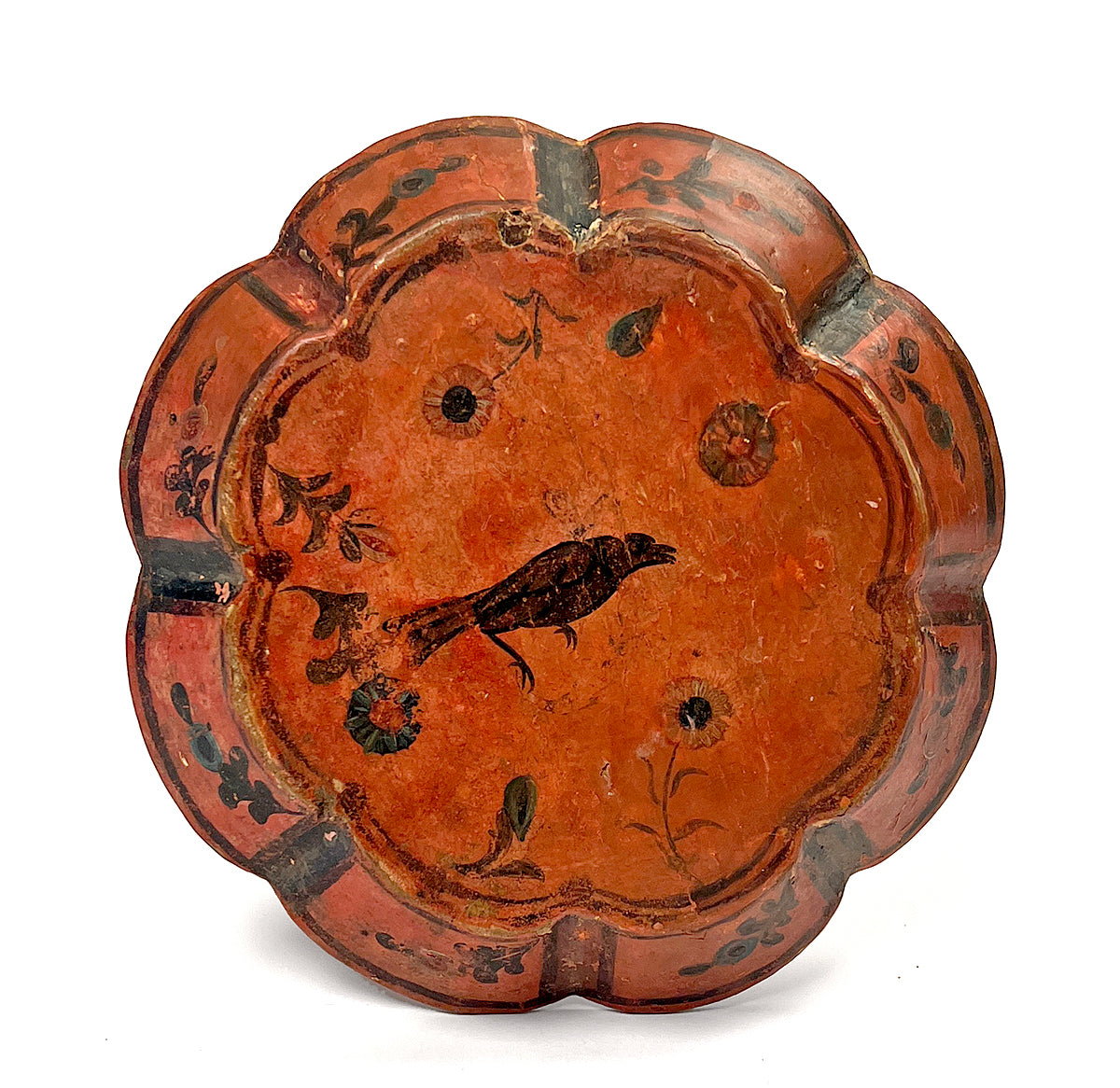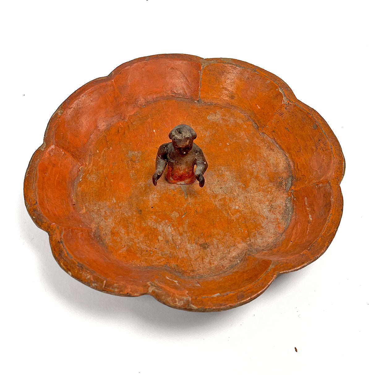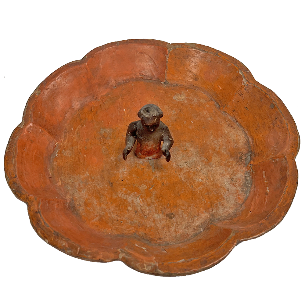 18th century Spanish colonial hand carved and lacquered limosnero (alms tray for alms donations) surmounted by an 'anima sola', a lonesome soul awaiting judgement in the flames of purgatory. Verso with black bird and various foliate motifs. Natural pigments derived from cochineal, a small scale insect native to subtropical South America, Mexico and the Southwest United States that lives in stationary clumps on nopal, prickly pear cacti.. Circa 1750