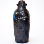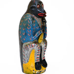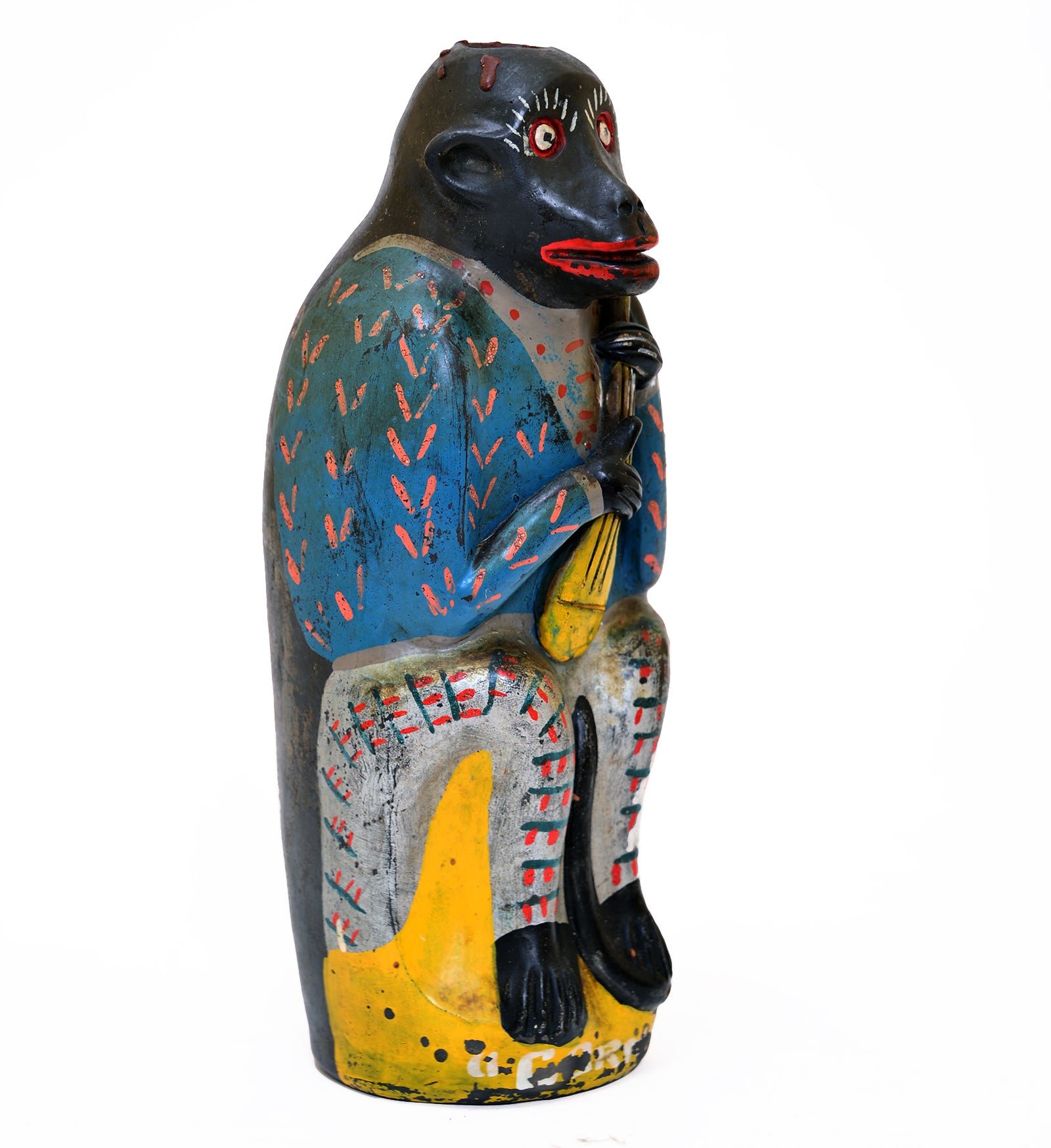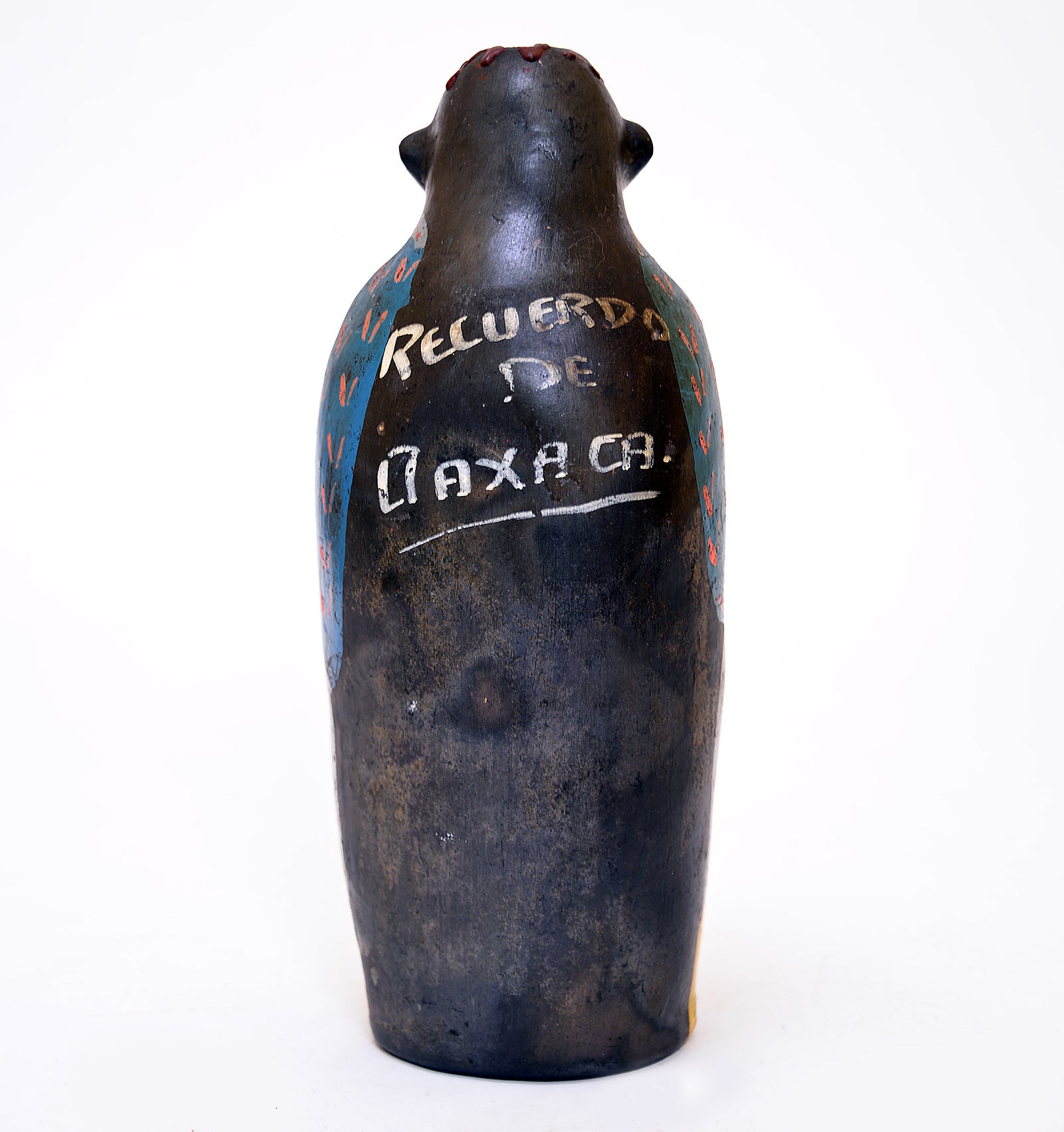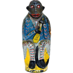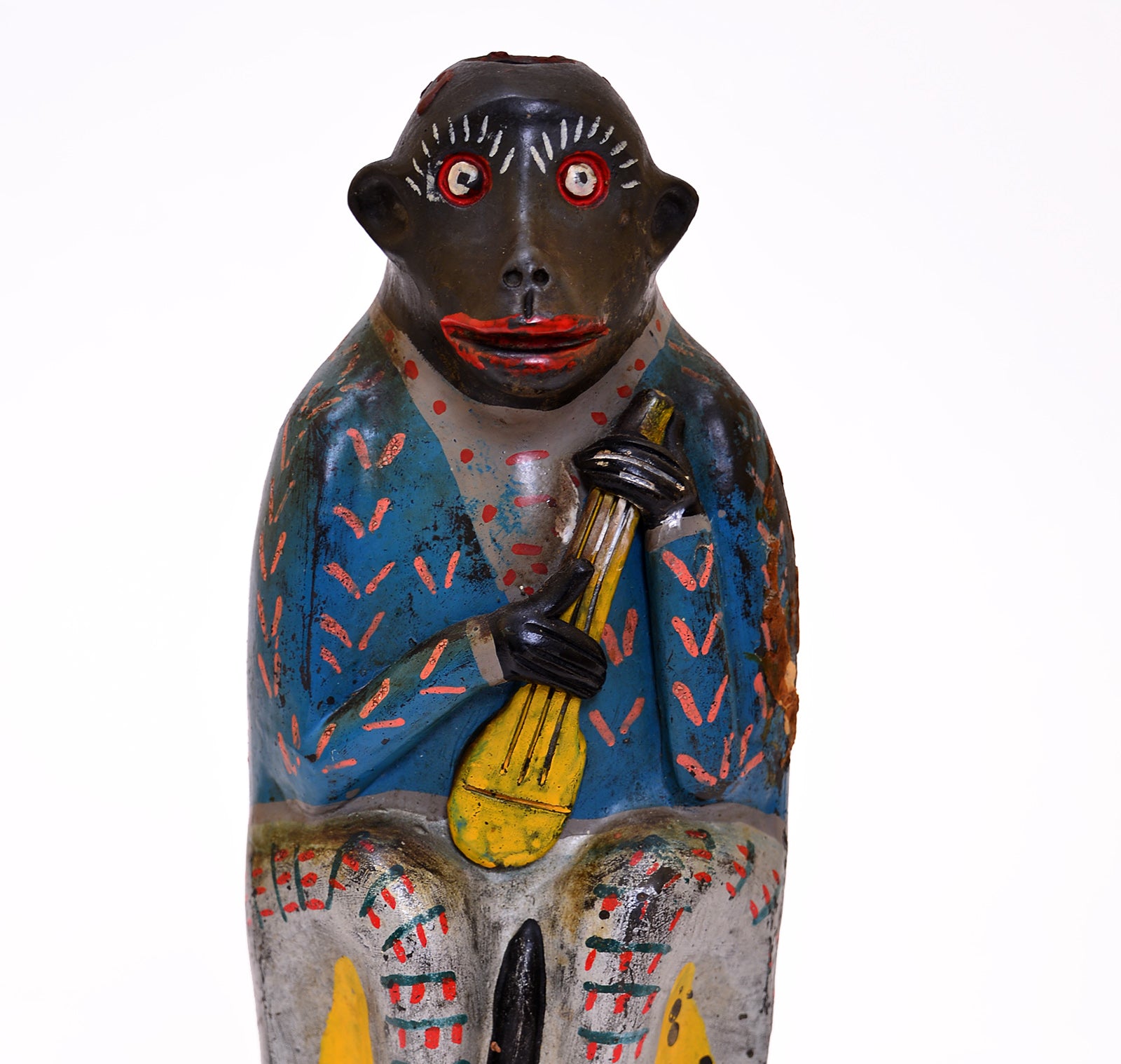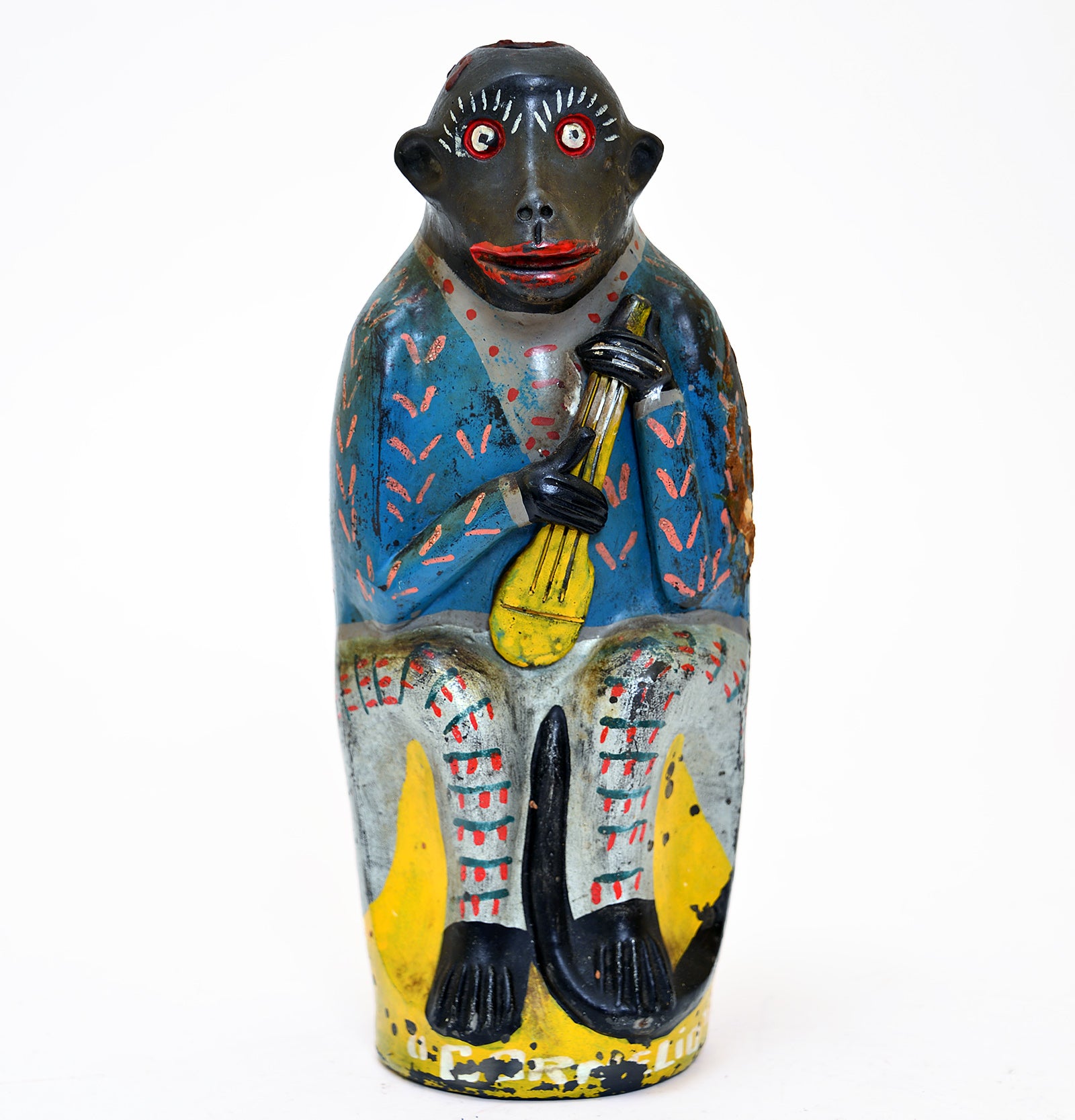 Mid century Mexican mezcal bottle in the form of a seated 'chango' clutching his mandolin. Low fired and hand painted 'barro negro' (black clay) from Oaxaca. Circa 1950.