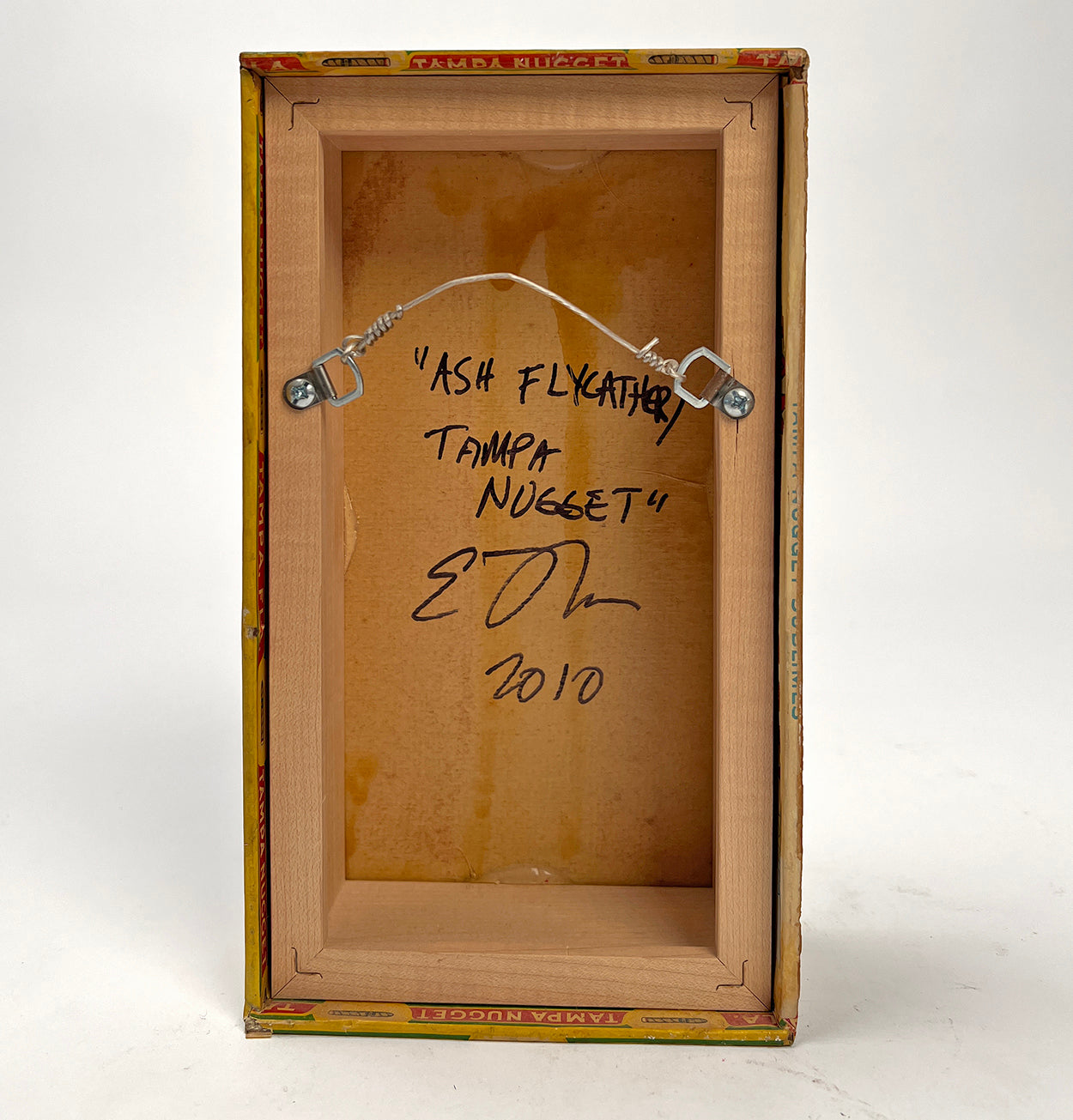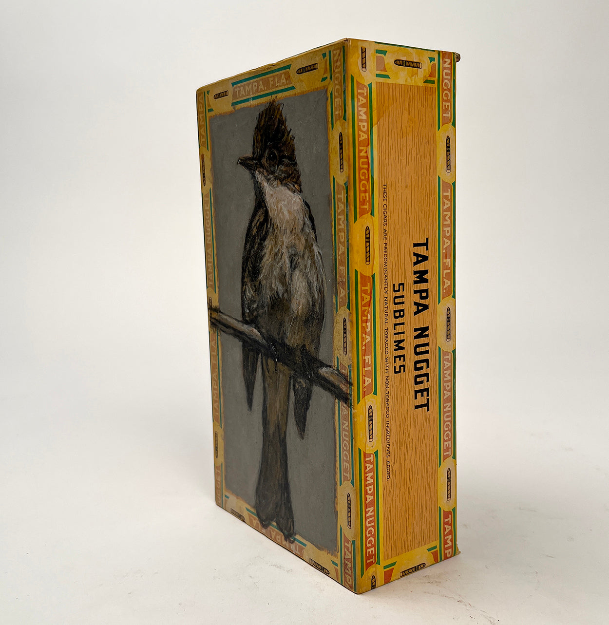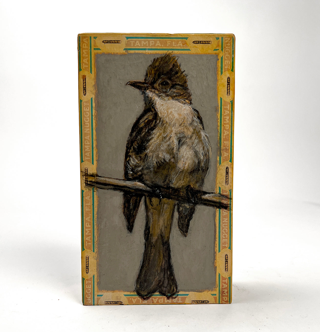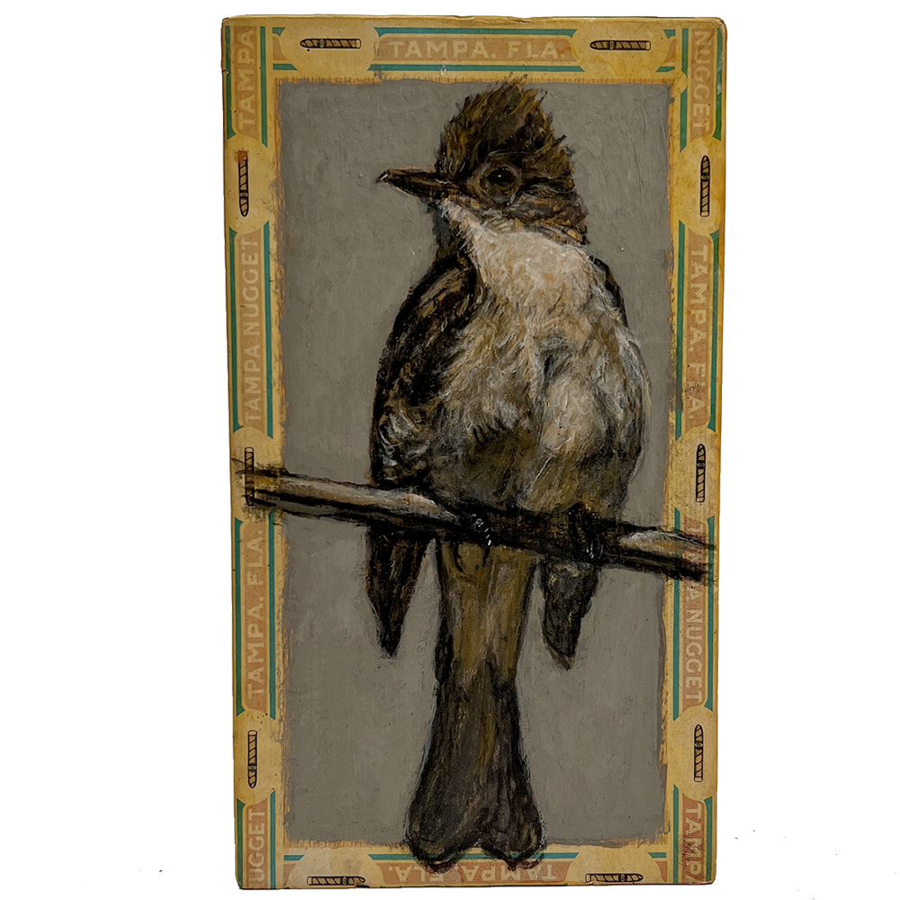 Original Ed Musante cigar box painting of an ash flycatcher on a Tampa Nugget cigar box.. Signed on verso. 2010