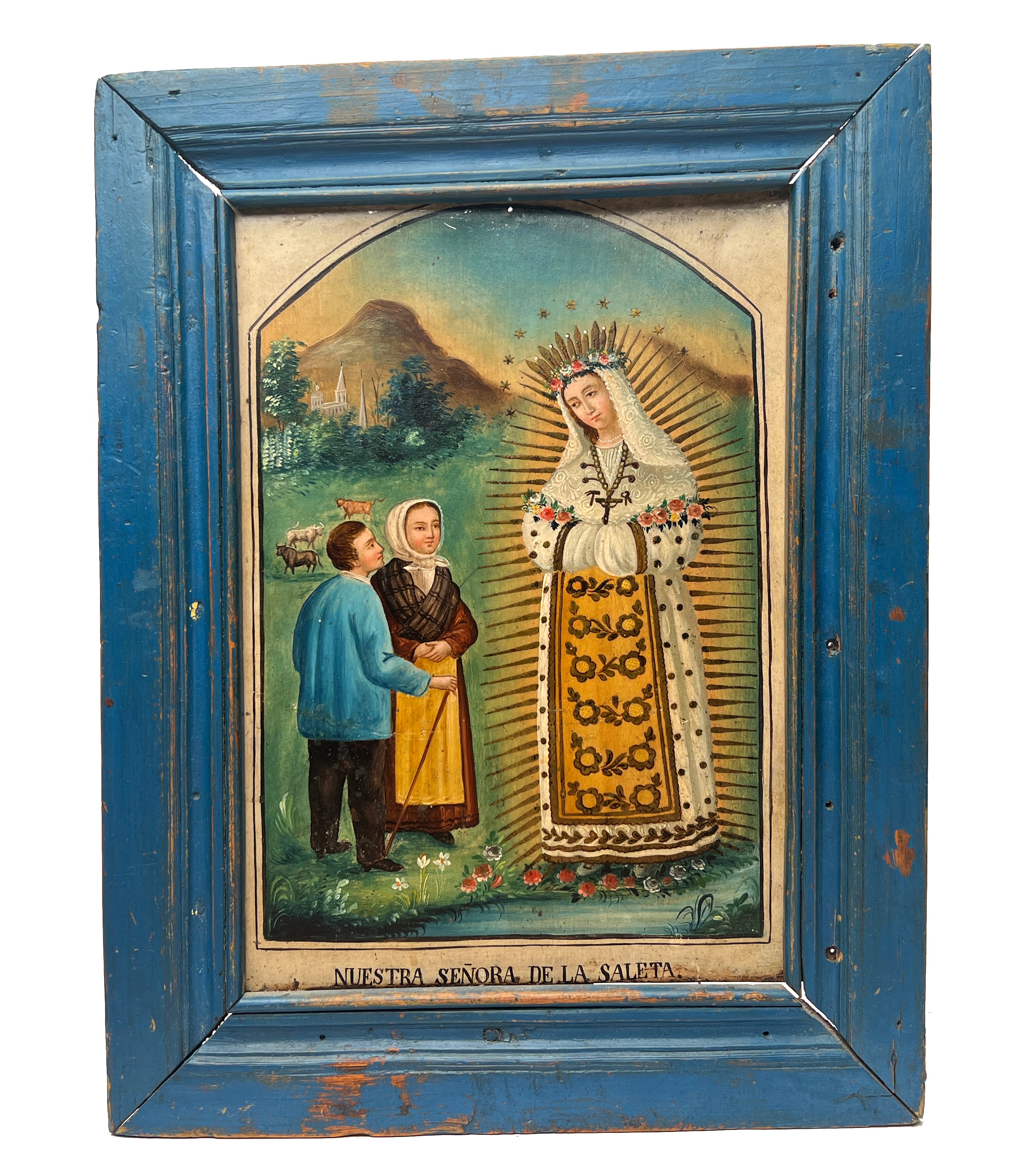 Dimensions: frame measures 19 inches x 15 inches. Retablo measures 14 inches x 10 inches.