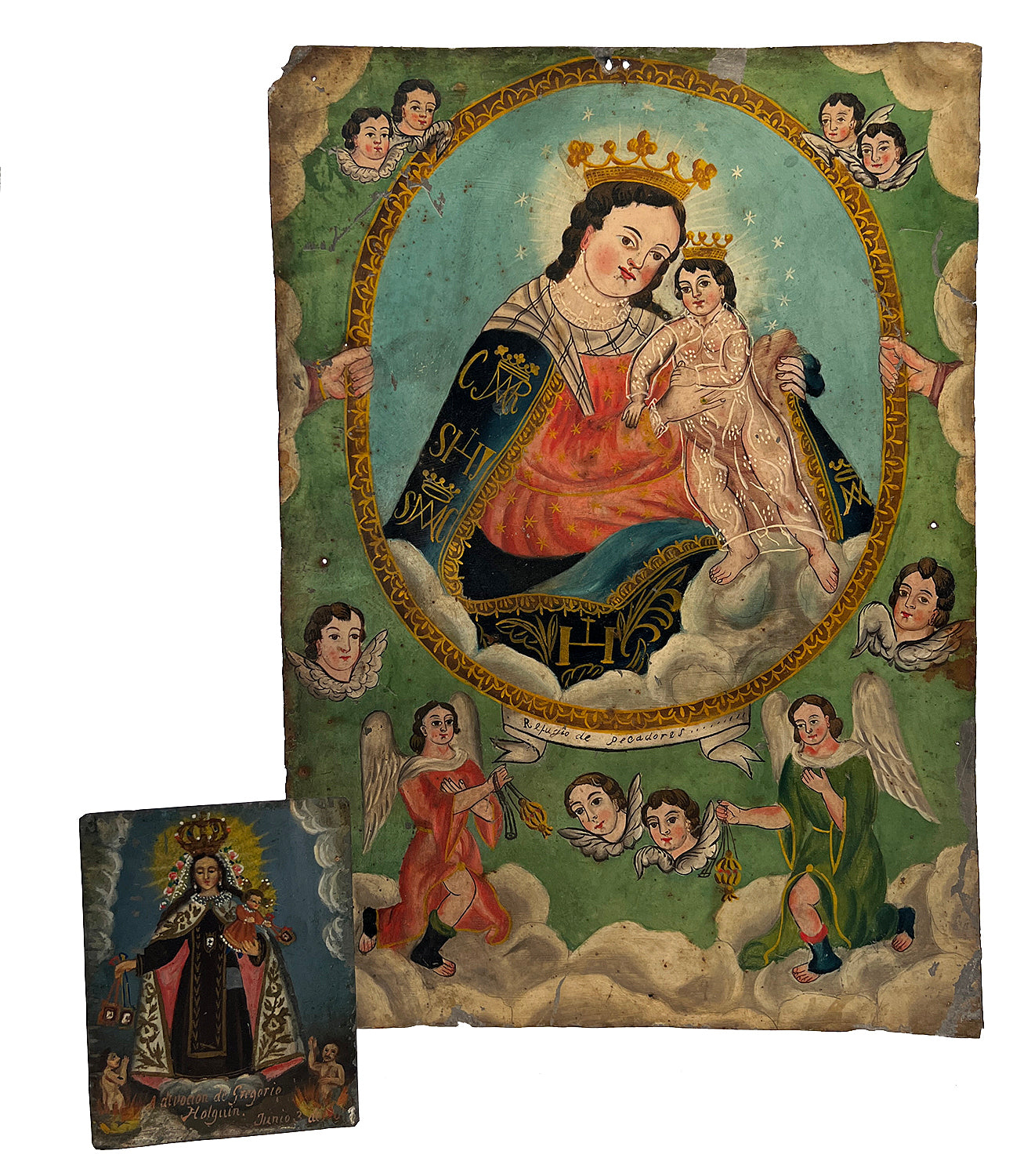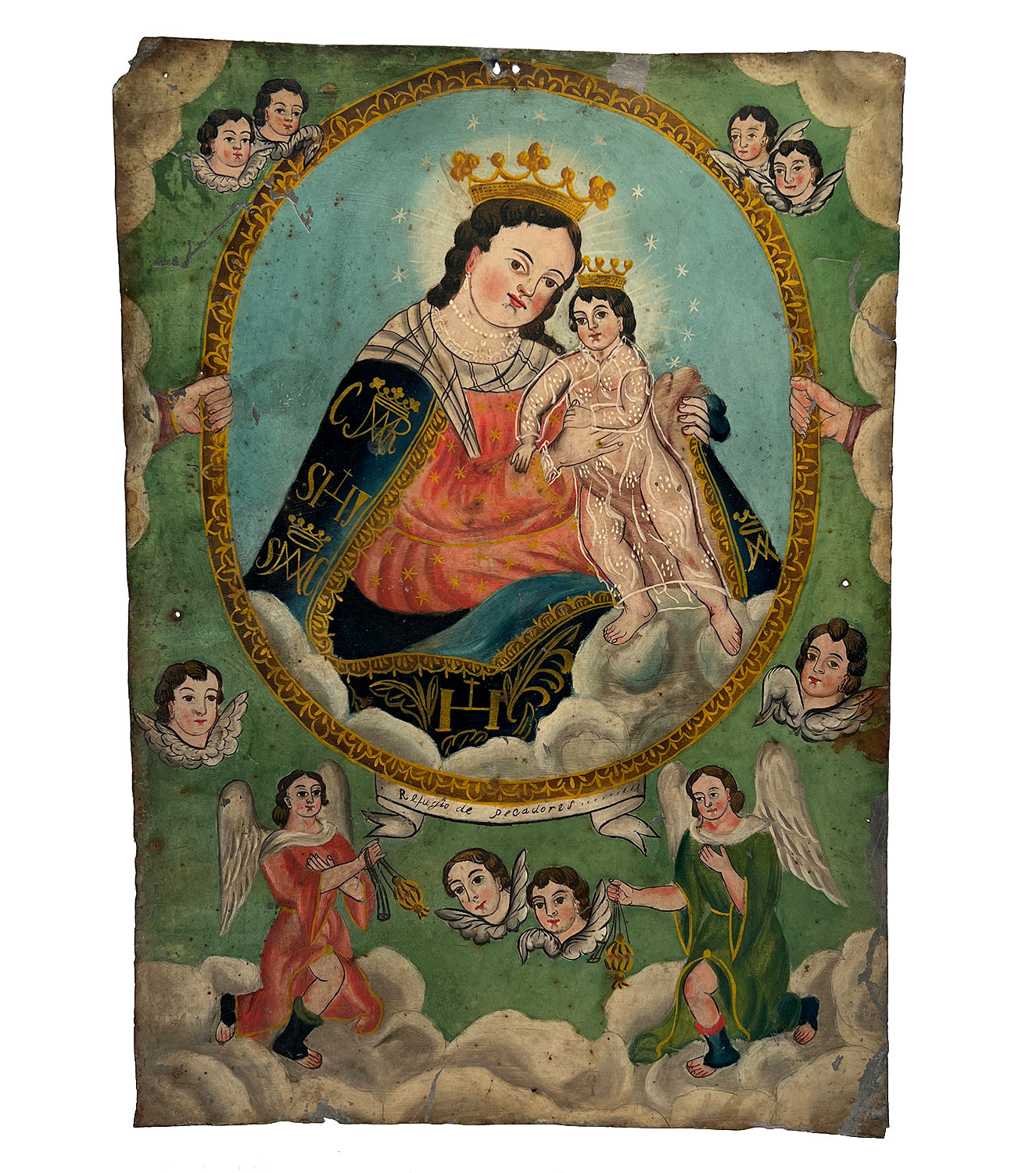 This charming 19th century folk retablo from Mexico, circa 1880, represents "NS de Refugio de los Pecadores," or "Our Lady, Refuge of Sinners."
