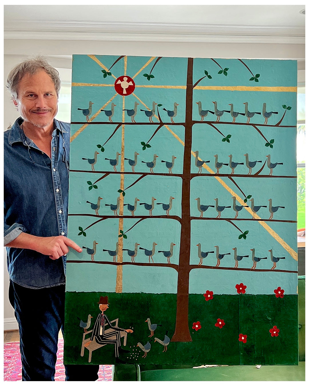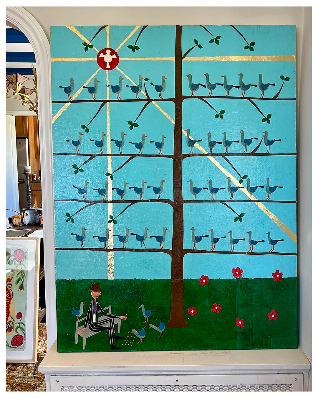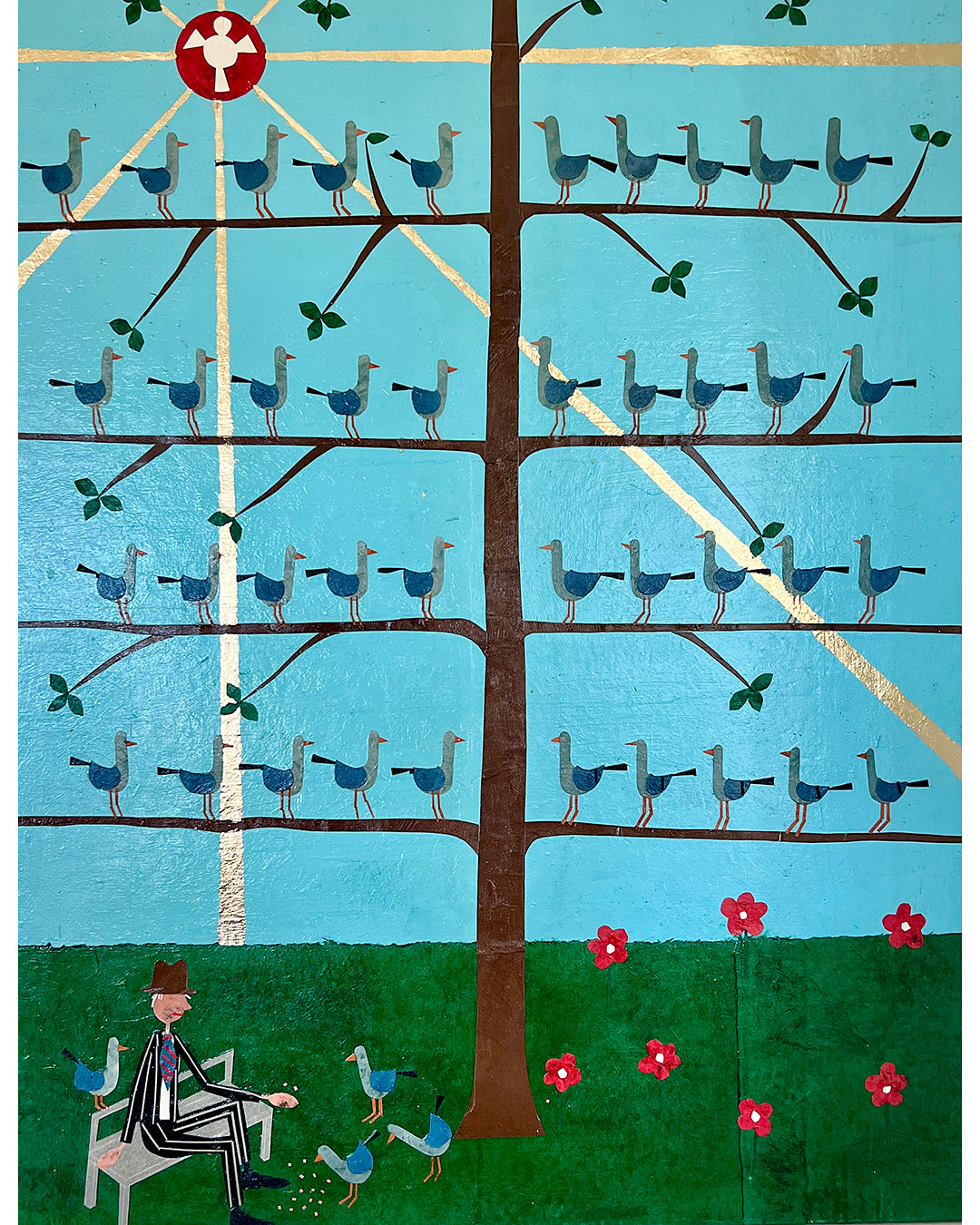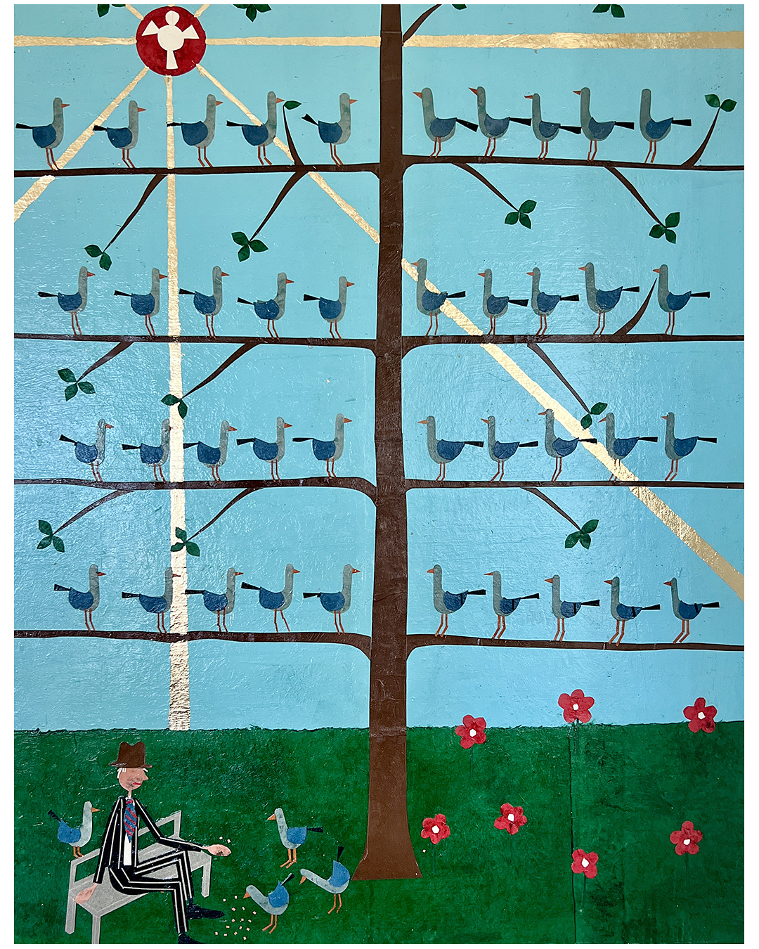 Hand cut and torn paper collage with gold leaf on wooden panel. Lafayette Park, SF. 2023.