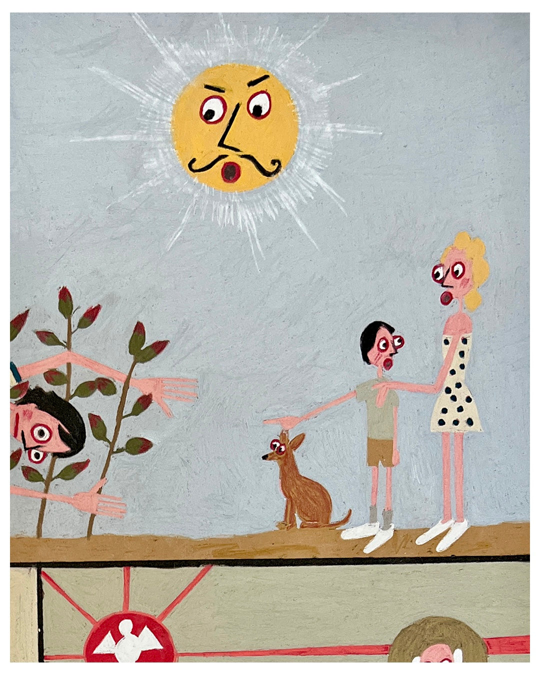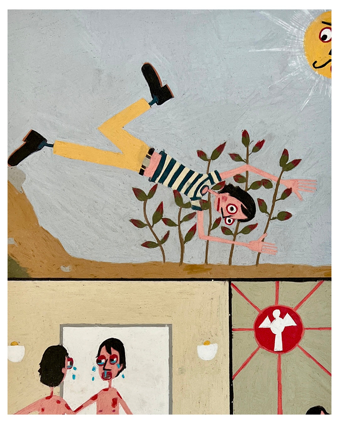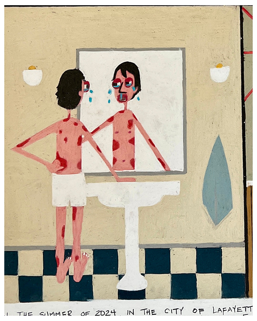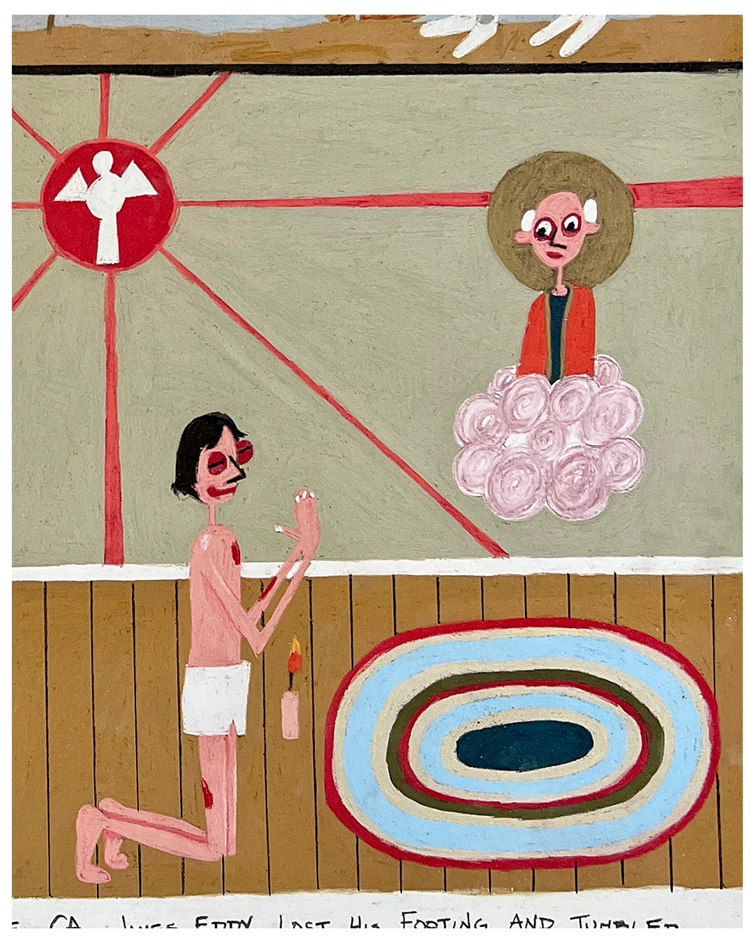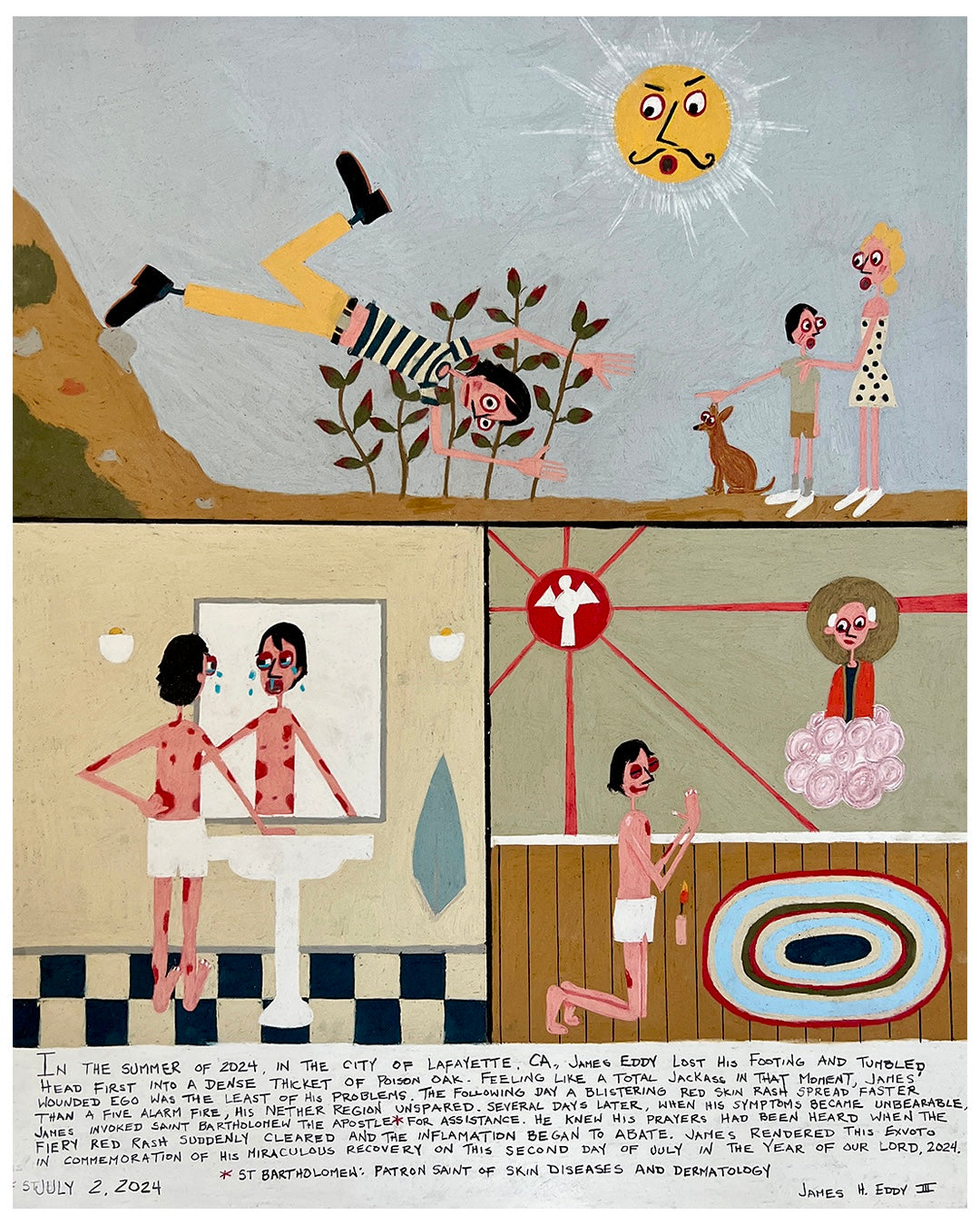 ‘In the summer of 2024, in the city of Lafayette, CA., James Eddy lost his footing and tumbled head first into a dense thicket of poison oak. Embarrassed, and feeling like a total jackass in that moment, James’ wounded ego was the least of his problems. The following day a blistering red skin rash spread faster than a five alarm fire, his nether region unspared. Several days thereafter, when his symptoms became unbearable and home remedies offered little relief, James invoked Saint Bartholomew the Apostle, the patron saint of skin diseases and dermatology, for assistance. He knew his prayers had been heard when the fiery red rash suddenly waned and the inflamation began to abate. James rendered this exvoto in commemoration of his miraculous recovery on this second day of June in the year of our lord, 2024.’