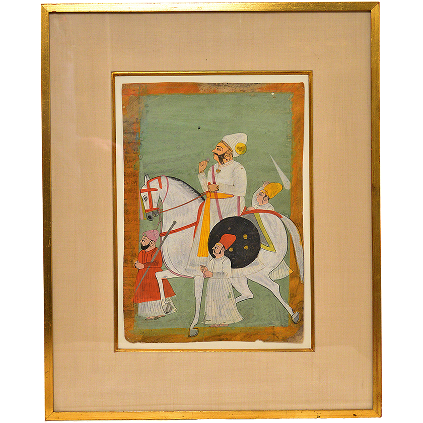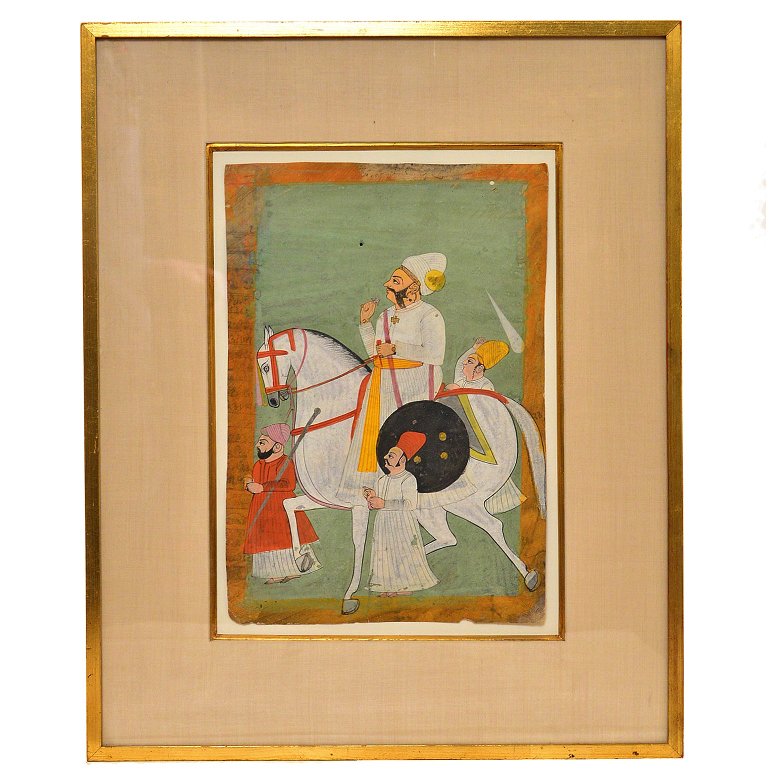 Mid 19th century Indian gouache on paper depicting a Raja on horseback. Rajput, Jadpur. Circa 1850. Ex Jerry Ludovich collection, Sausalito, CA.