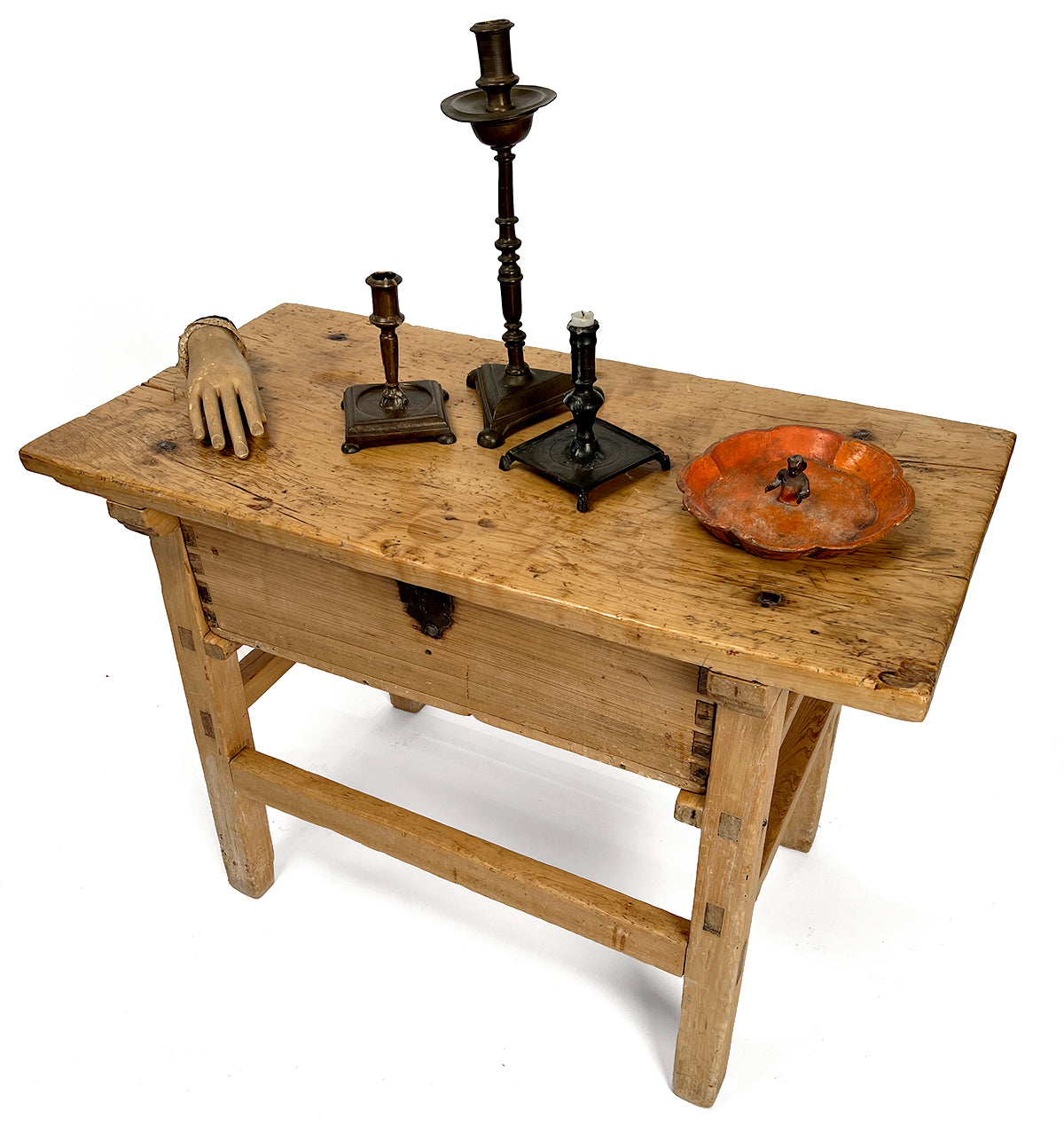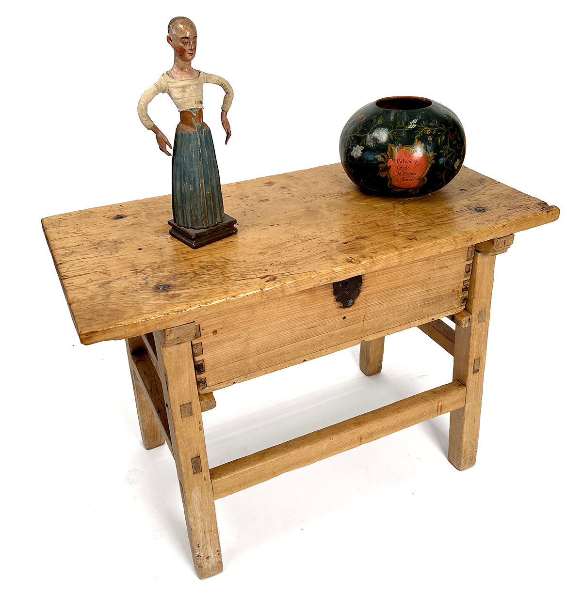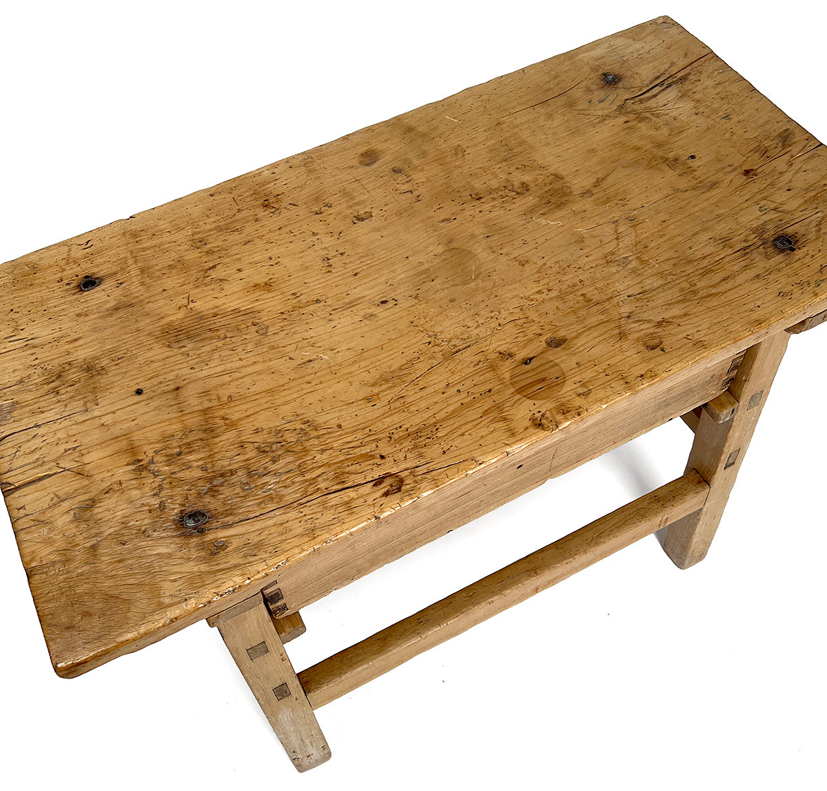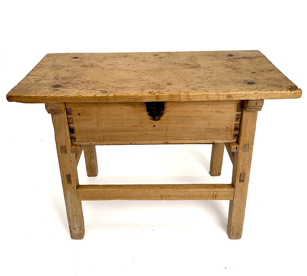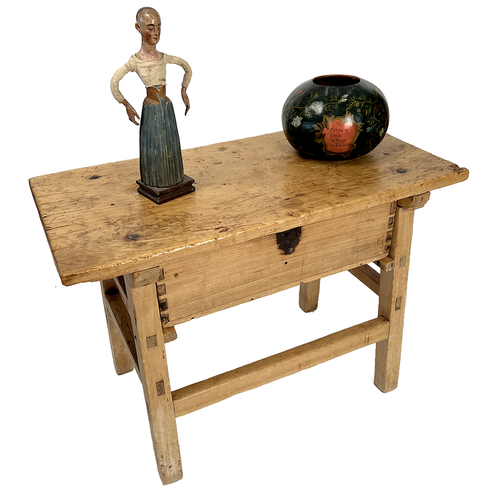Early 19th century Sabino wood (Mexican cypress) side table with a thick single board top over a suspended drawer, all raised on square legs and connected by stretchers.