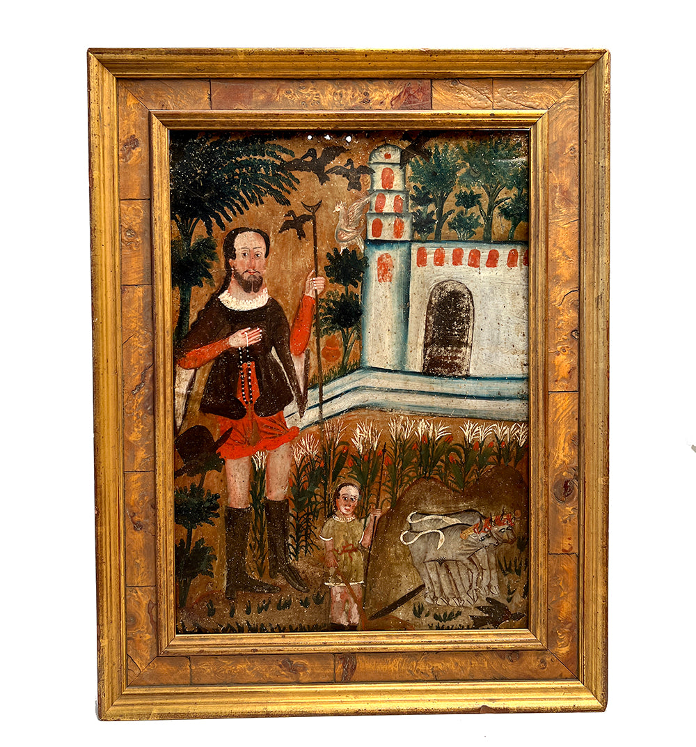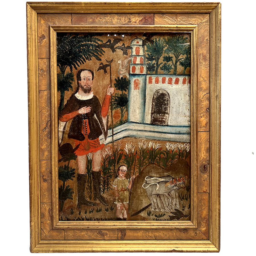 This 19th century Mexican folk retablo represents San Ysidro Labrador, the patron Saint of Farmers. San Ysidro Labrador (Saint Isidore the Laborer) is invoked for agricultural issues, good weather (before picnics) and prosperous crop. He is usually depicted working the fields together with a diminutive angel and cattle in the foreground.