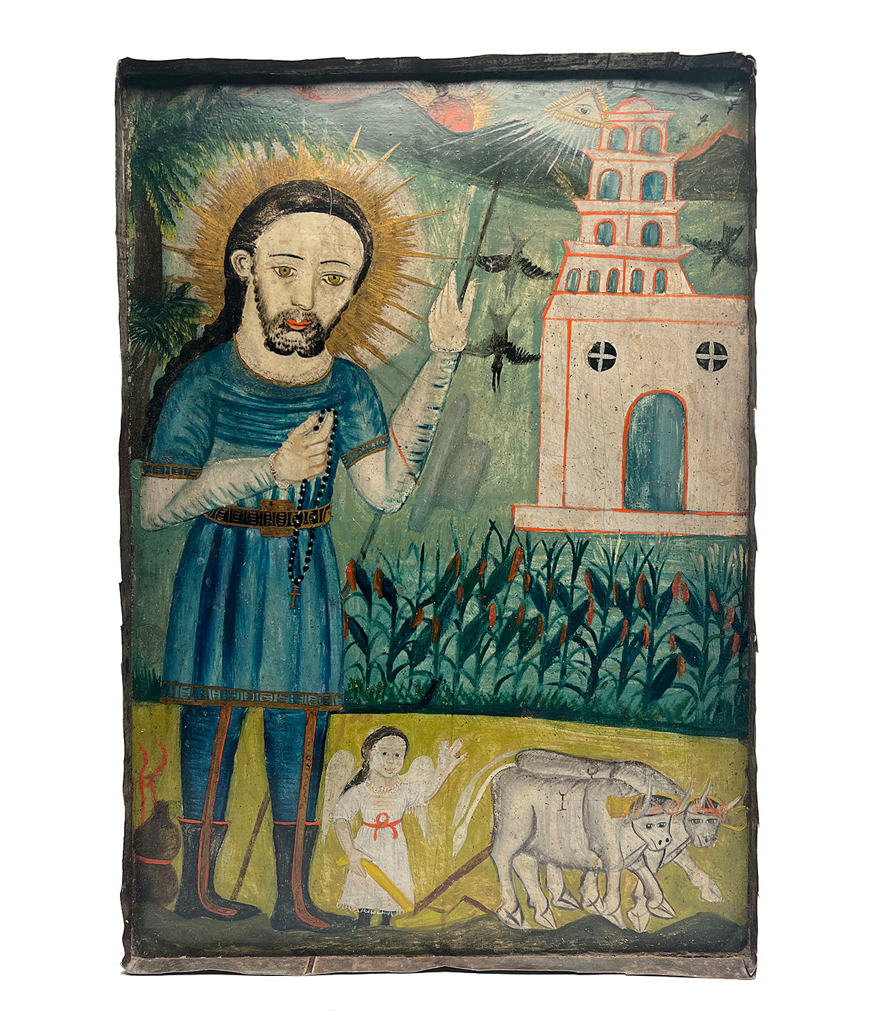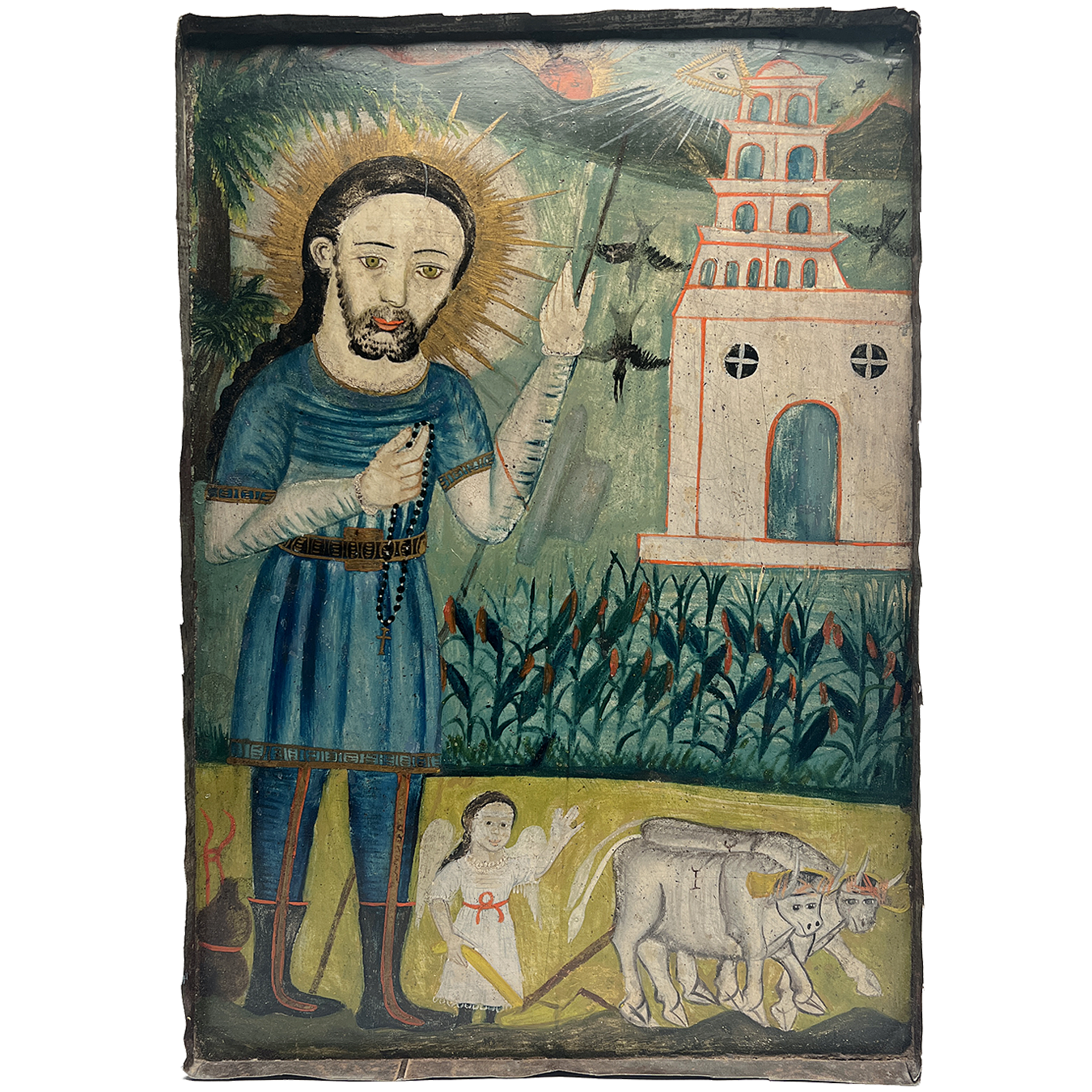 This large and impressive 19th century Mexican folk retablo represents San Ysidro Labrador, the patron Saint of Farmers. San Ysidro Labrador (Saint Isidore the Laborer) is invoked for agricultural issues, good weather (before picnics) and prosperous crop. He is usually shown working the fields together with a diminutive angel and cattle in the foreground.
