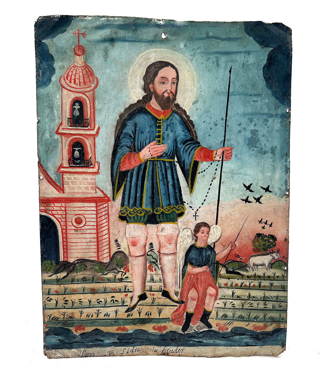 This very charming 19th century retablo represents San Ysidro Labrador, the patron saint of farmers. San Ysidro is invoked for agricultural issues, good weather (before picnics) and prosperous crop. According to popular legend, Saint Isidore was instructed by God to stop working on the Sabbath but the saint was too overwhelmed with work and would not obey. The lord threatened him three times and San Ysidro accepted the Lord's offer of an angel to help him complete his chores. Saint Isidore is almost always depicted as he is here, working the fields with his angel and cattle.