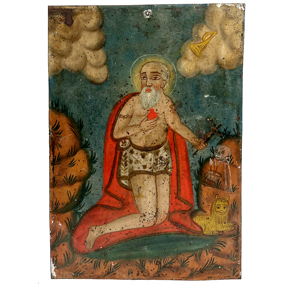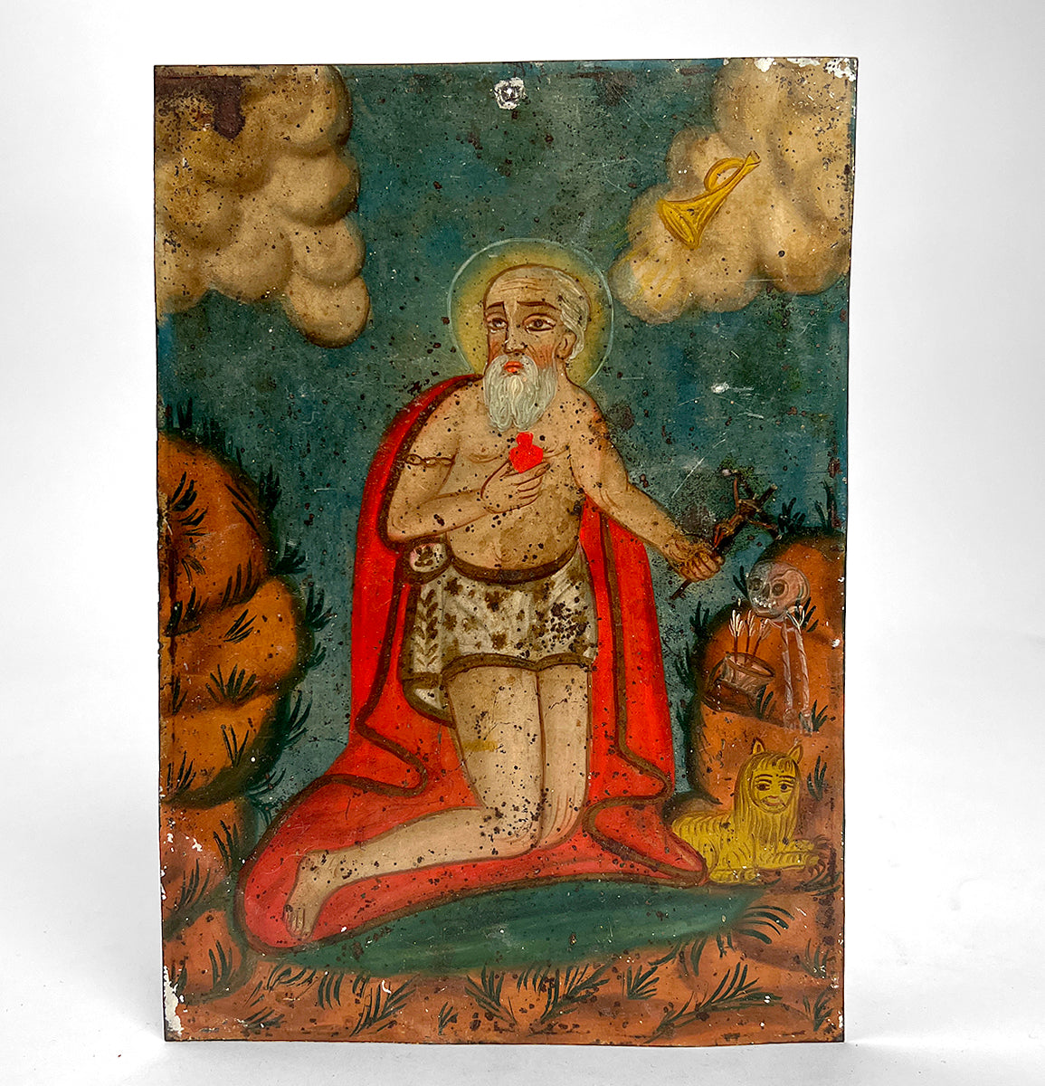 A 19th century Mexican folk retablo painting on heavy gauge tin, San Jeronimo, the patron saint of philosophers and doctors.