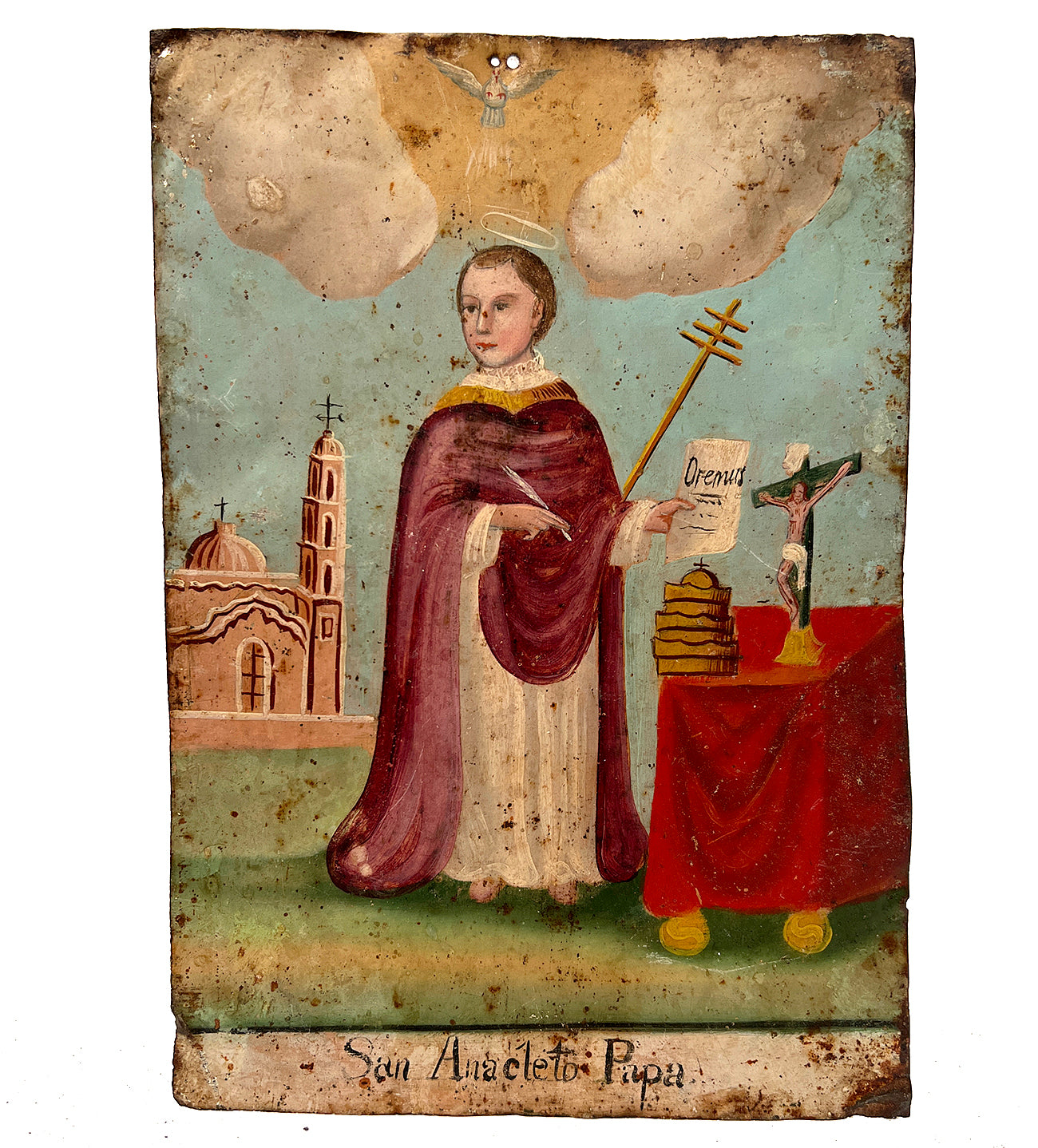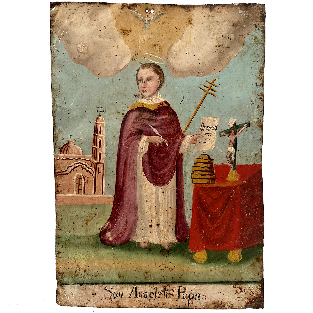 This 19th century folk retablo from Mexico represents San Anacleto Papa, the third pope, ordained by Saint Peter and died as a martyr.