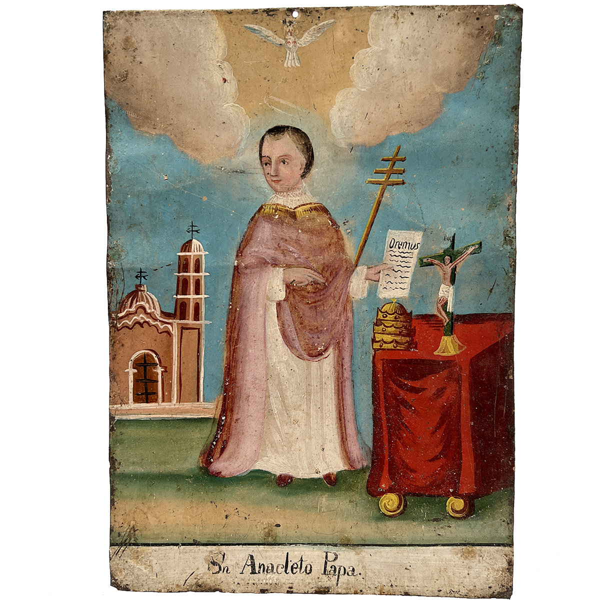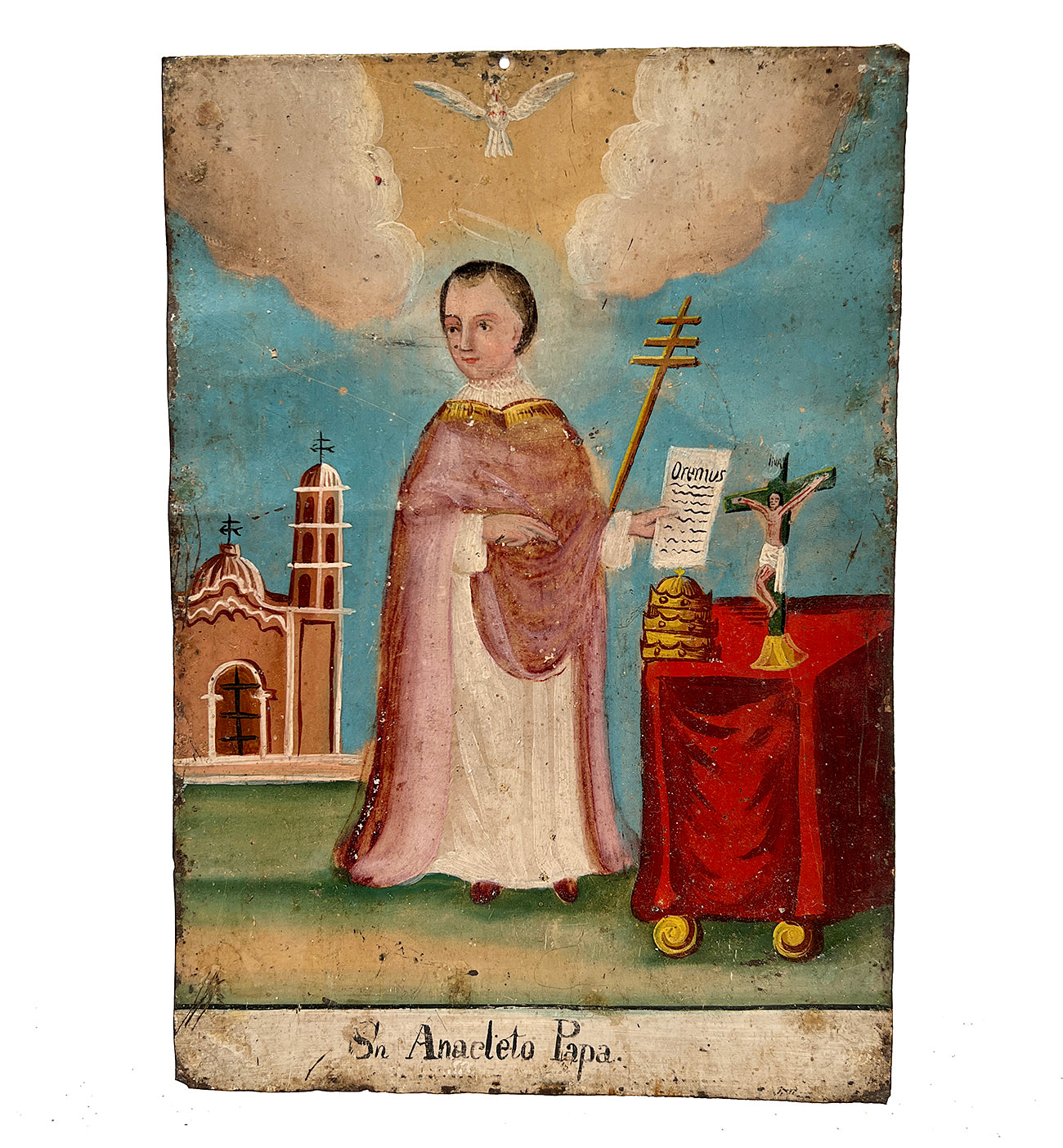 This 19th century folk retablo from Mexico represents San Anacleto Papa, the third pope, ordained by Saint Peter and died as a martyr.