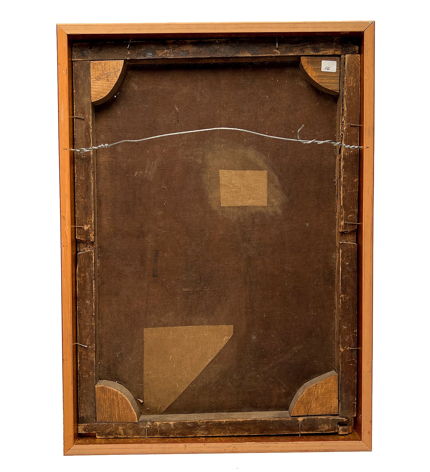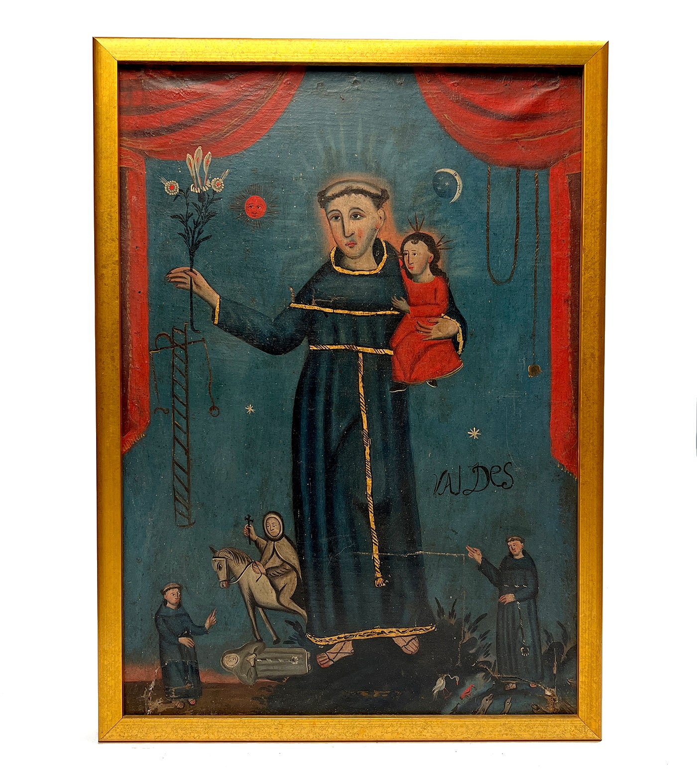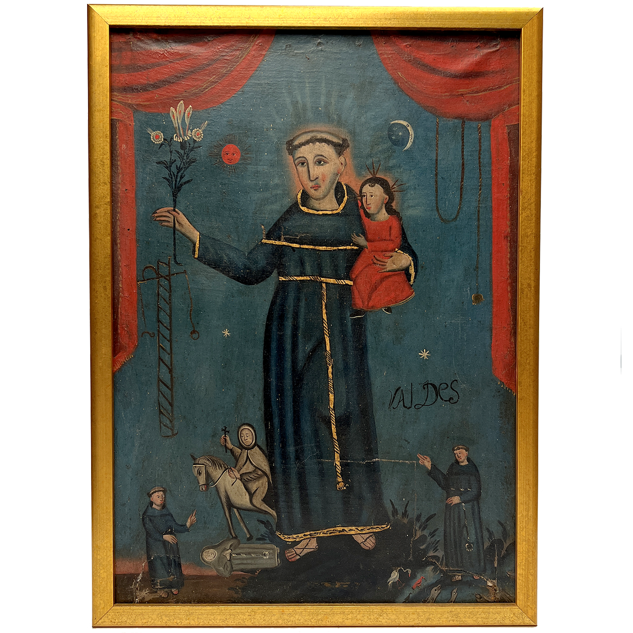 A charming 19th century oil on canvas painting from Mexico - San Antonio de Padua with vignettes in lower corners.
