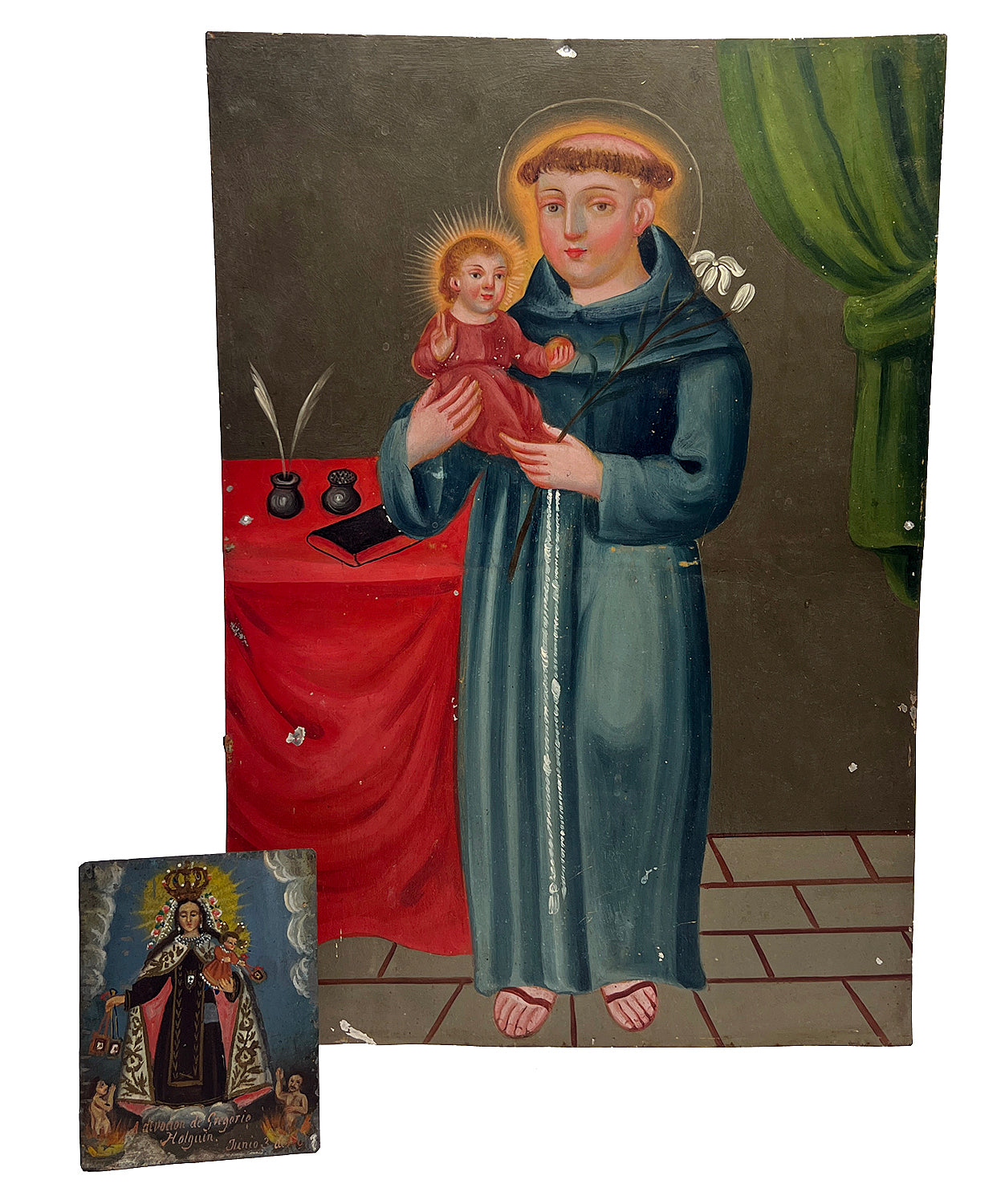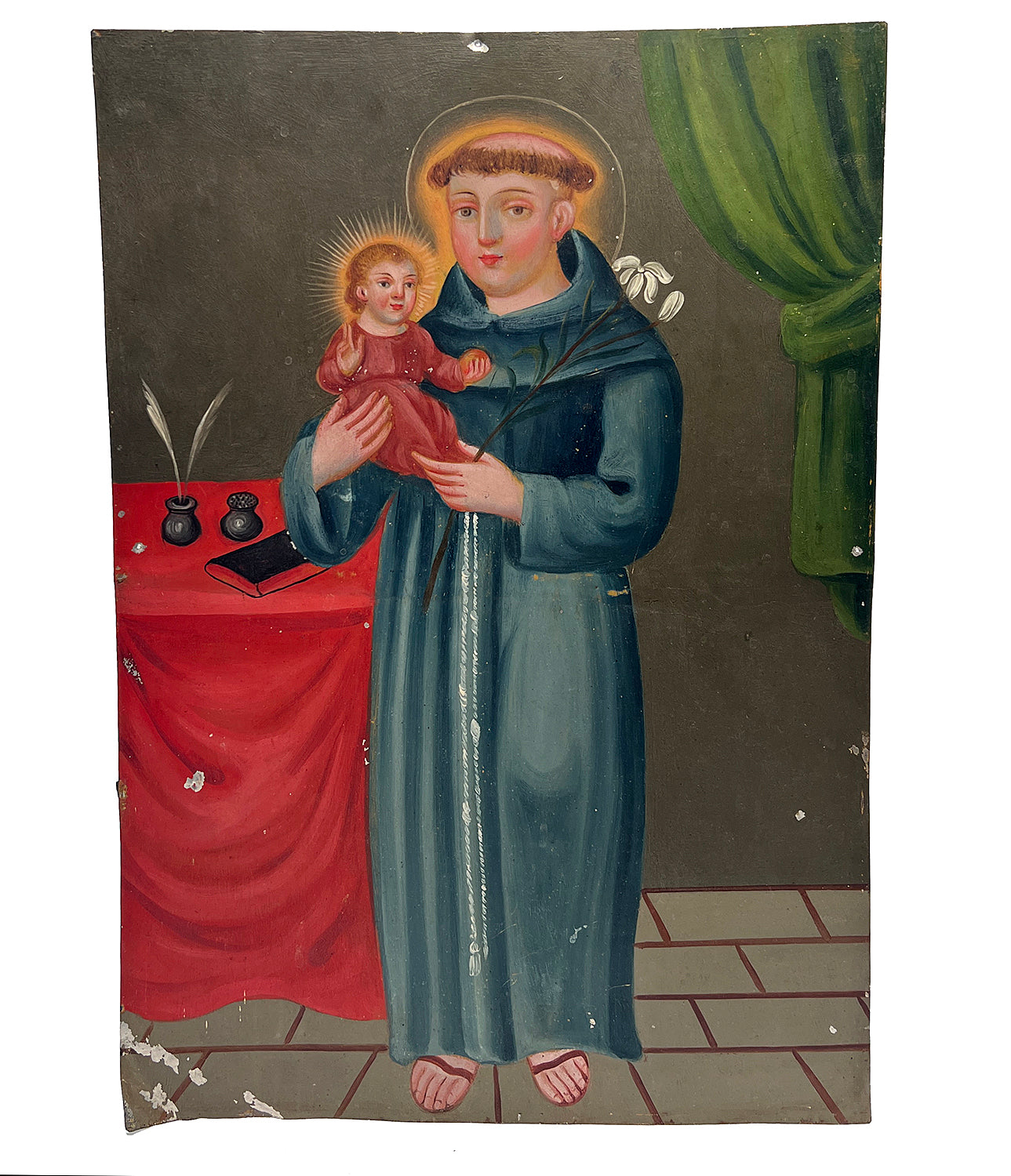 A large and impressive 19th century Saint Anthony folk retablo from Mexico. San Antonio de Padua is the patron saint of lost items, the poor, travelers, sailors and expectant mothers.