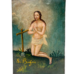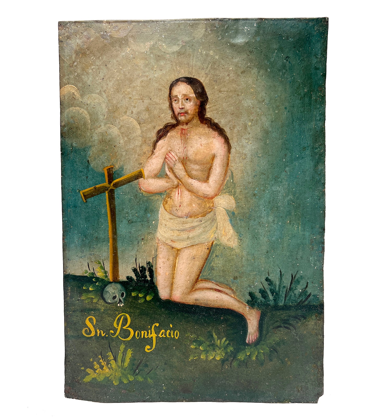 This rare 19th century Mexican folk retablo represents the Martyrdom of Saint Boniface, executed by armed pagan troops on a missionary expedition near the fortified Dutch city of Dokkum. Saint Boniface is celebrated as a great missionary, credited as one of the great European unifiers, and is also said to have been the inventor of the Christmas tree.