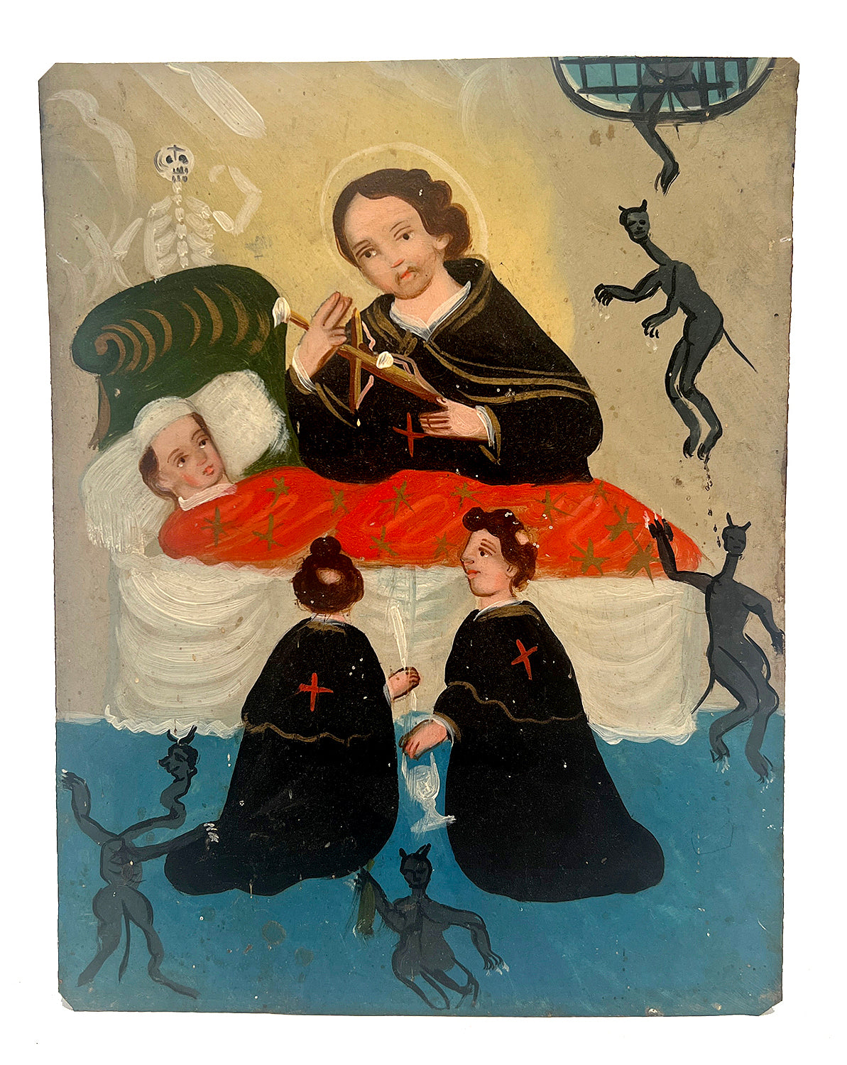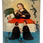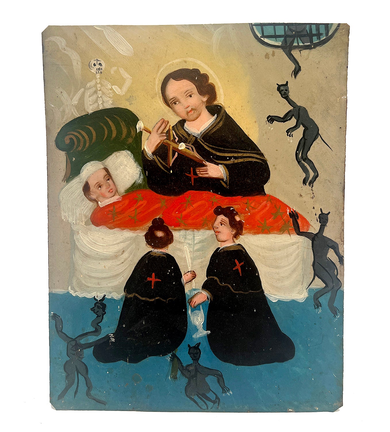 This 19th century Mexican folk retablo represents San Camilo de Lelis, also known as the Red Cross Saint. San Camilo is the patron saint of sick and dyeing people. In retablo art he is usually depicted as he is here, ministering to an invalid patient at the hour of death.