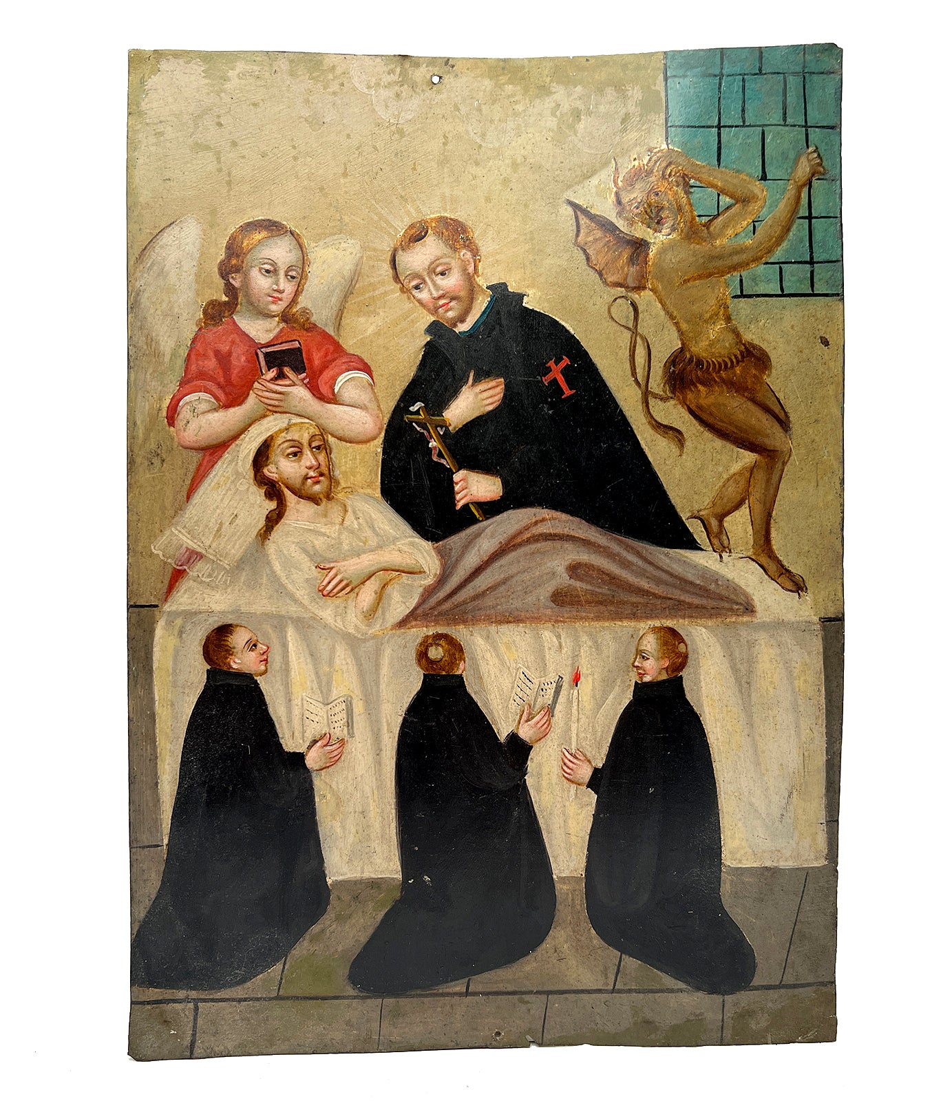 This 19th century Mexican folk retablo represents San Camilo de Lelis, also known as the Red Cross Saint. San Camilo is the patron saint of sick and dyeing people. In retablo art he is usually depicted as he is here, ministering to an invalid at the hour of death while angels and imps compete for the dyeing man's departing soul.