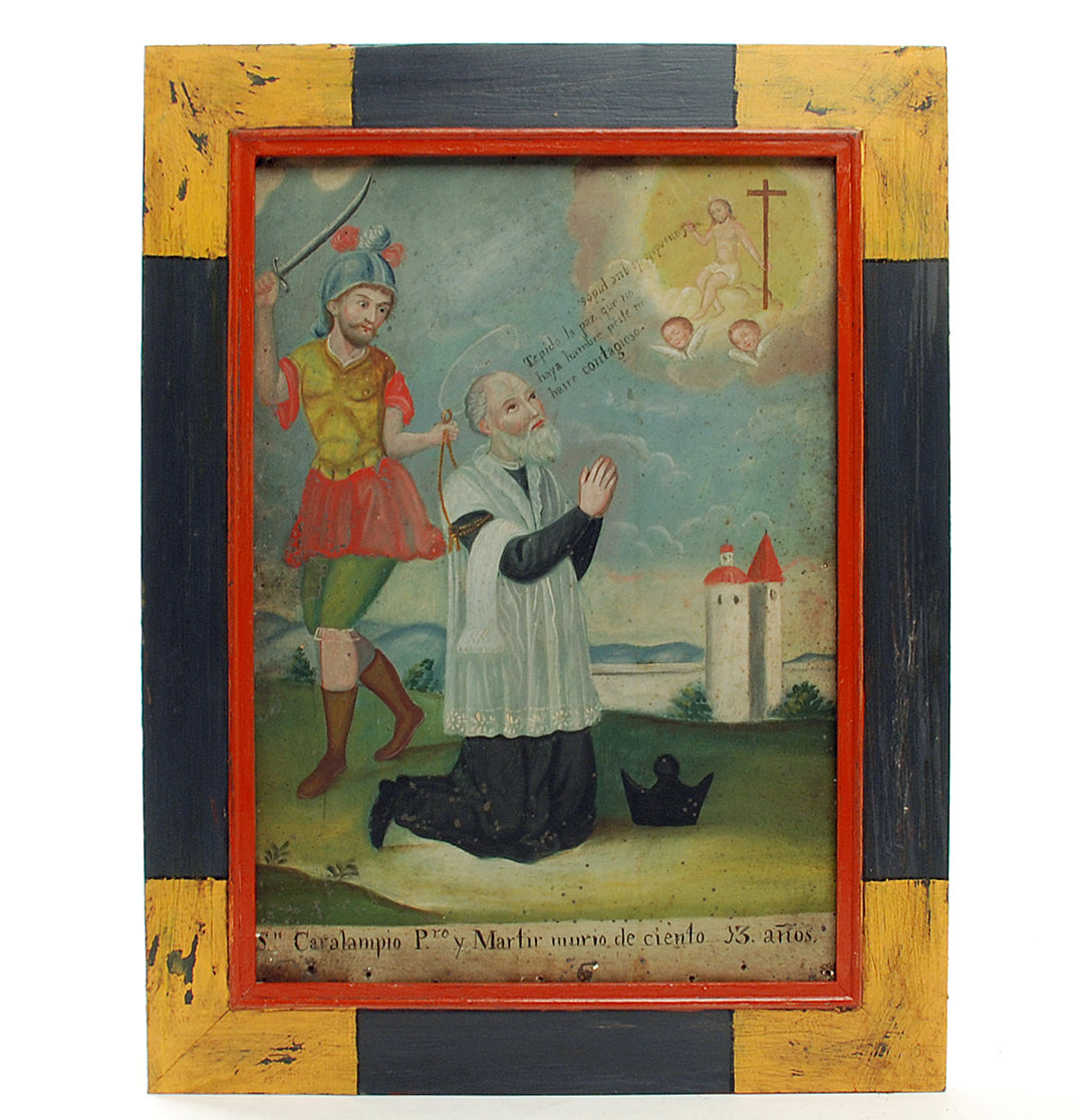This rare 19th century Mexican folk retablo represents San Caralimpio, martyred by decapitation.. According to legend, Caralimpio, a bishop in Thessaly, was arrested at the age of 113 for proselytizing the death of Christ. He is the patron saint of those who pray against pestilence as well as contagious airs and hungers.