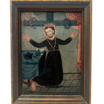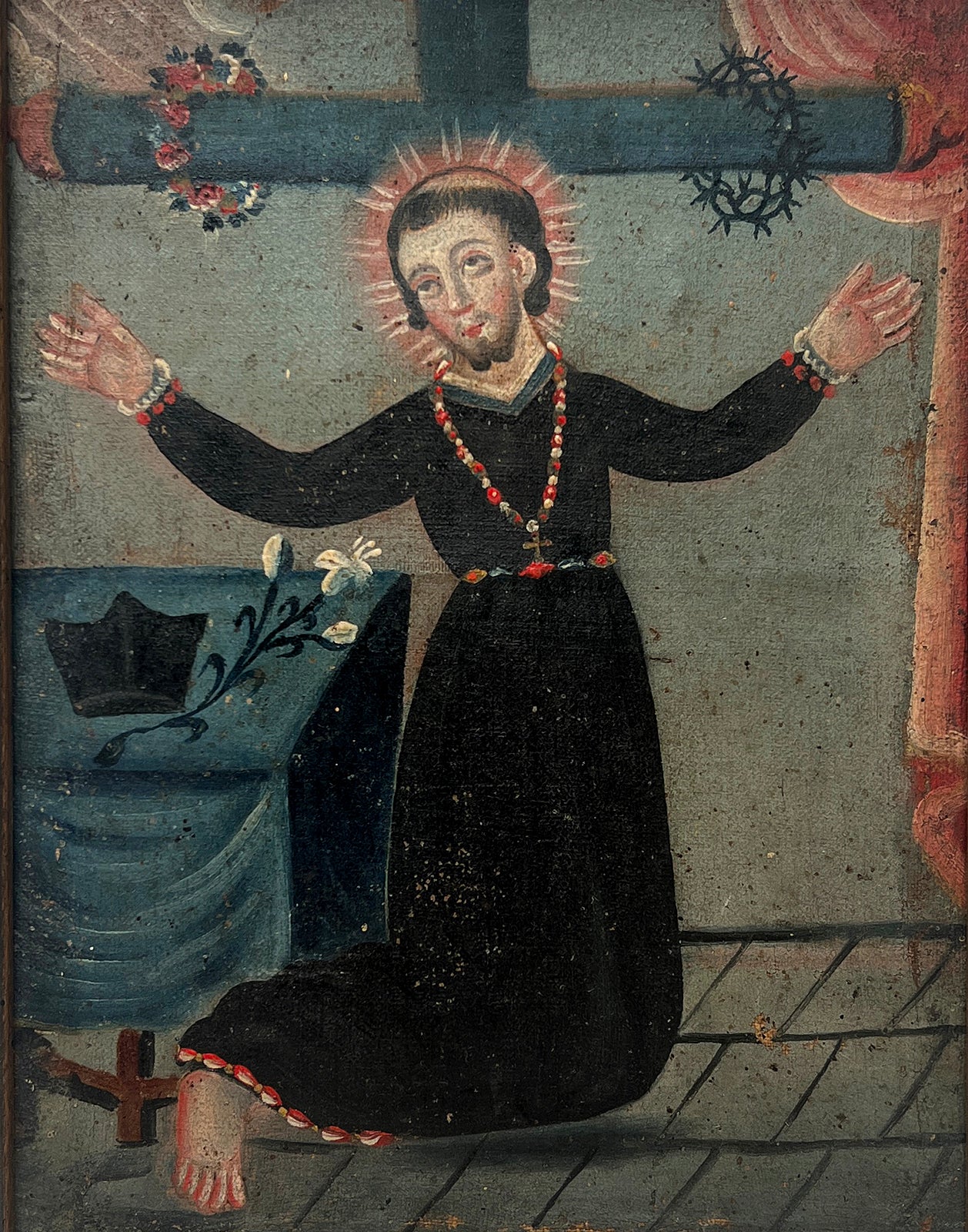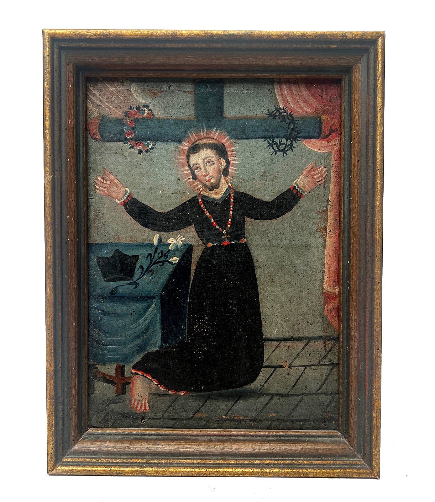 This rare 19th century oil on canvas painting represents San Cayetano, the patron saint of gamblers. San Cayetano is venerated in Mexico to bring money and luck for gamblers. His heavily ornamented chain and belt are a reference to his rejection of wealth. Circa 1850.
