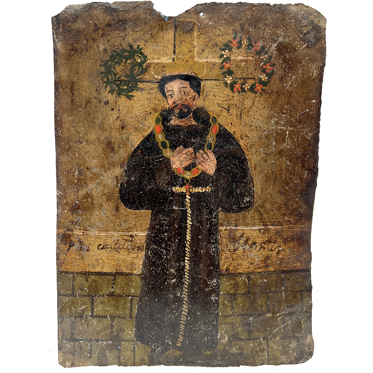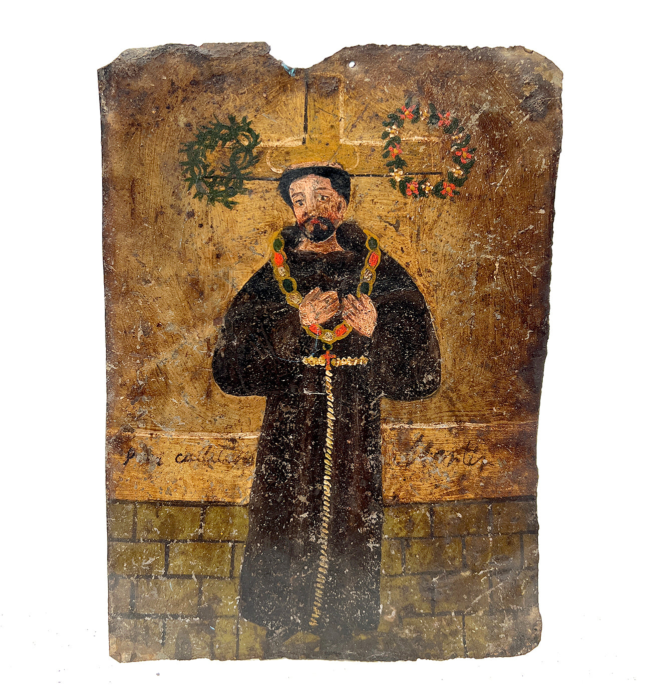 This 19th century oil on tin retablo painting from Mexico represents San Cayetano, the patron saint of gamblers. San Cayetano is venerated in Mexico to bring money and luck for gamblers. His heavily ornamented chain and belt are a reference to his rejection of wealth. Circa 1880.