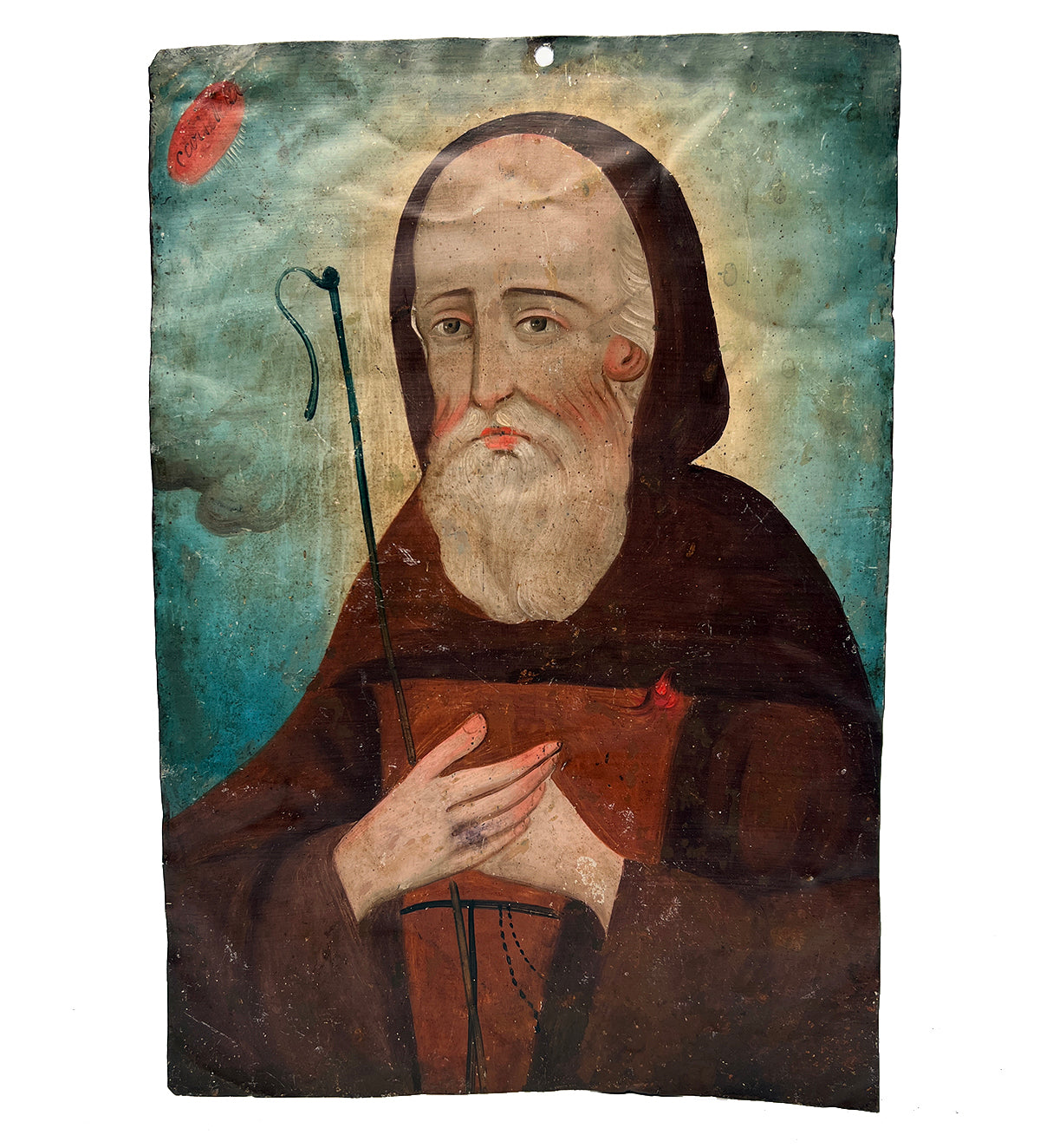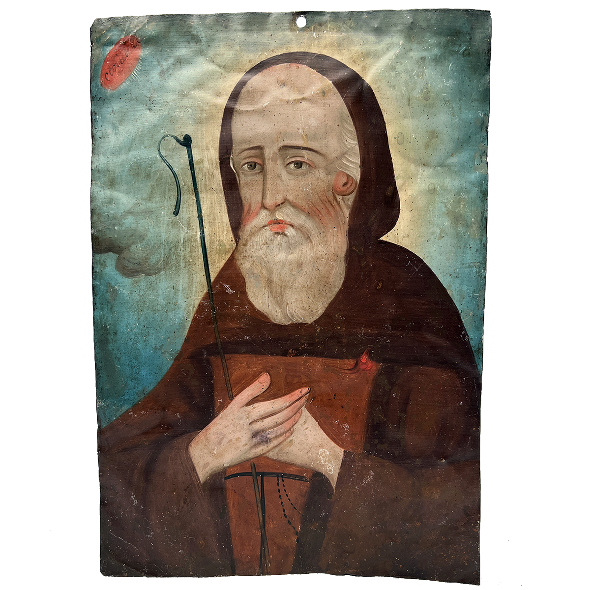 This late 19th century folk retablo from Mexico represents San Francisco de Paula, patron saint of fires and plagues. Oil on tin. Circa 1880.