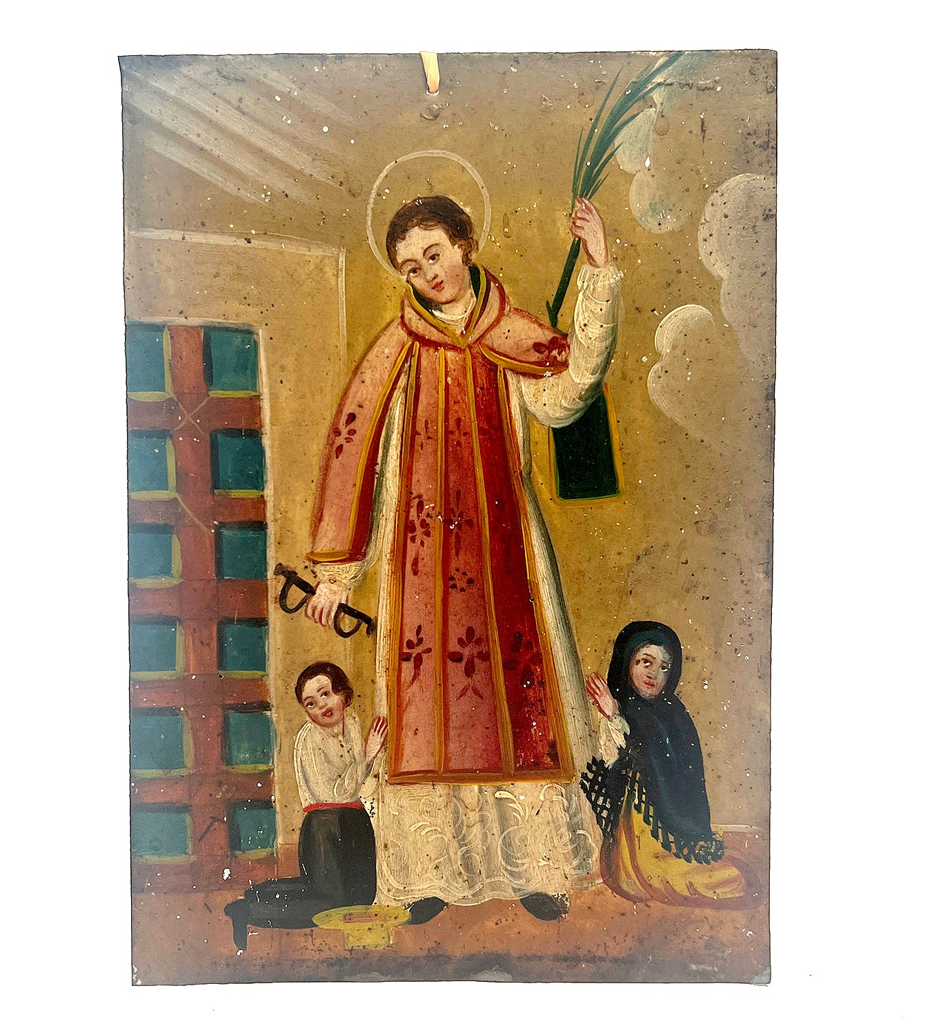 A 19th century Mexican folk retablo - San Leonardo. Saint Leonard of Noblac became one of the most venerated saints of the late Middle Ages. His intercession was credited with miracles for the release of prisoners, women in labour and the diseases of cattle. He is the patron saint of political prisoners, imprisoned people, prisoners of war, women in labour, as well as horses.