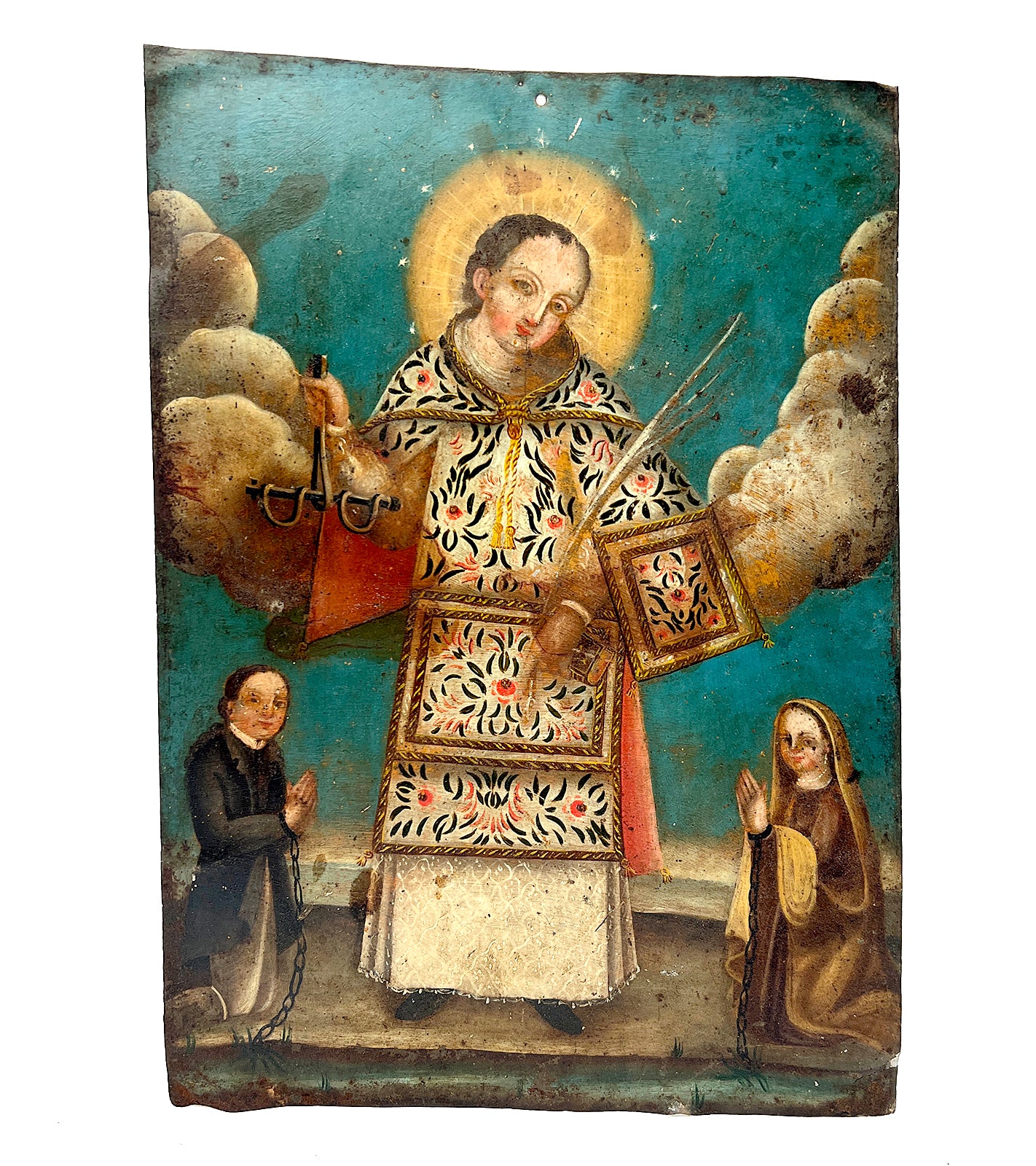 This rare 19th century folk retablo represents San Leonardo, the patron saint of prisoners, captives, and women in labor. He is also considered a patron for professions like coopers, blacksmiths, and farmers, as well as for those against robbery and burglary. The patronage is largely due to legends of his intercession for prisoners and his miraculous work in aiding a queen during childbirth.