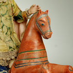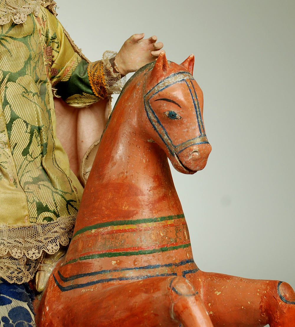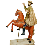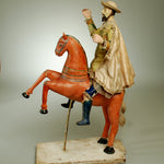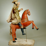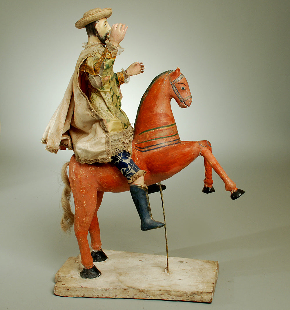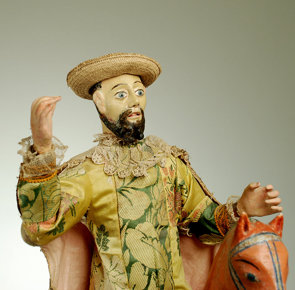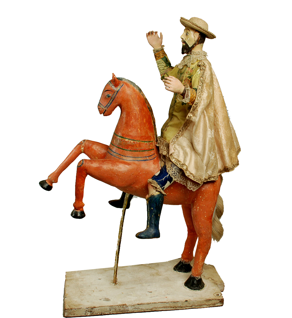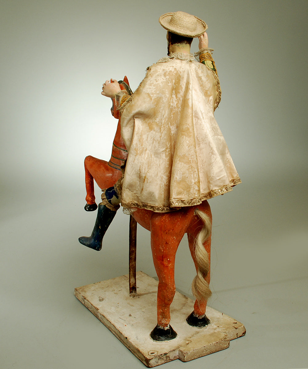 A large 19th century hand carved and polychrome painted figural santo of San Martin de Tours with original hand caned hat and silk cloak. Bolivia. Circa 1875.
