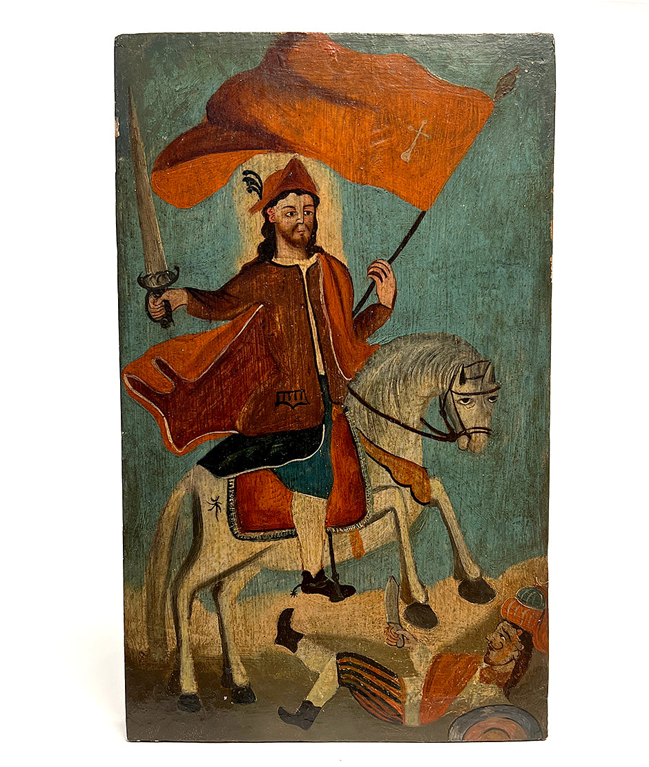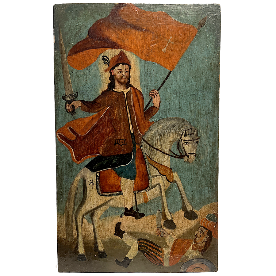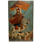 A superb 19th century folk retablo from Mexico - Santiago Matamoros. Oil on wooden tablet. Circa 1875.